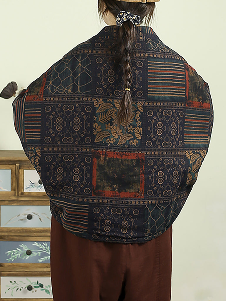Casaco feminino de algodão acolchoado com decote em V e flores vintage de outono