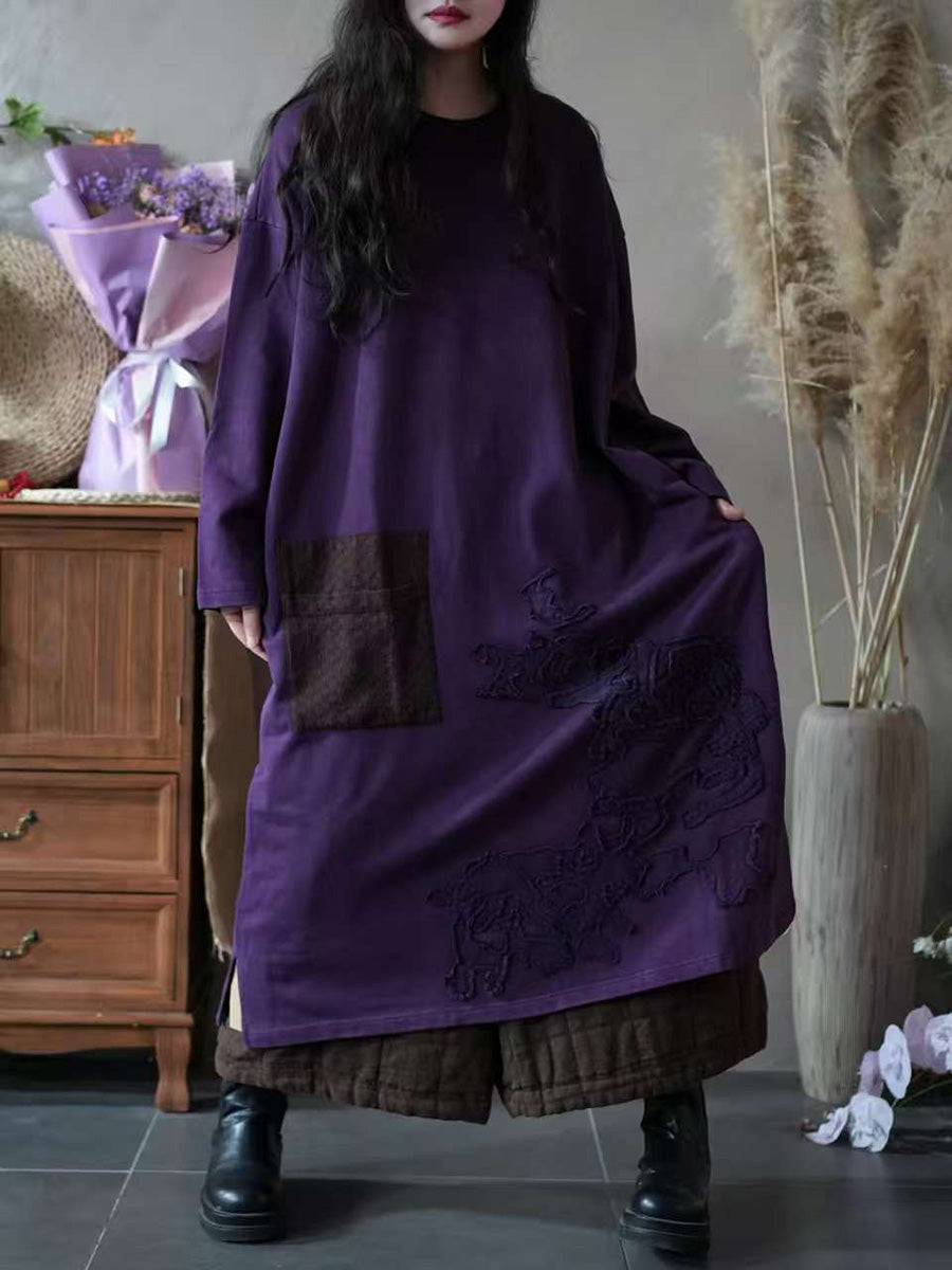 Vestido feminino vintage de outono com decote redondo e aplicações.