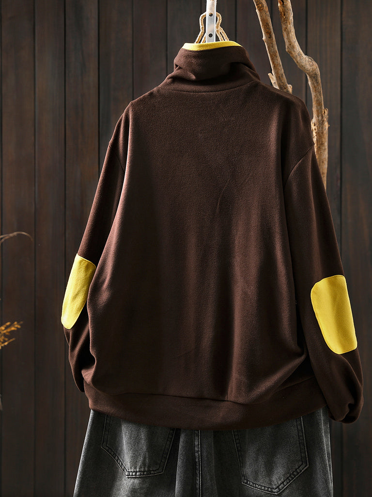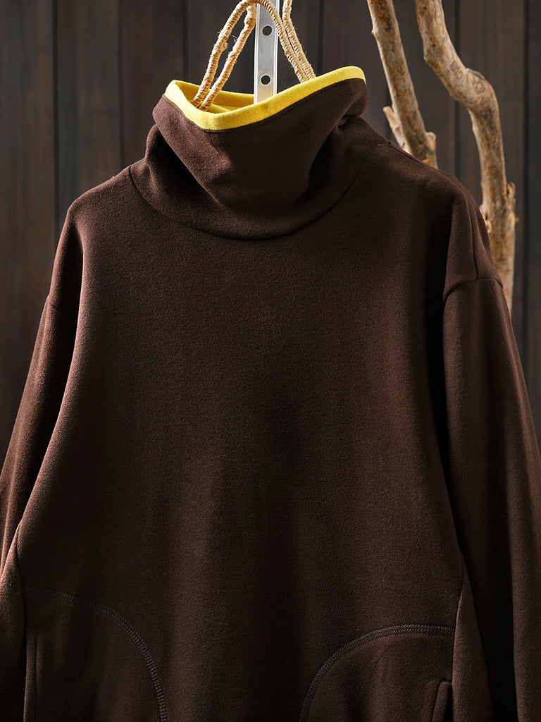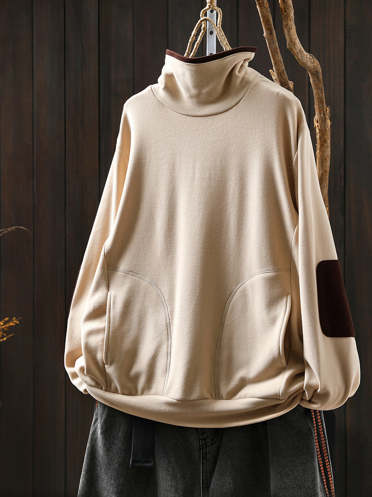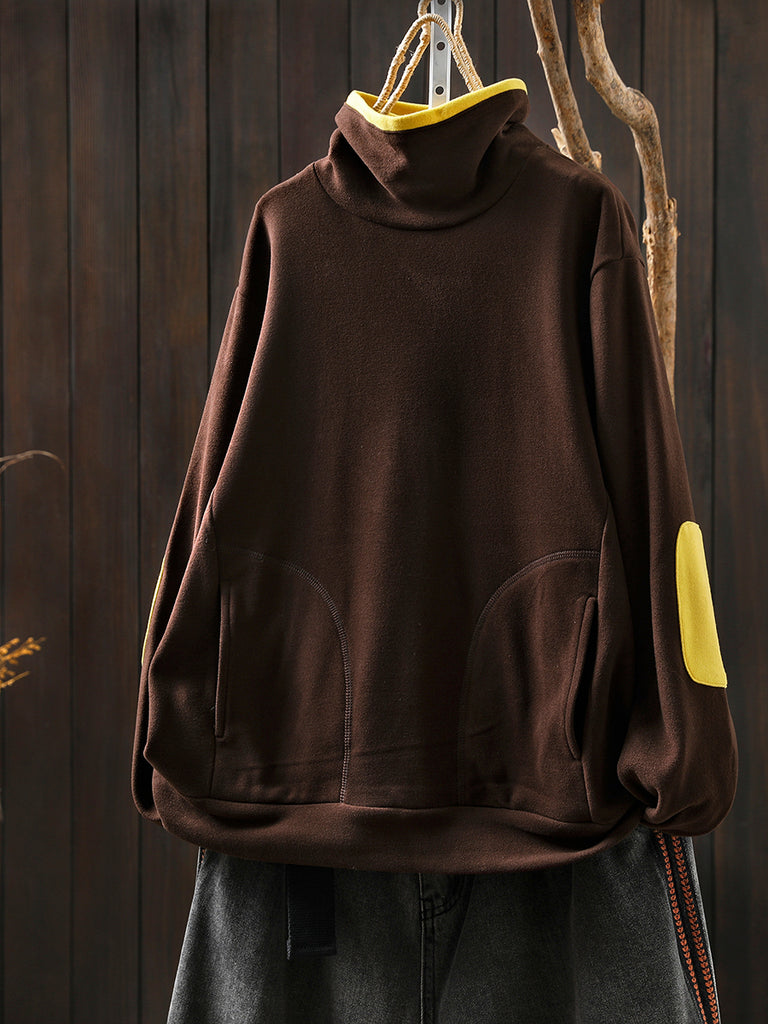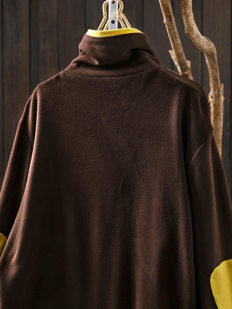 Blusa feminina casual de gola alta em algodão com blocos de cores para o outono.