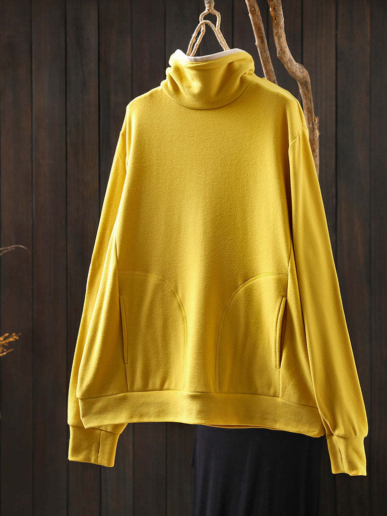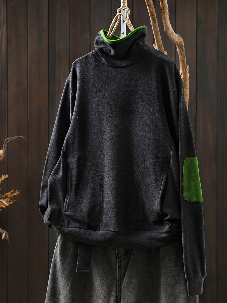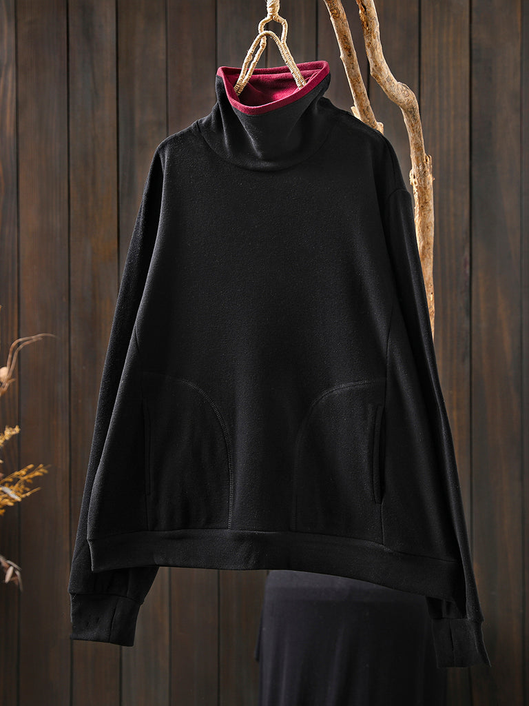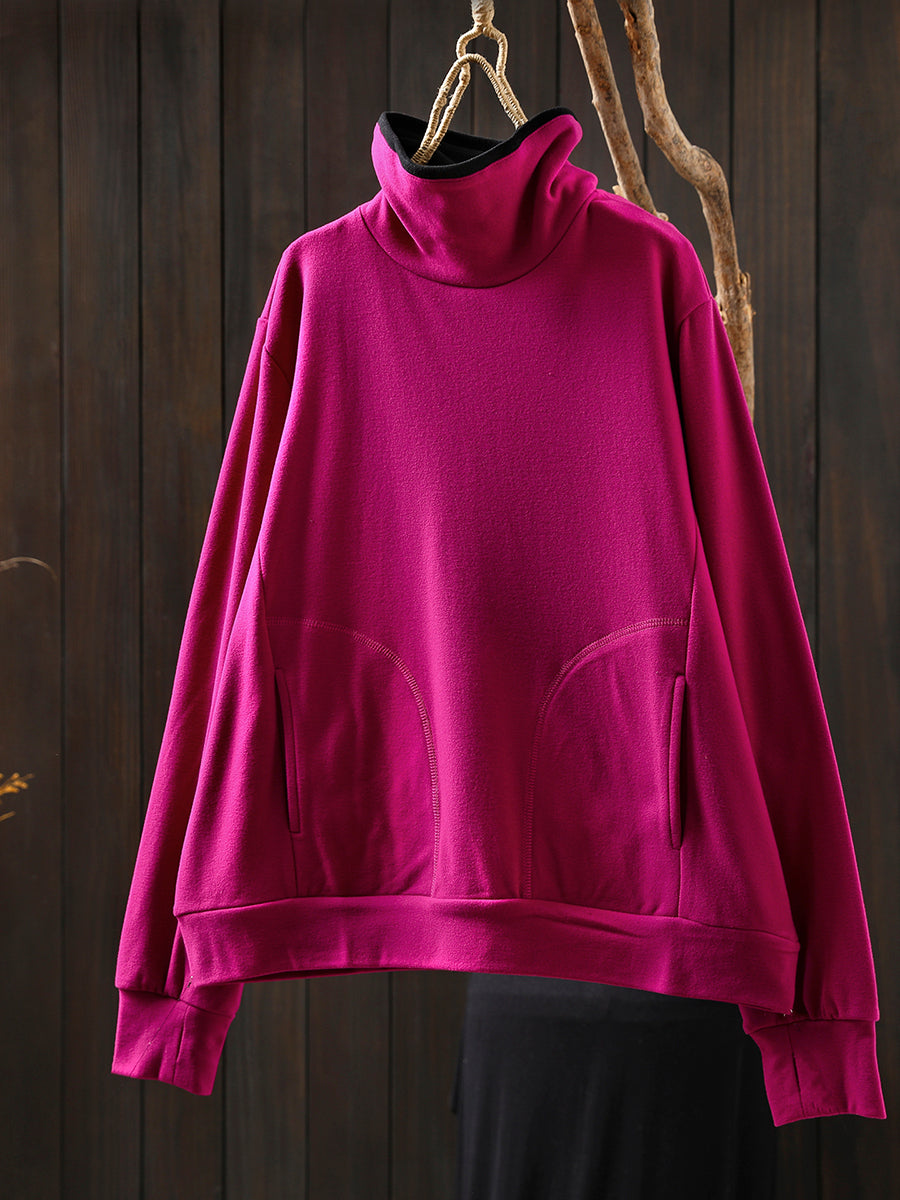 Blusa feminina casual de gola alta em algodão com blocos de cores para o outono.