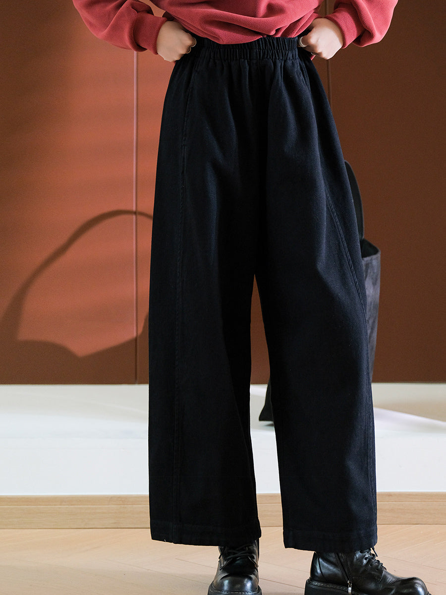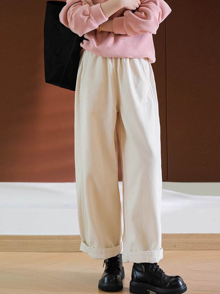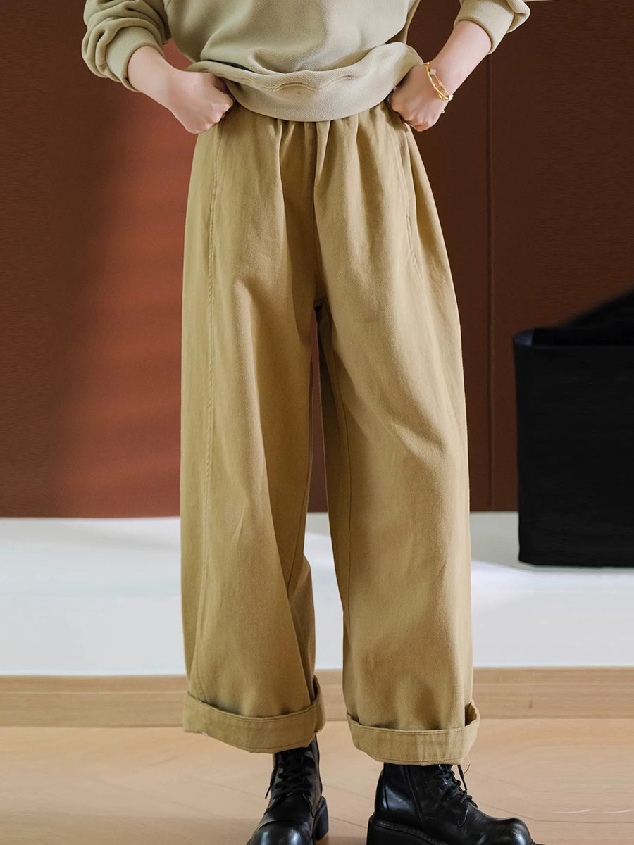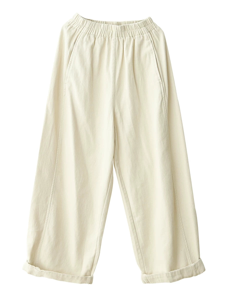 Calça feminina casual de cor lisa, 100% algodão, com pernas largas.