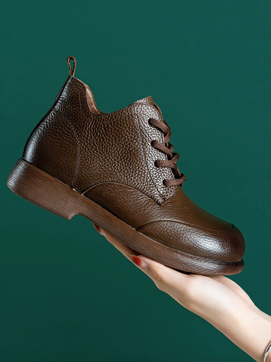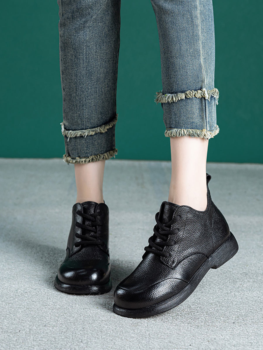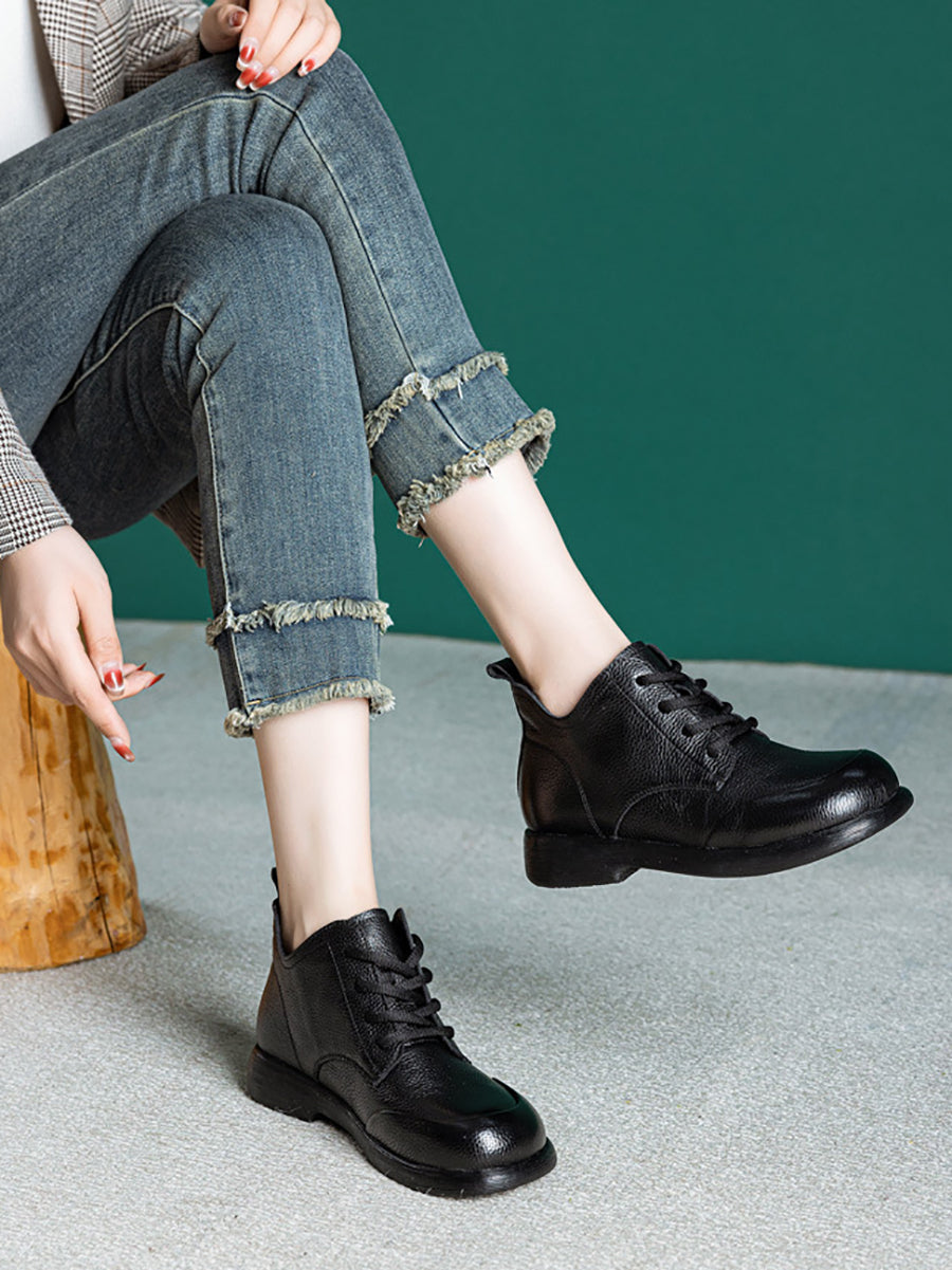 Botas de cano curto femininas casuais em couro legítimo de cor lisa