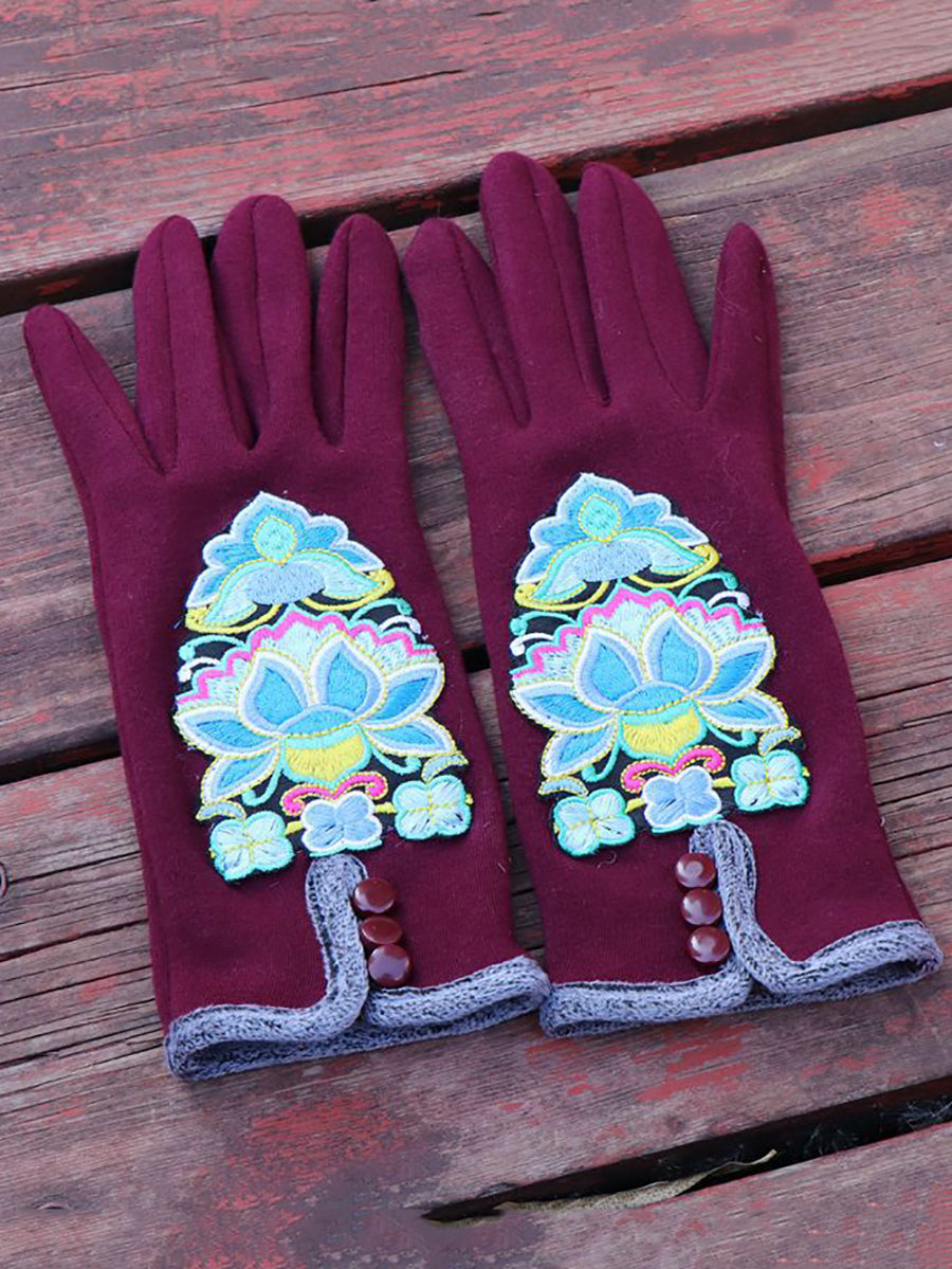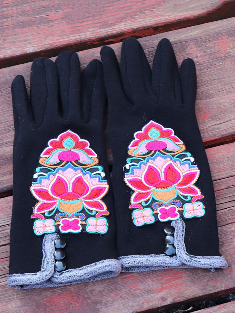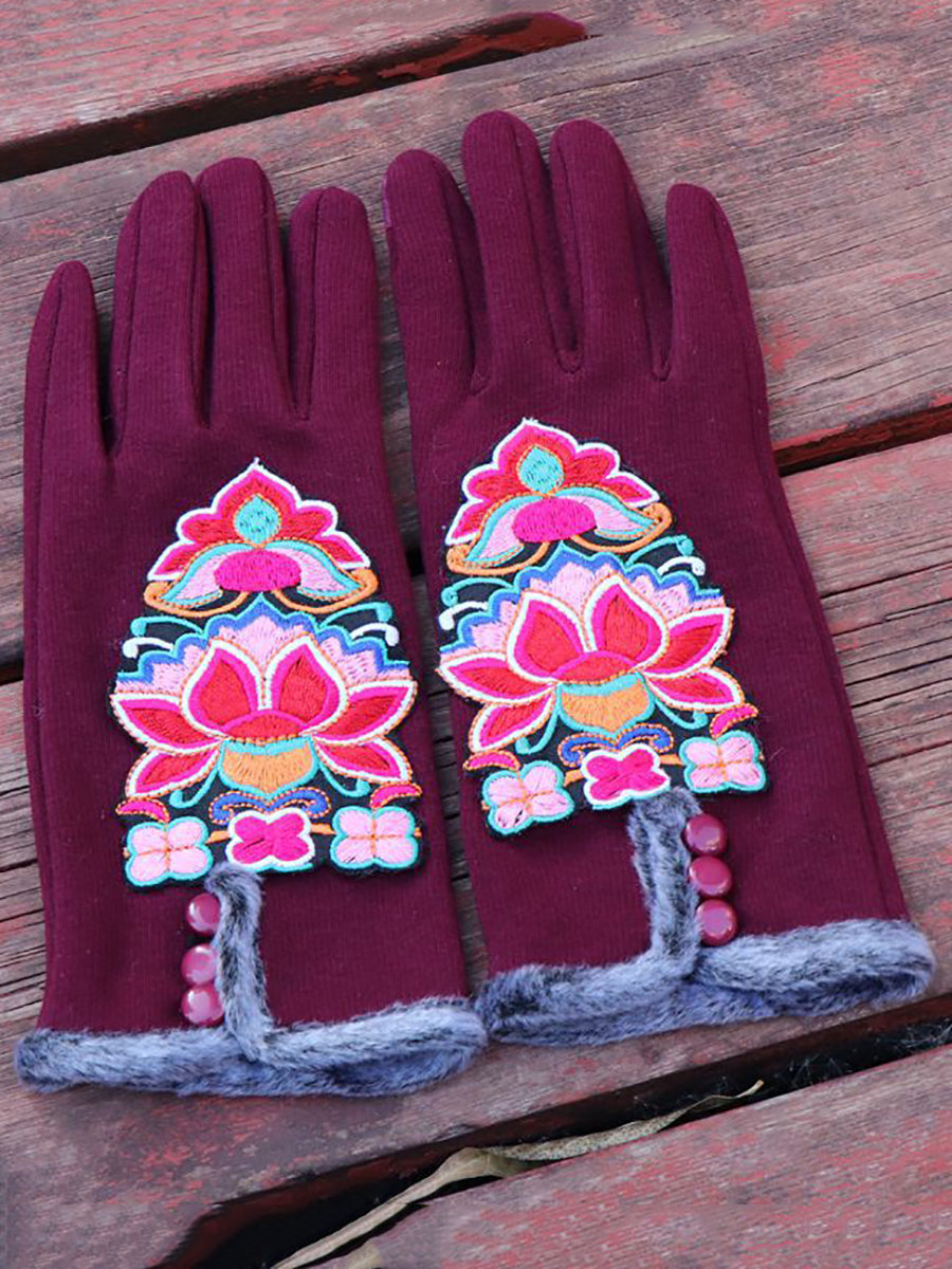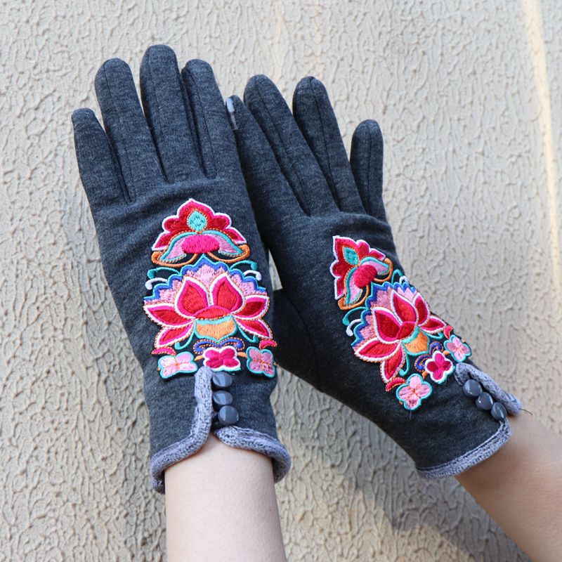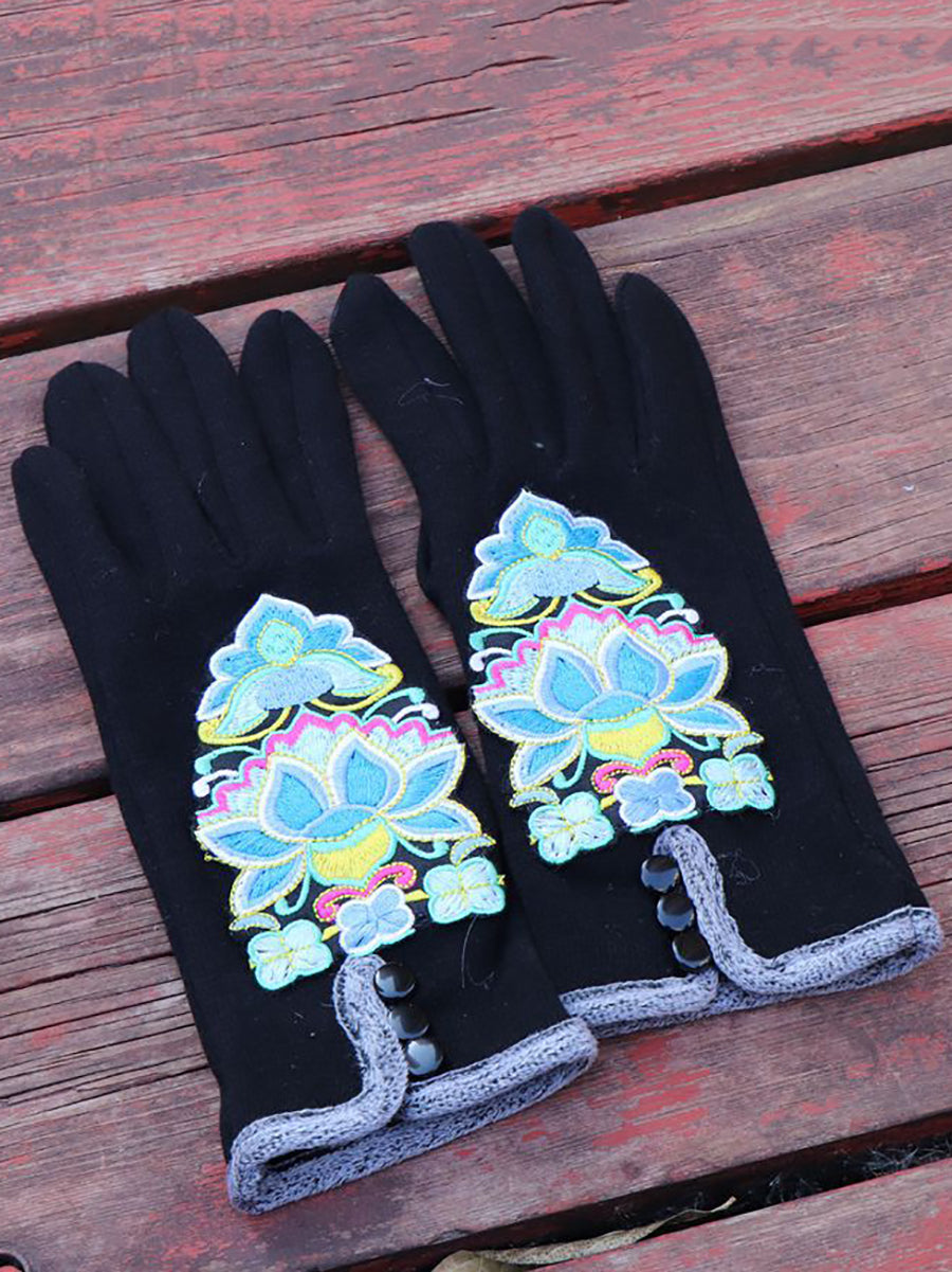 Luvas femininas étnicas de inverno com bordado e forro de lã.