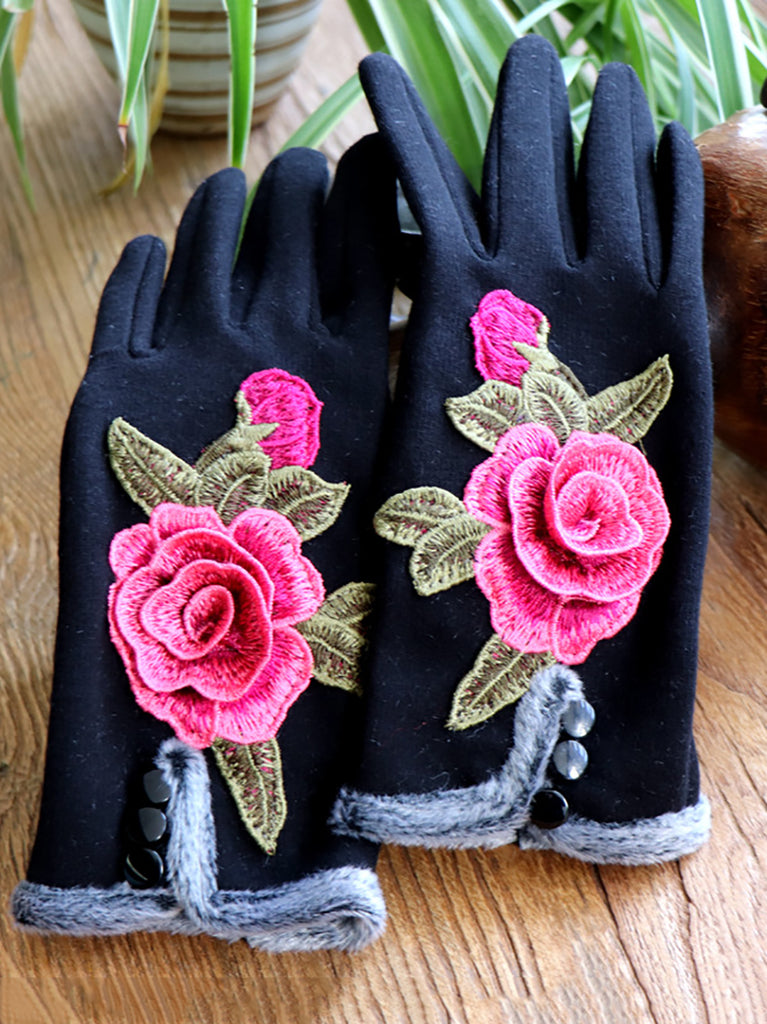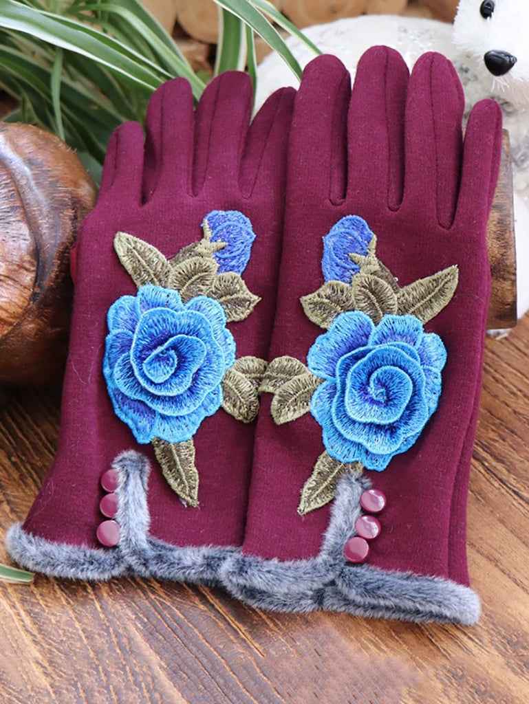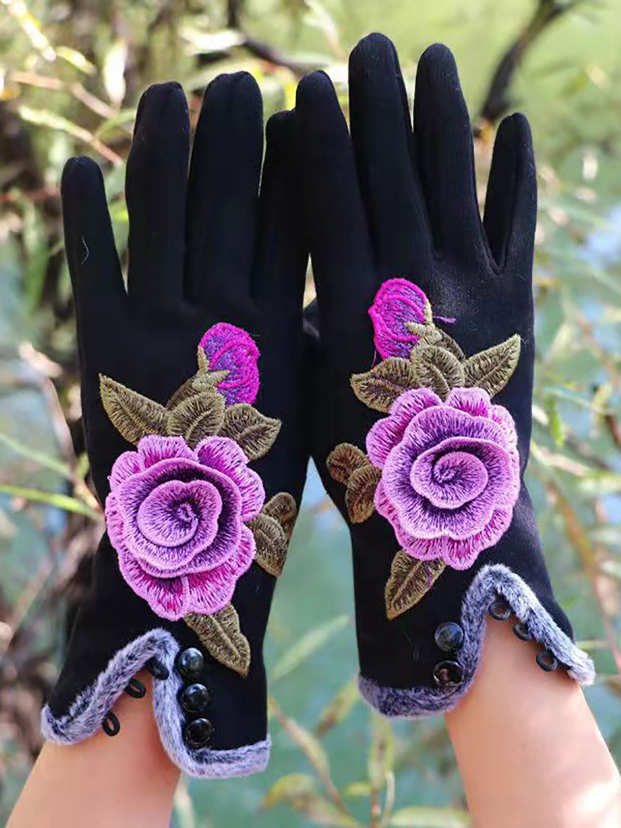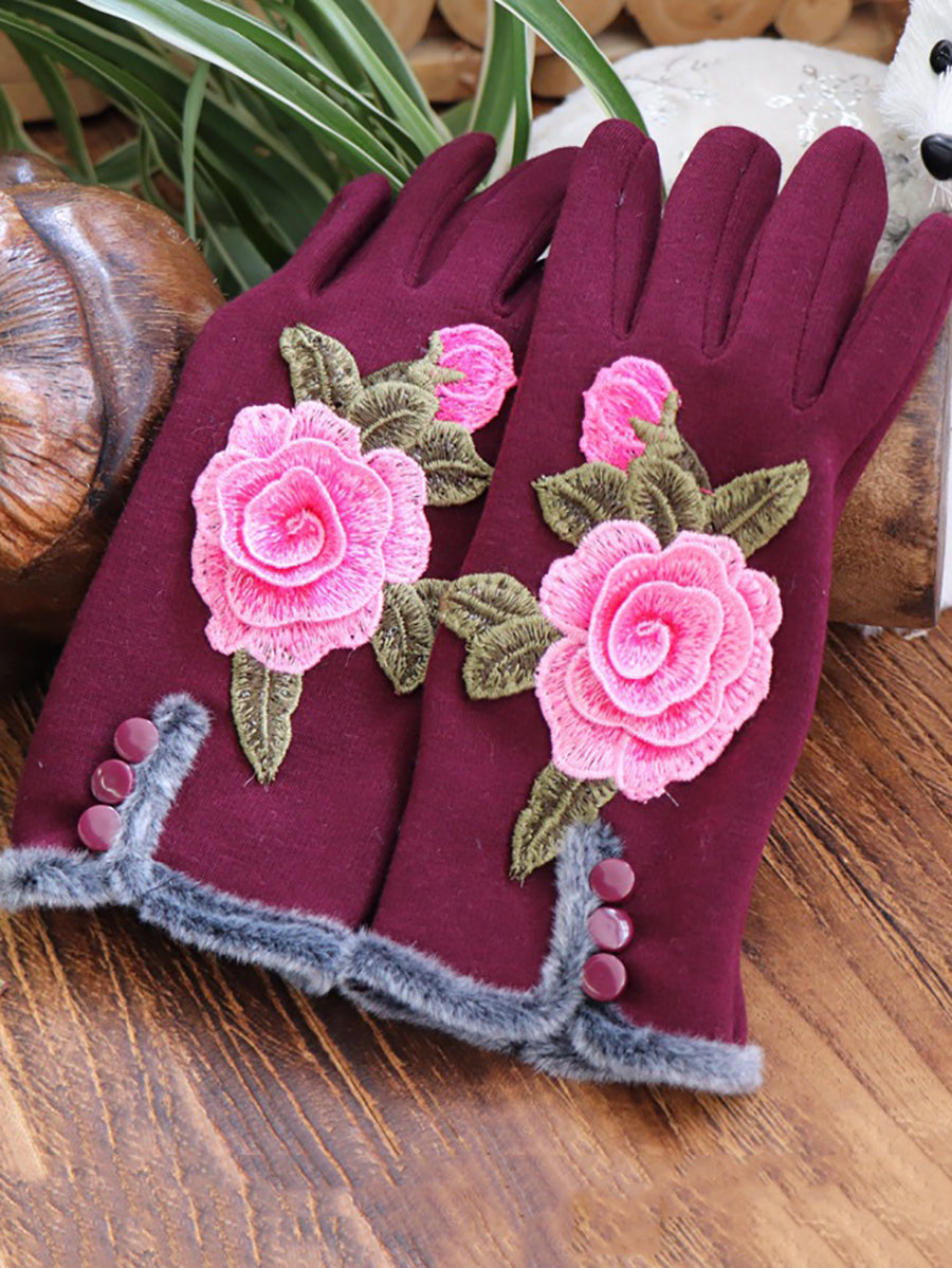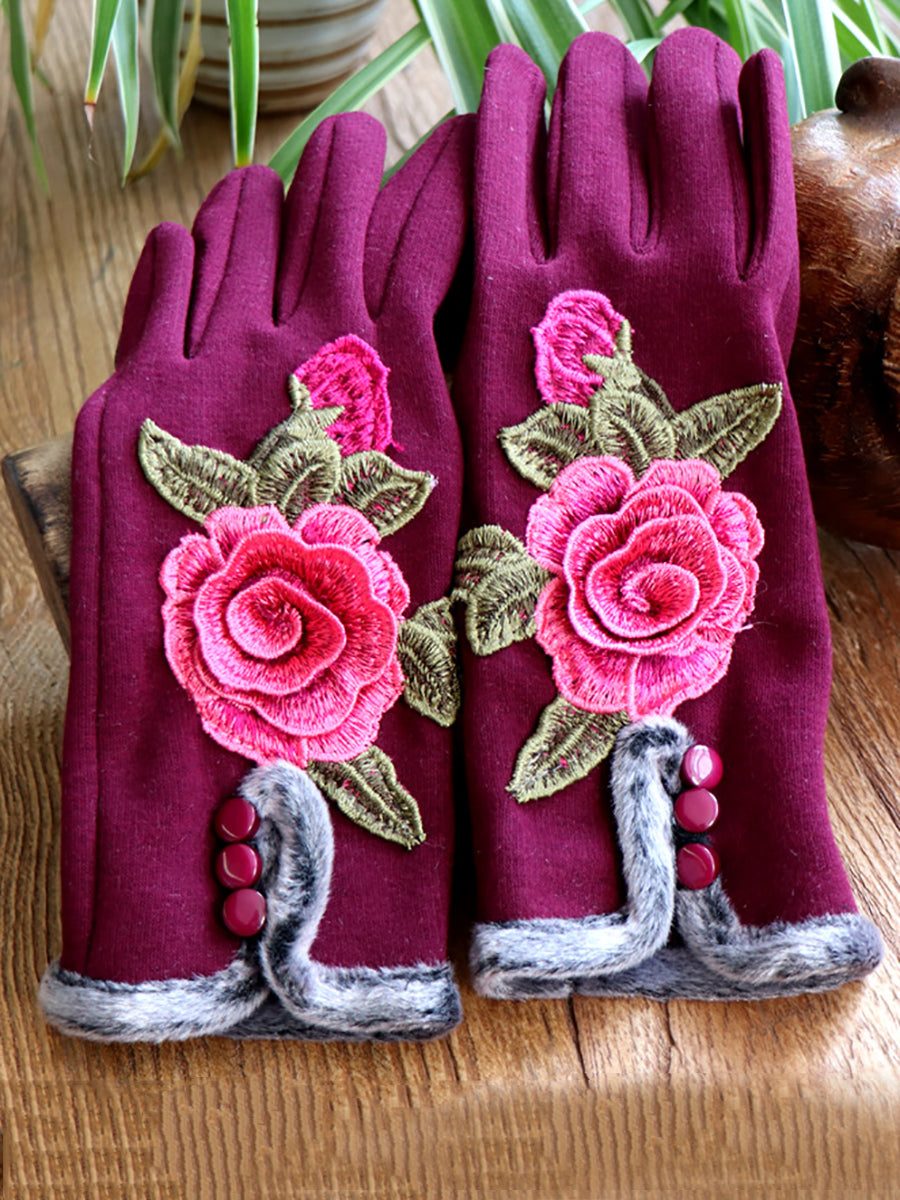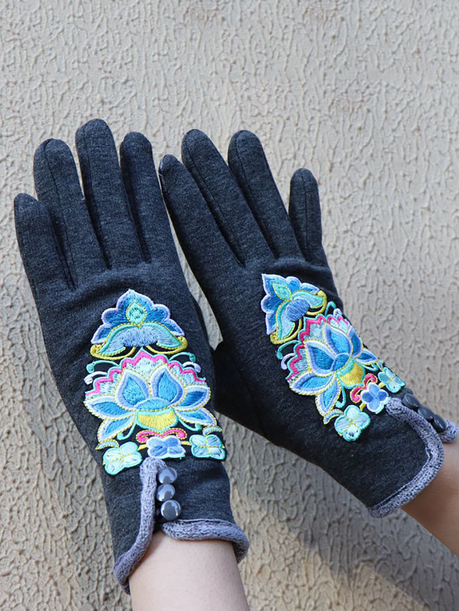 Luvas femininas étnicas de inverno com bordado e forro de lã.