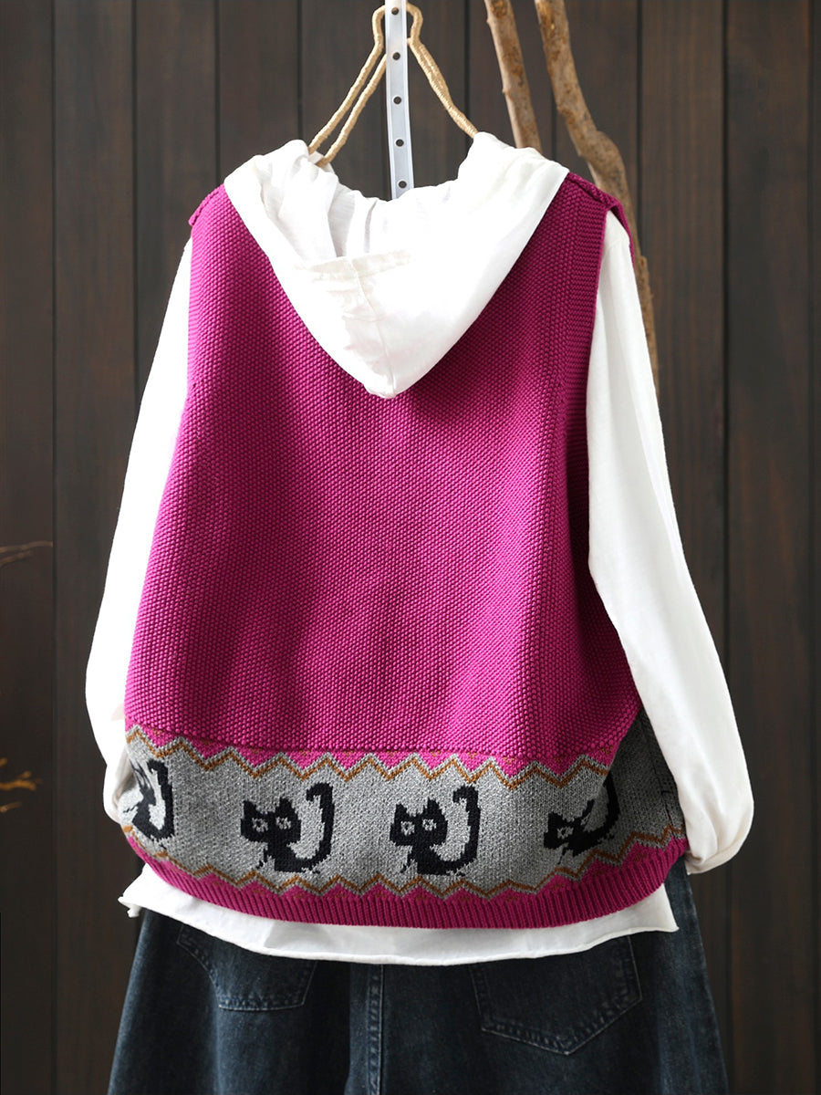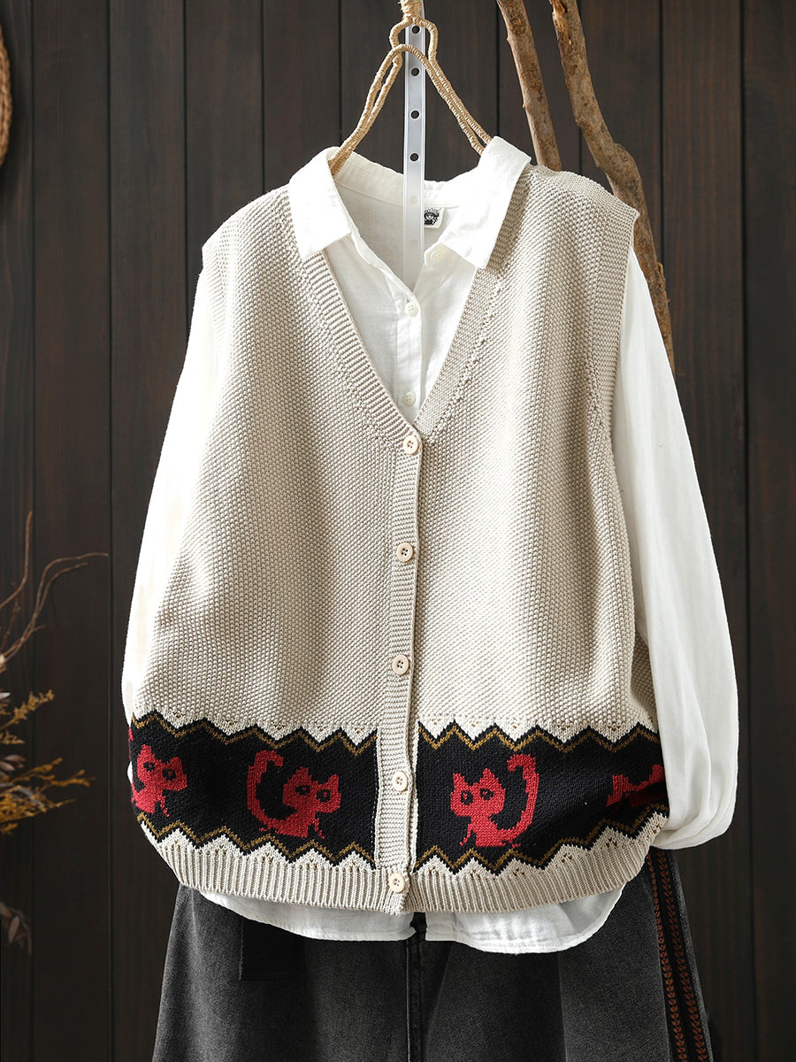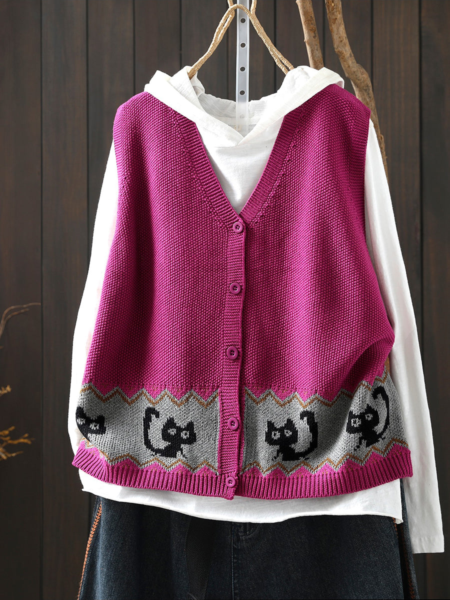Colete feminino de tricô com estampa de gato artístico para a primavera