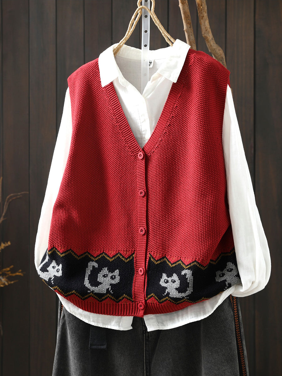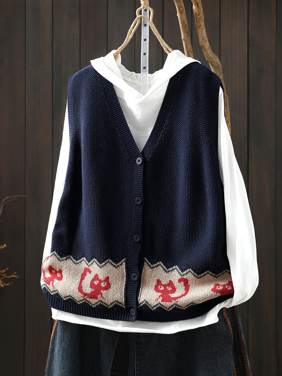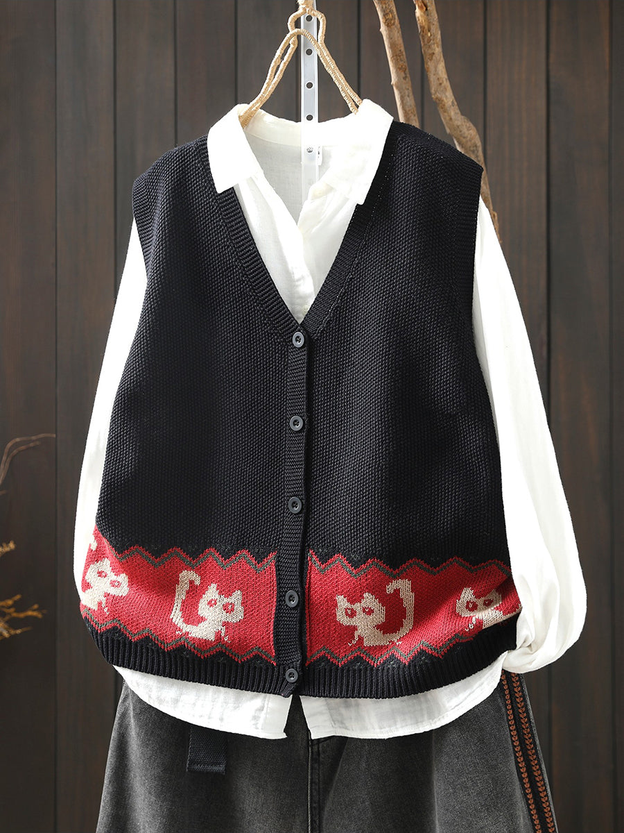 Colete feminino de tricô com estampa de gato artístico para a primavera