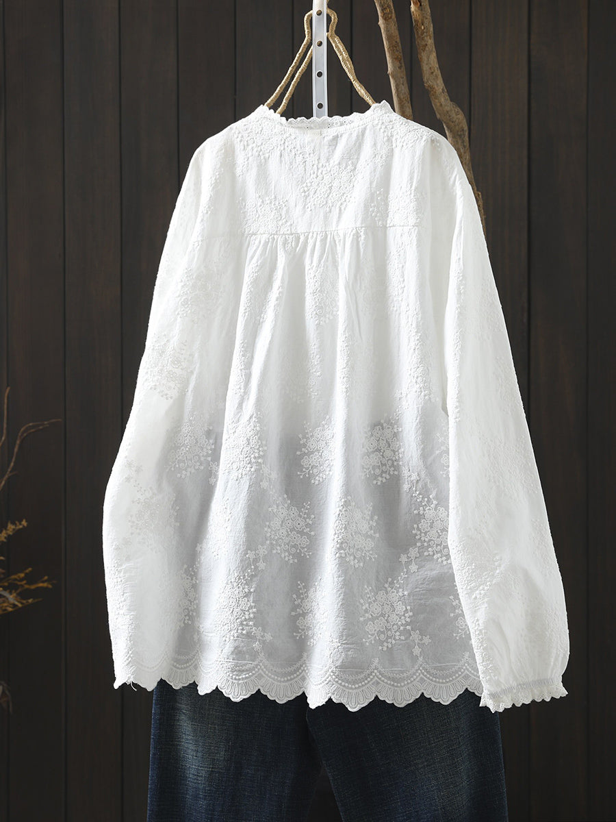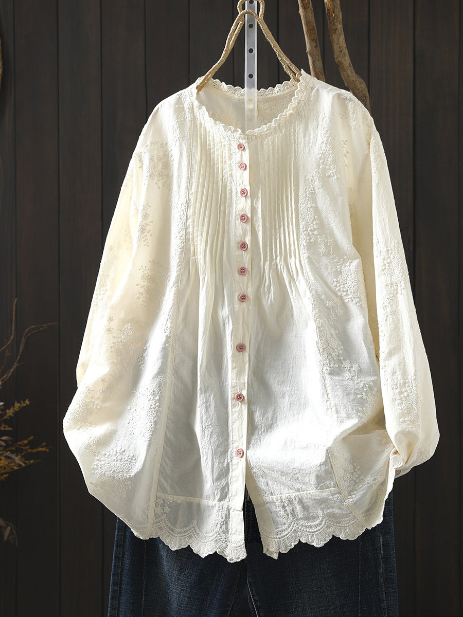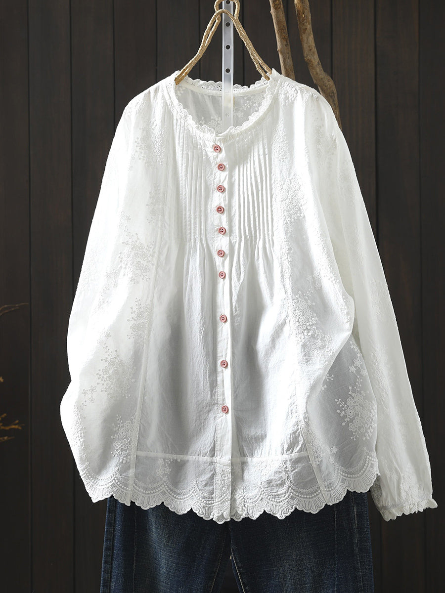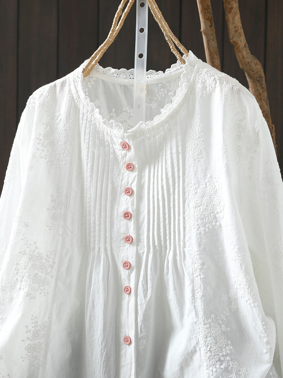 Camisa feminina de algodão 100% com bordado artístico e franzido para a primavera