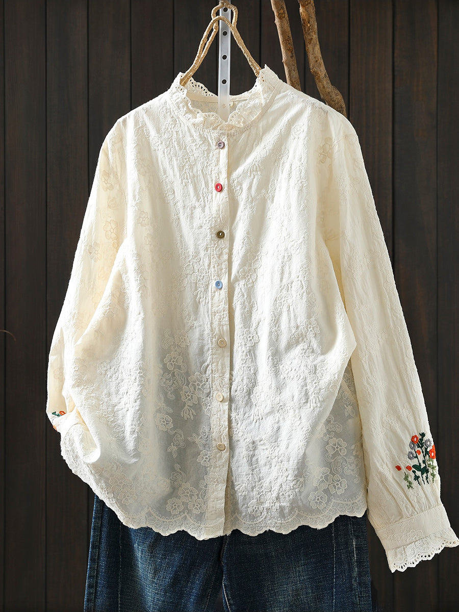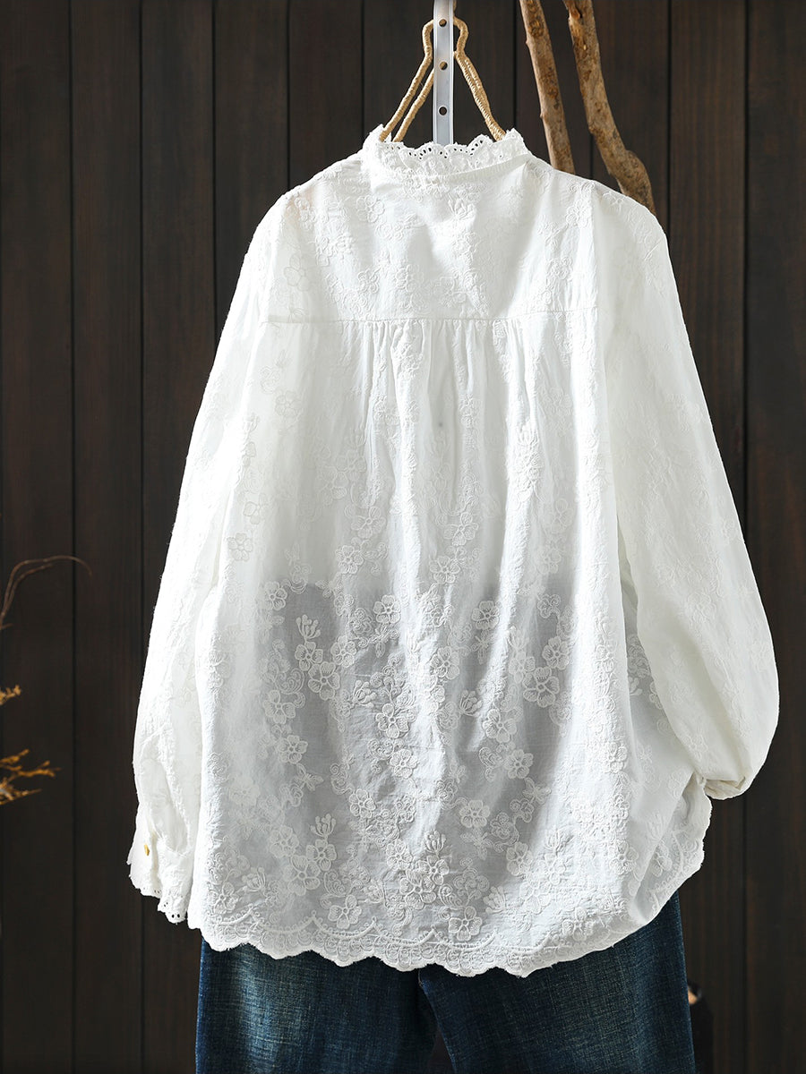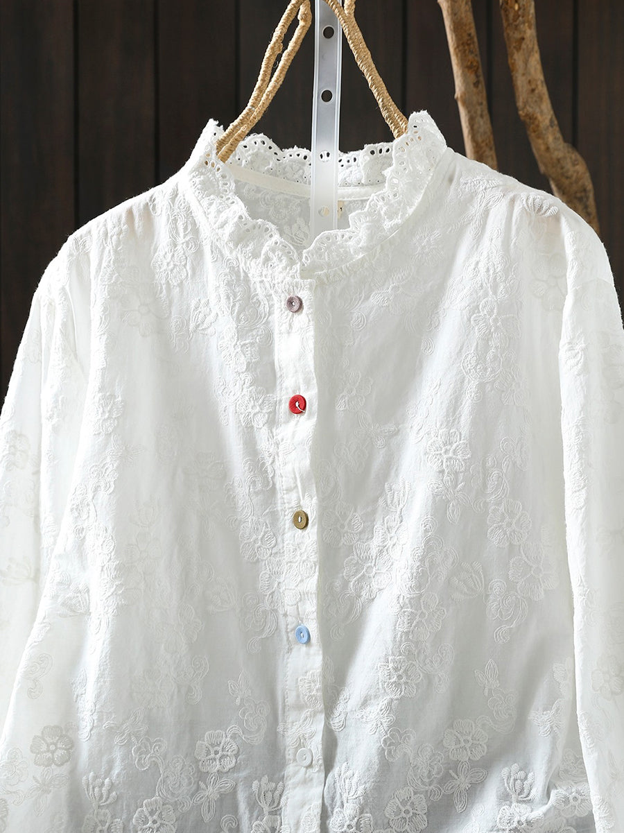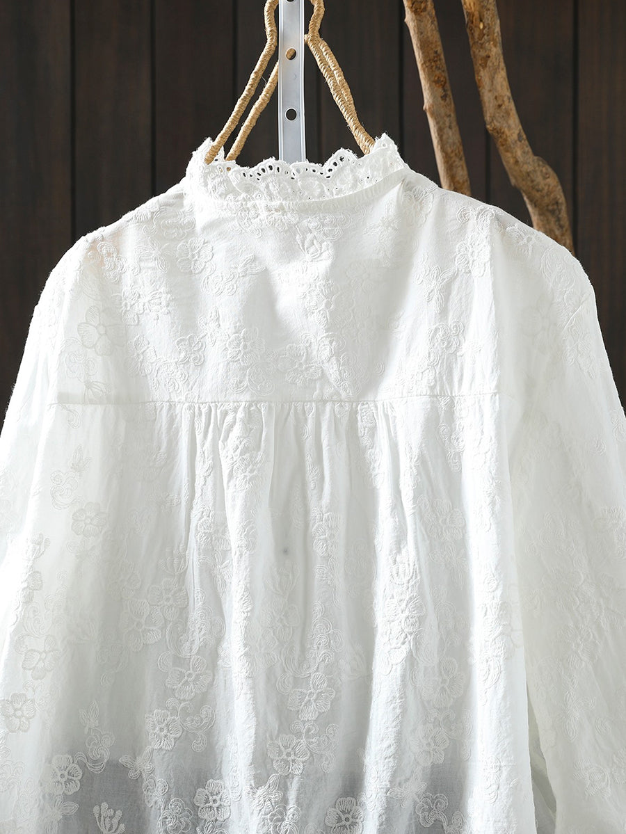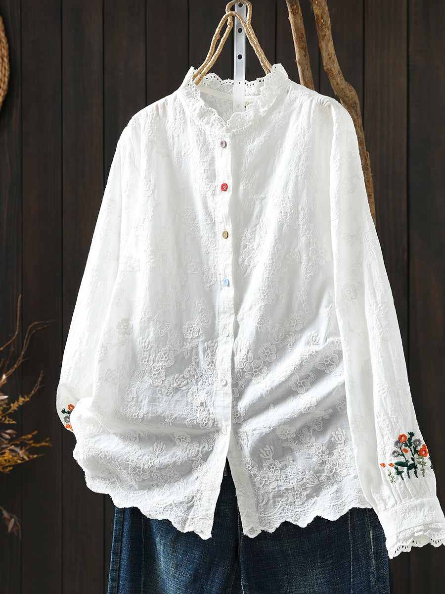 Camisa feminina de algodão 100% com bordado floral artístico para a primavera