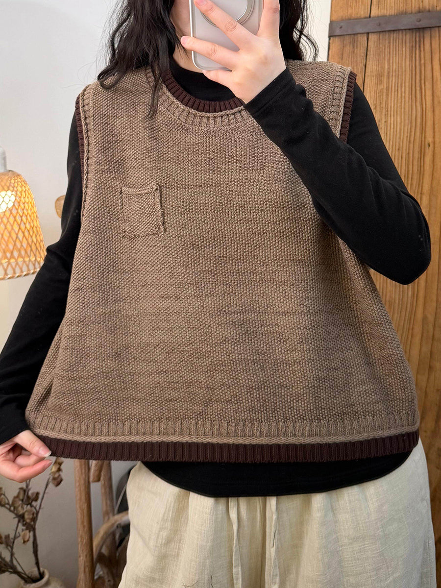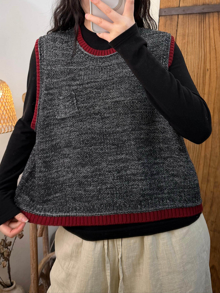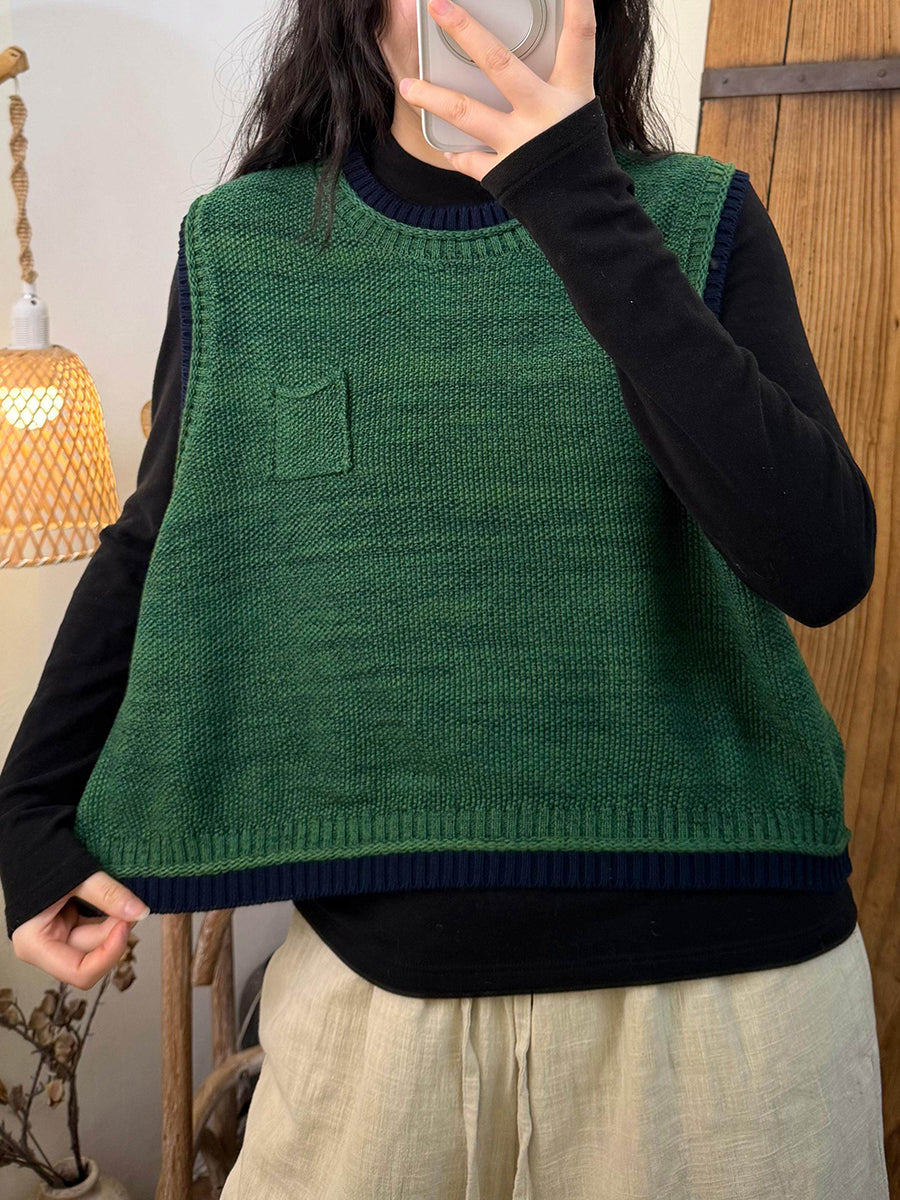 Colete feminino de tricô com decote redondo e blocos de cores, estilo artístico, para a primavera.