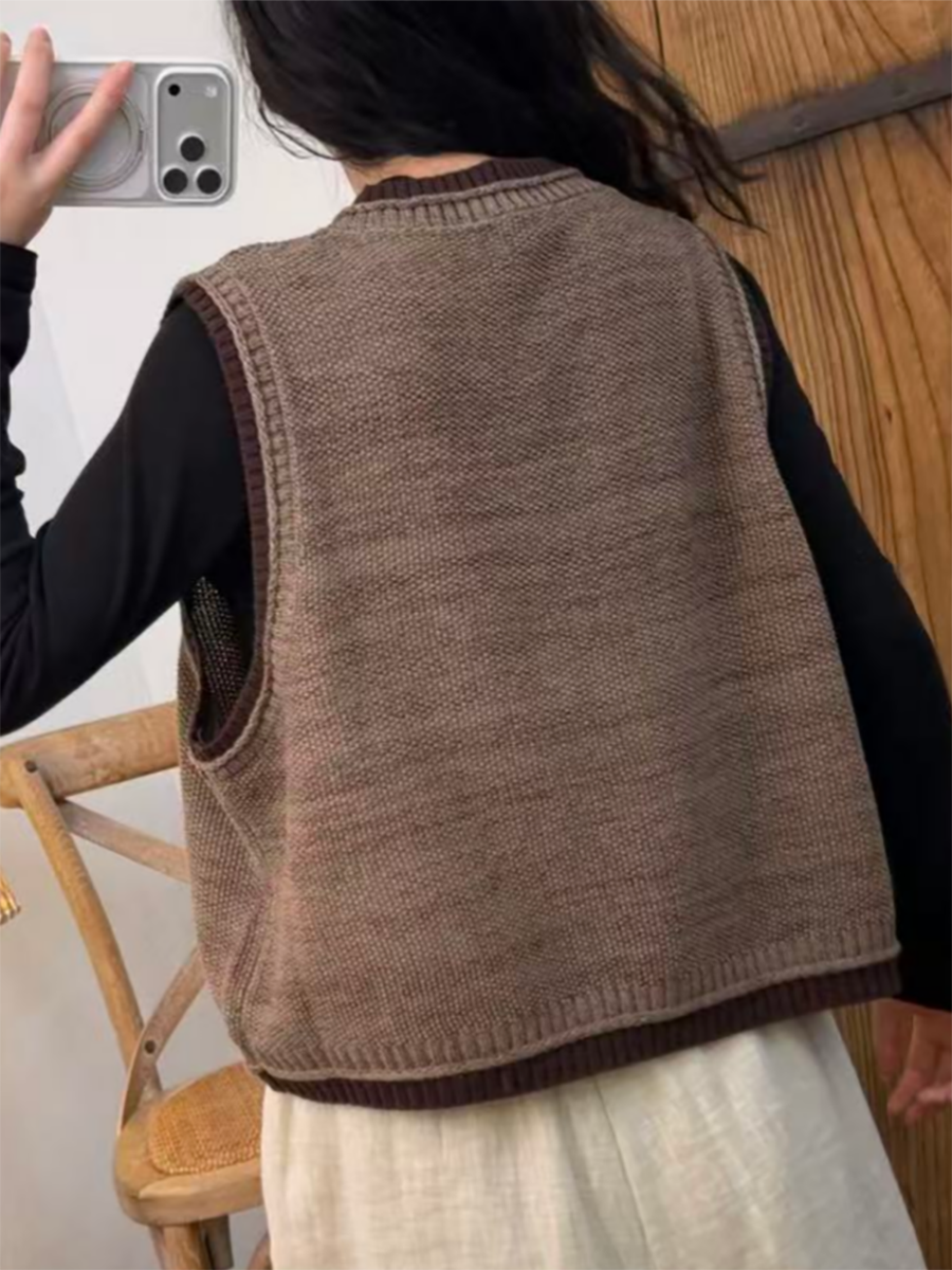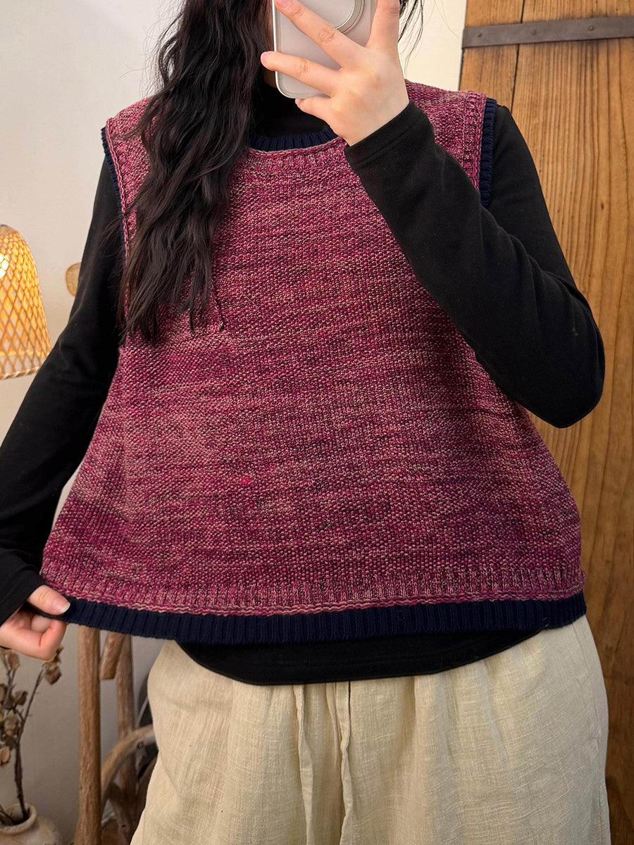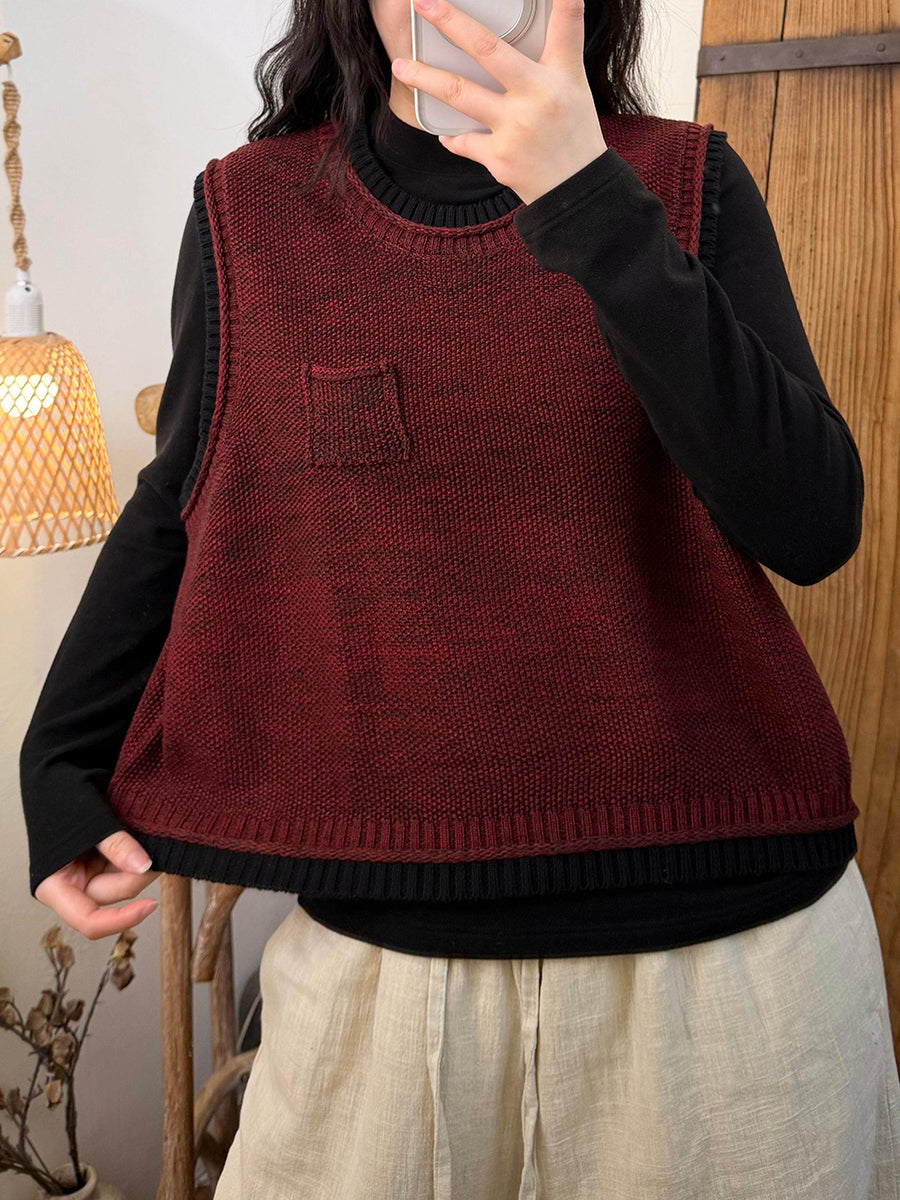 Colete feminino de tricô com decote redondo e blocos de cores, estilo artístico, para a primavera.