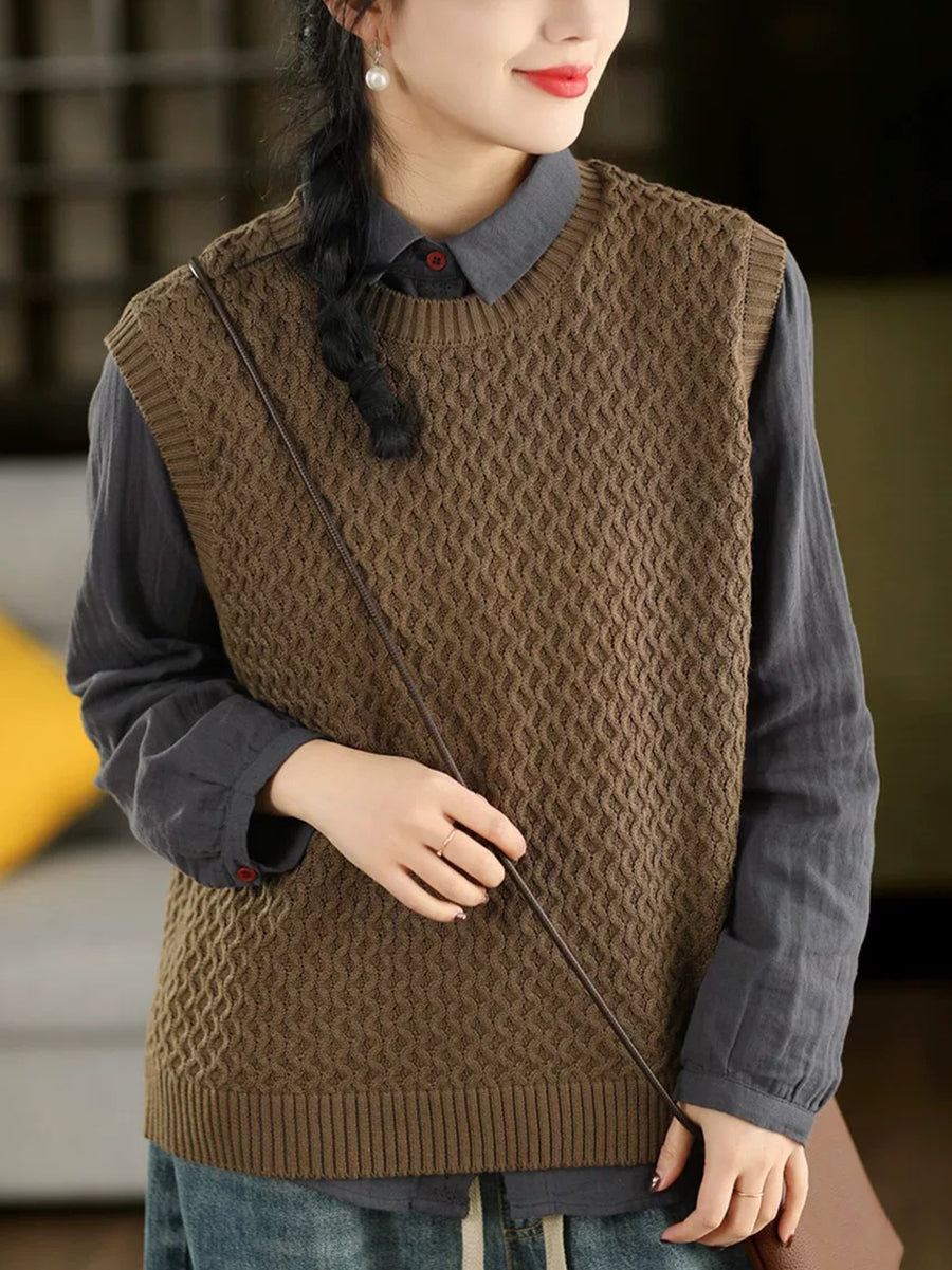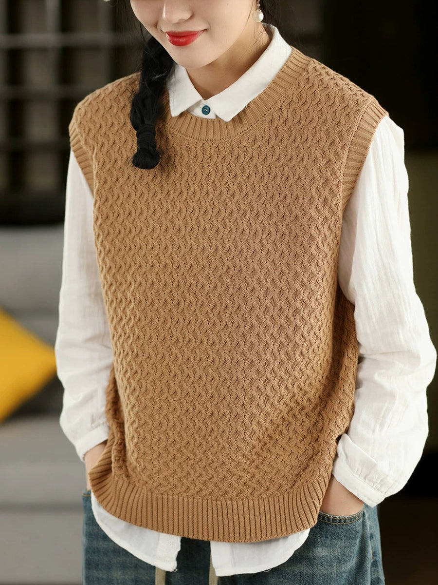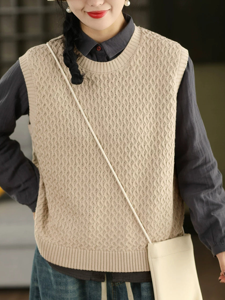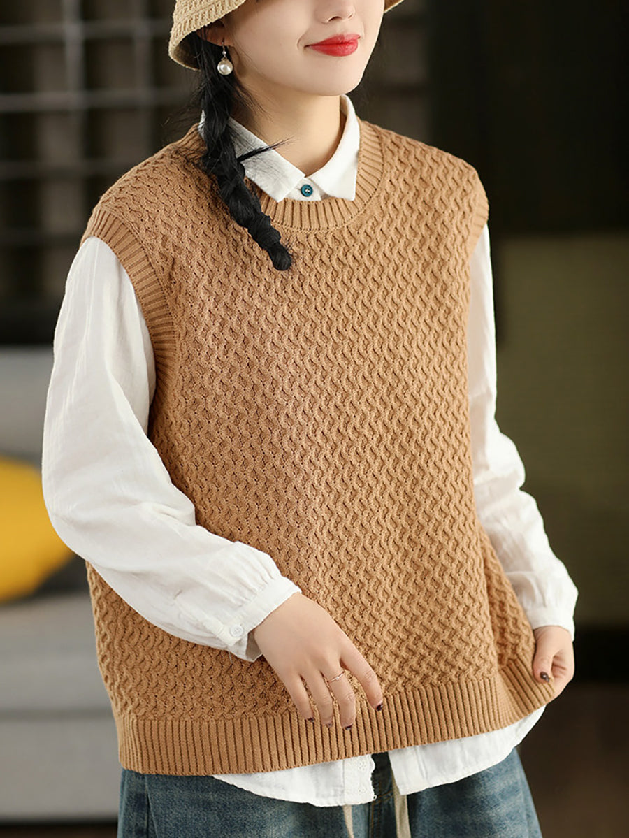 Colete feminino de tricô com decote redondo e cor lisa, estilo artístico, para a primavera.