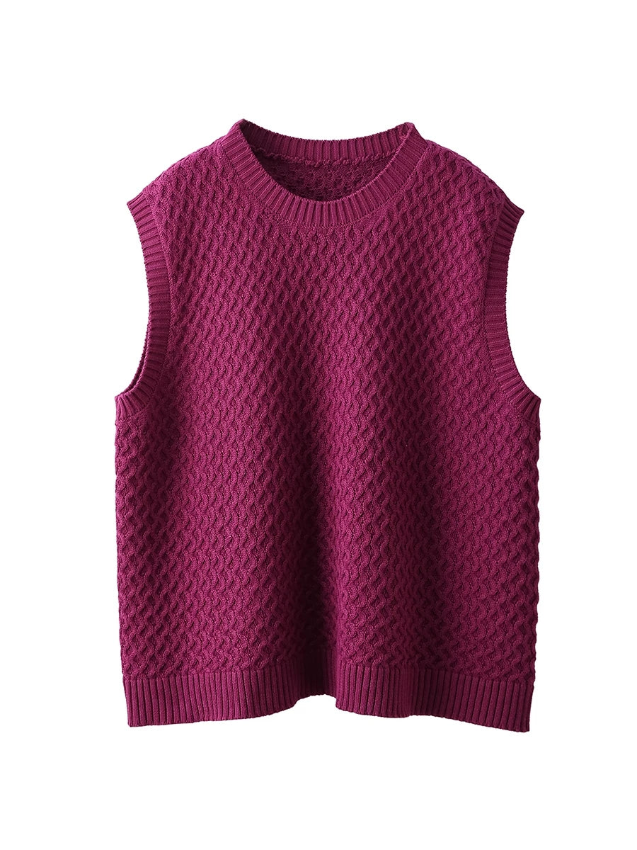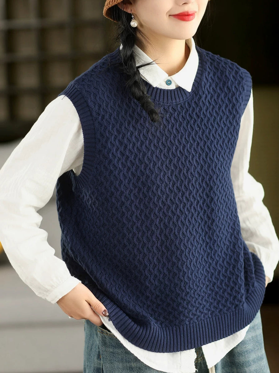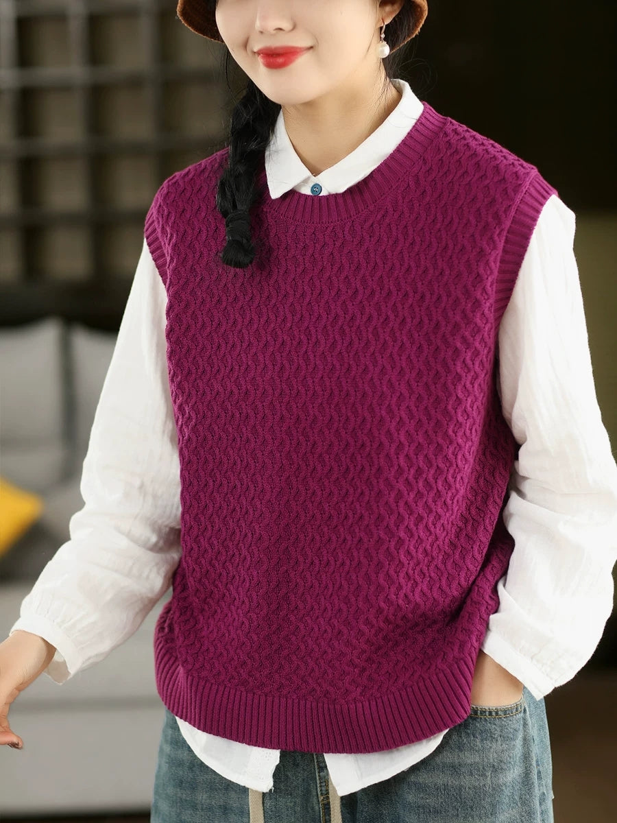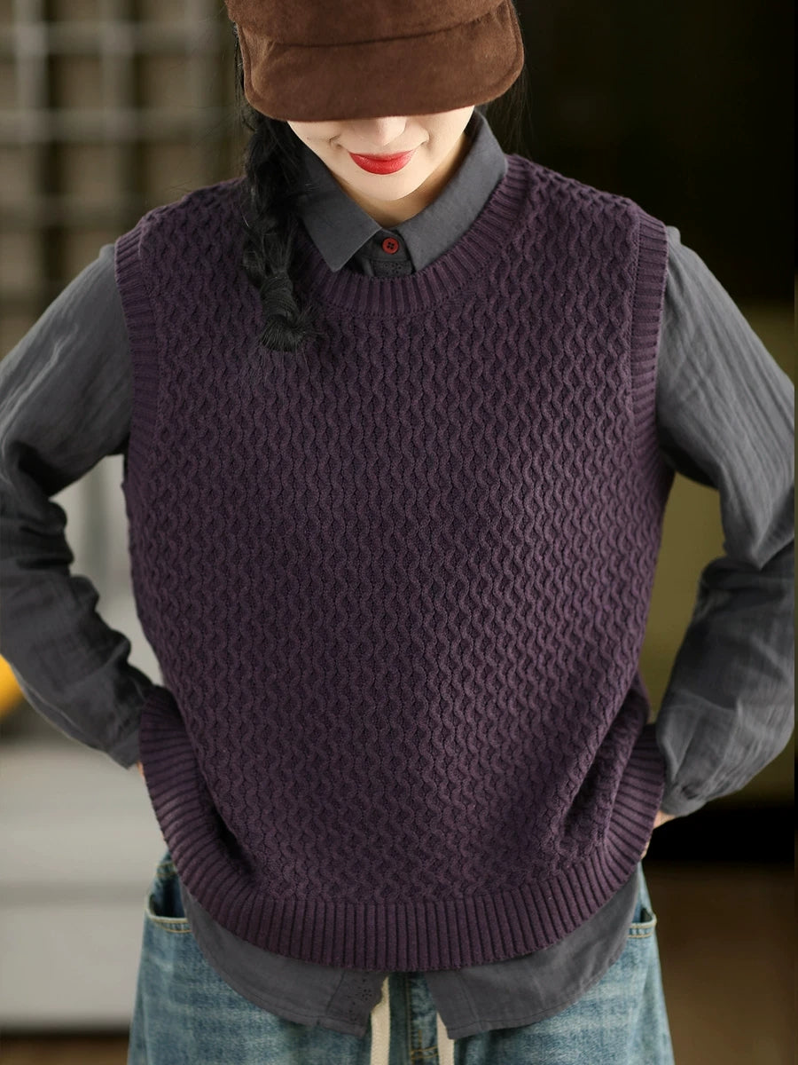 Colete feminino de tricô com decote redondo e cor lisa, estilo artístico, para a primavera.