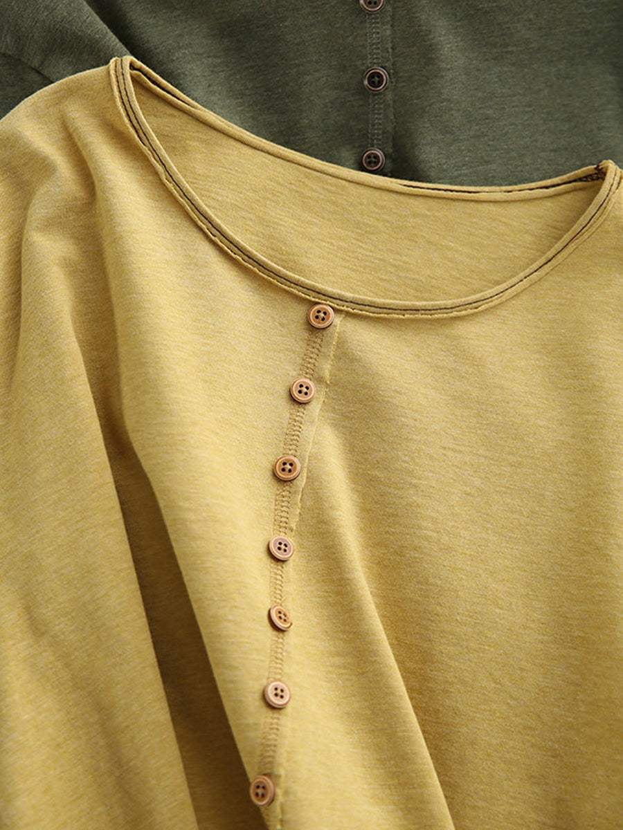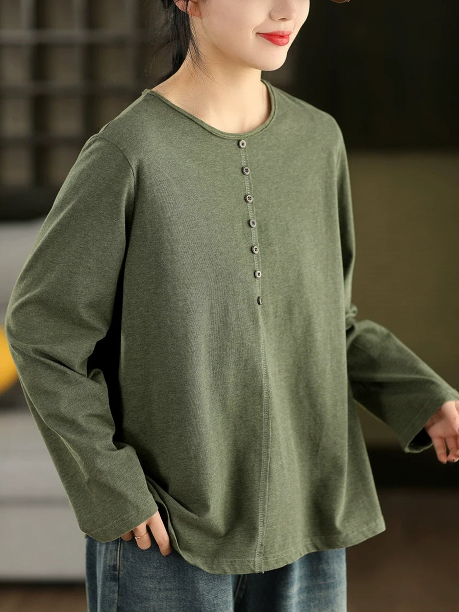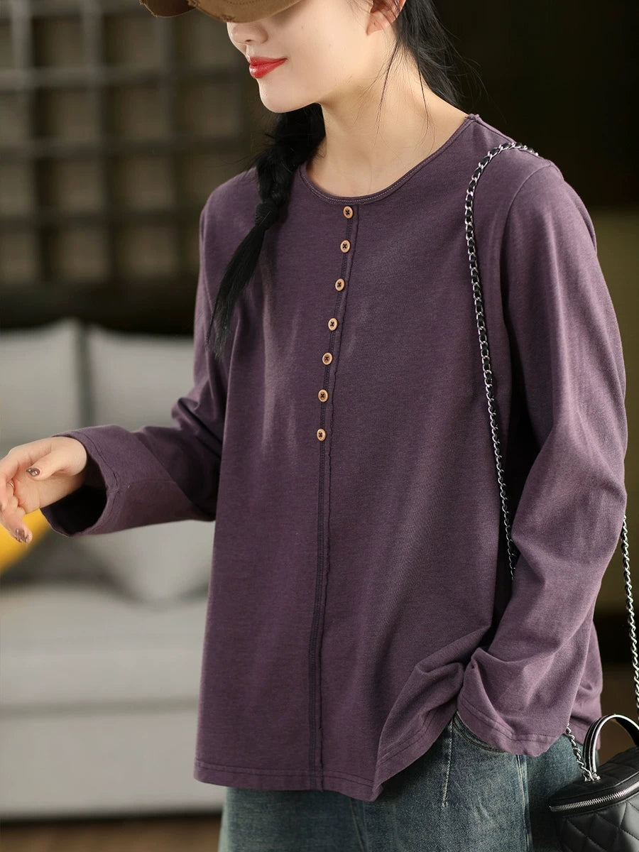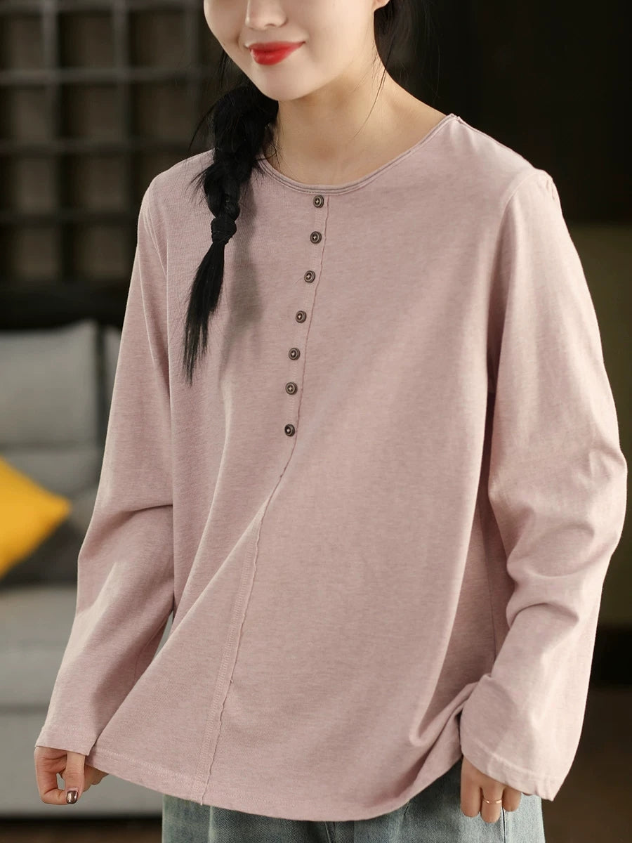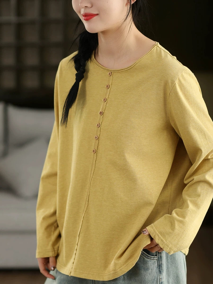 Blusa feminina de algodão 100% com decote redondo, estilo artístico e cor lisa para a primavera.