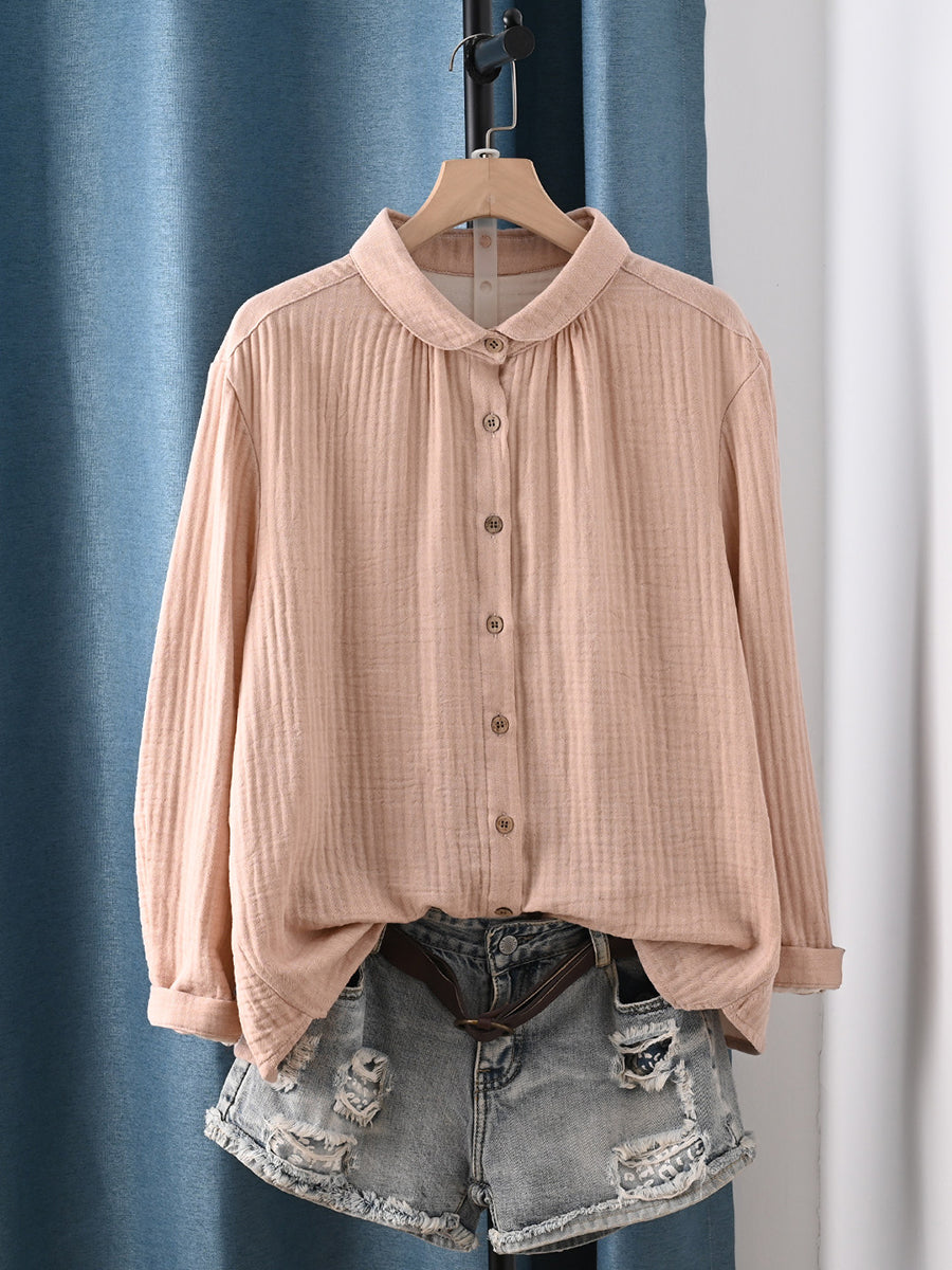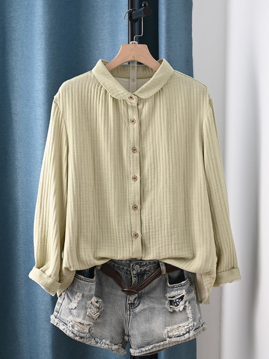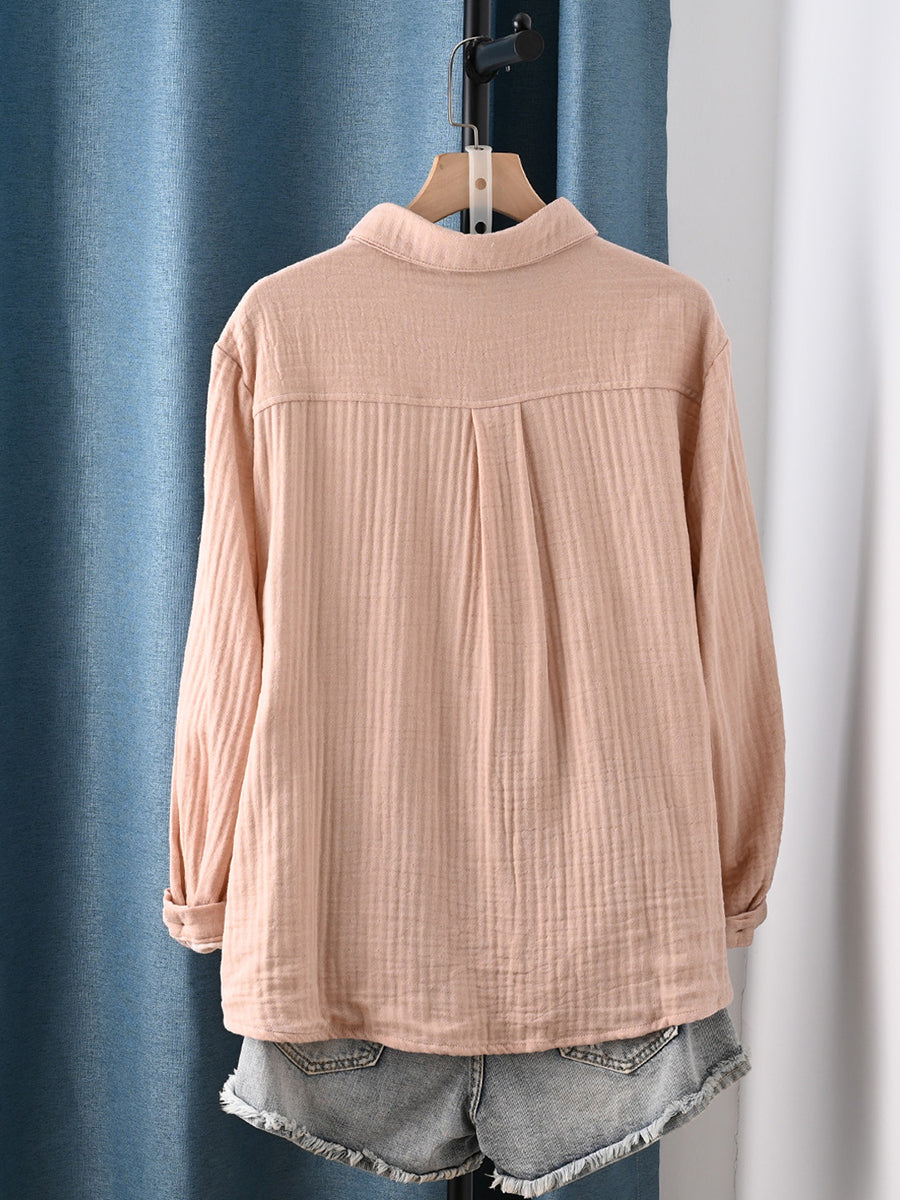 Camisa feminina de algodão 100% com estampa artística de primavera em cores puras.