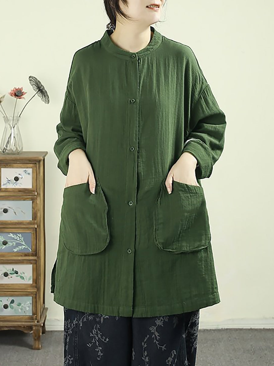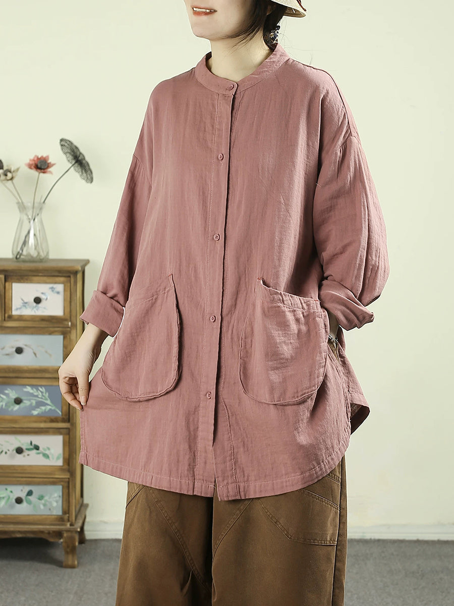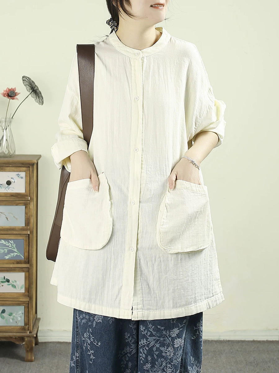 Camisa longa feminina de algodão puro, estilo primavera, com estampa artística.