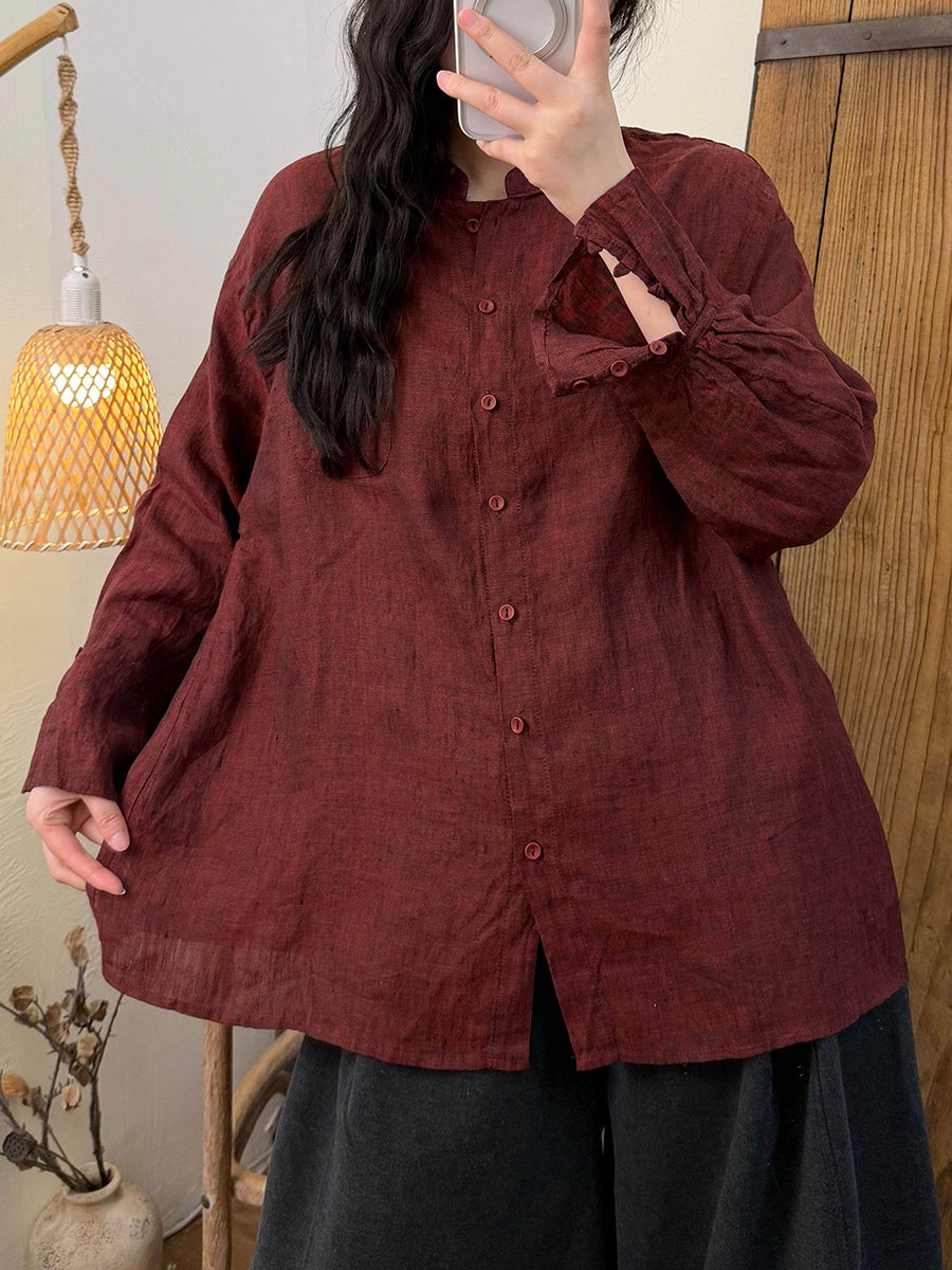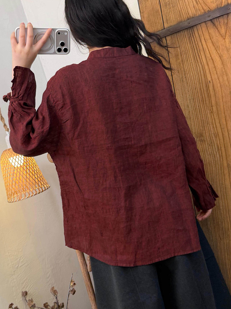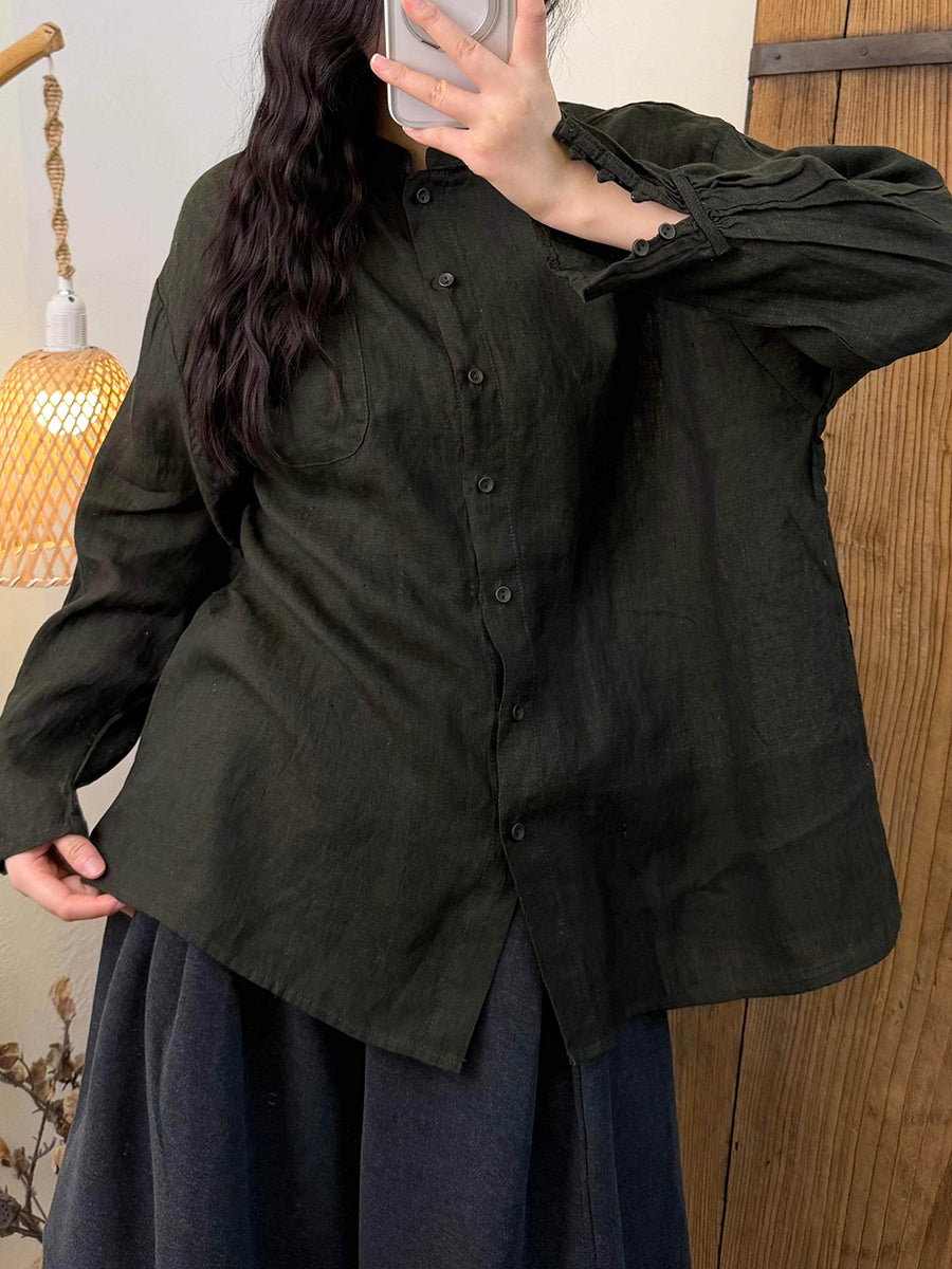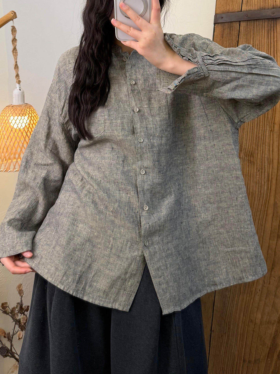 Camisa feminina de linho de cor pura com gola alta, estilo primavera, com design artístico.