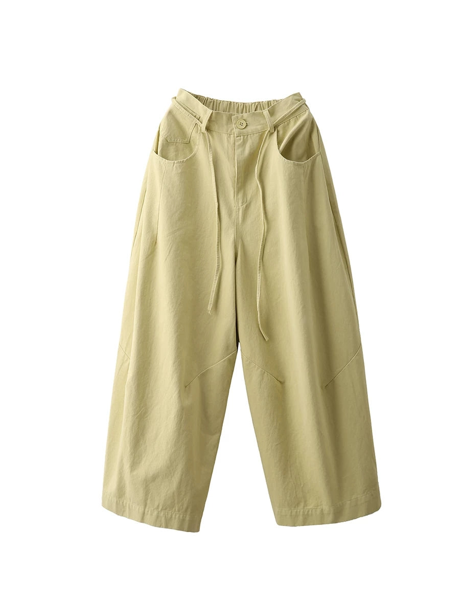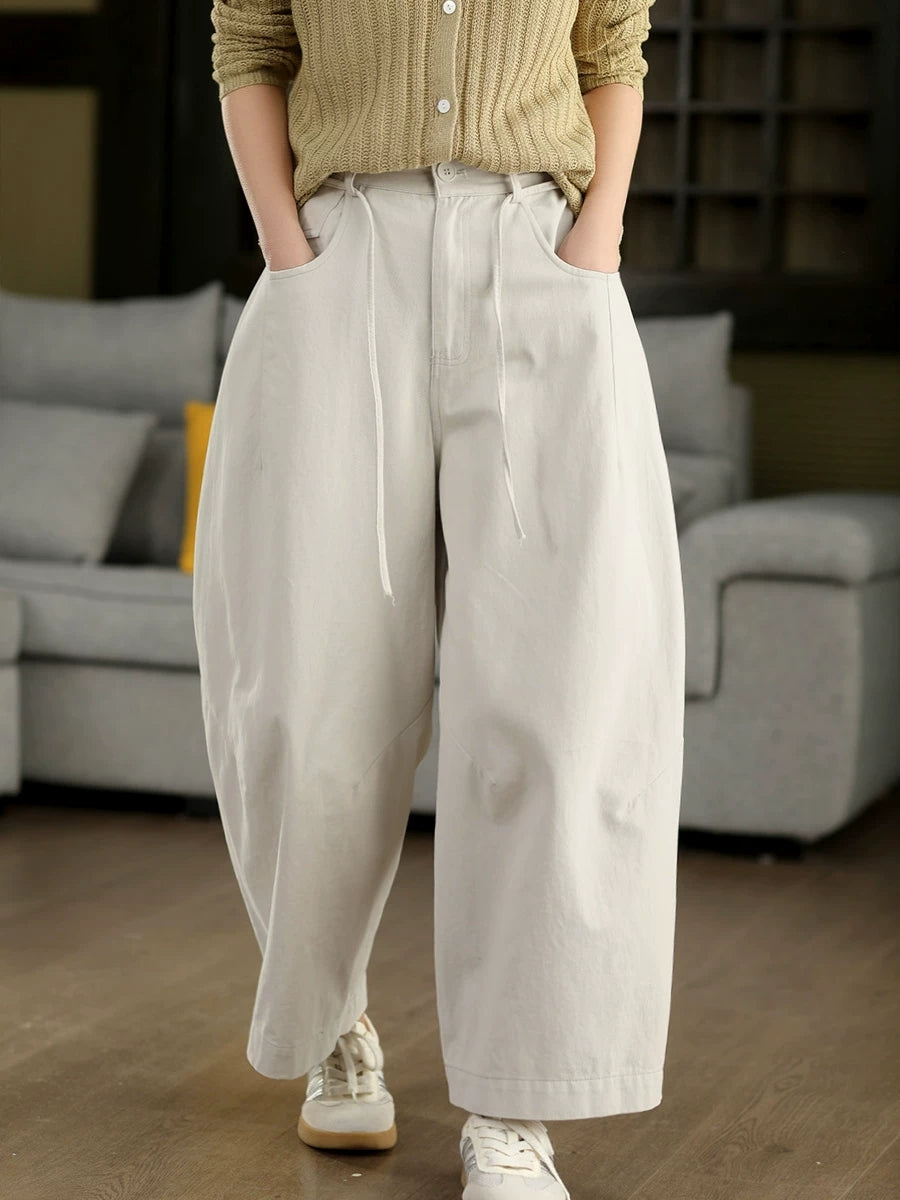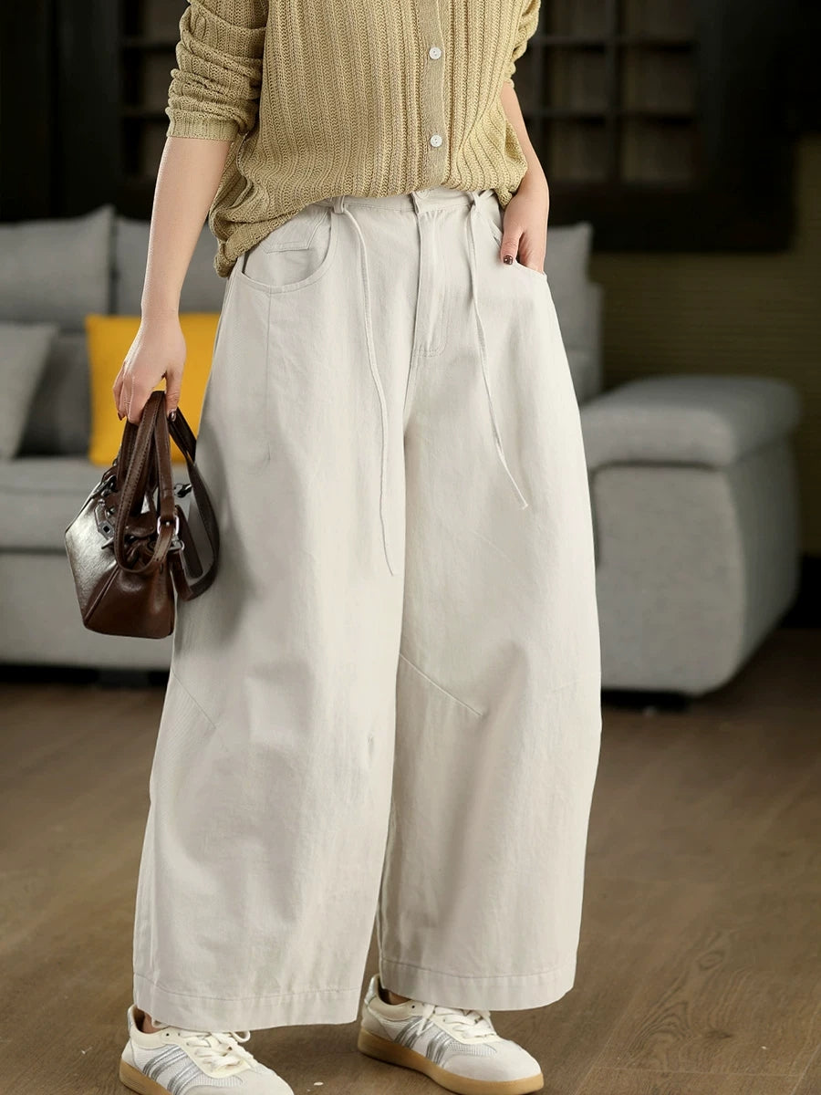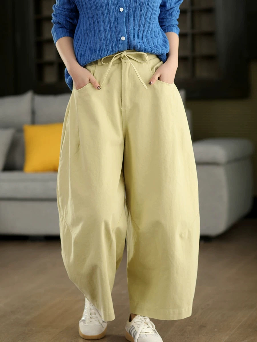 Calça feminina casual de primavera, cor lisa, 100% algodão, pernas largas.