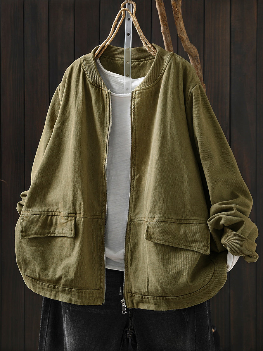 Jaqueta feminina casual de primavera em algodão liso com zíper.