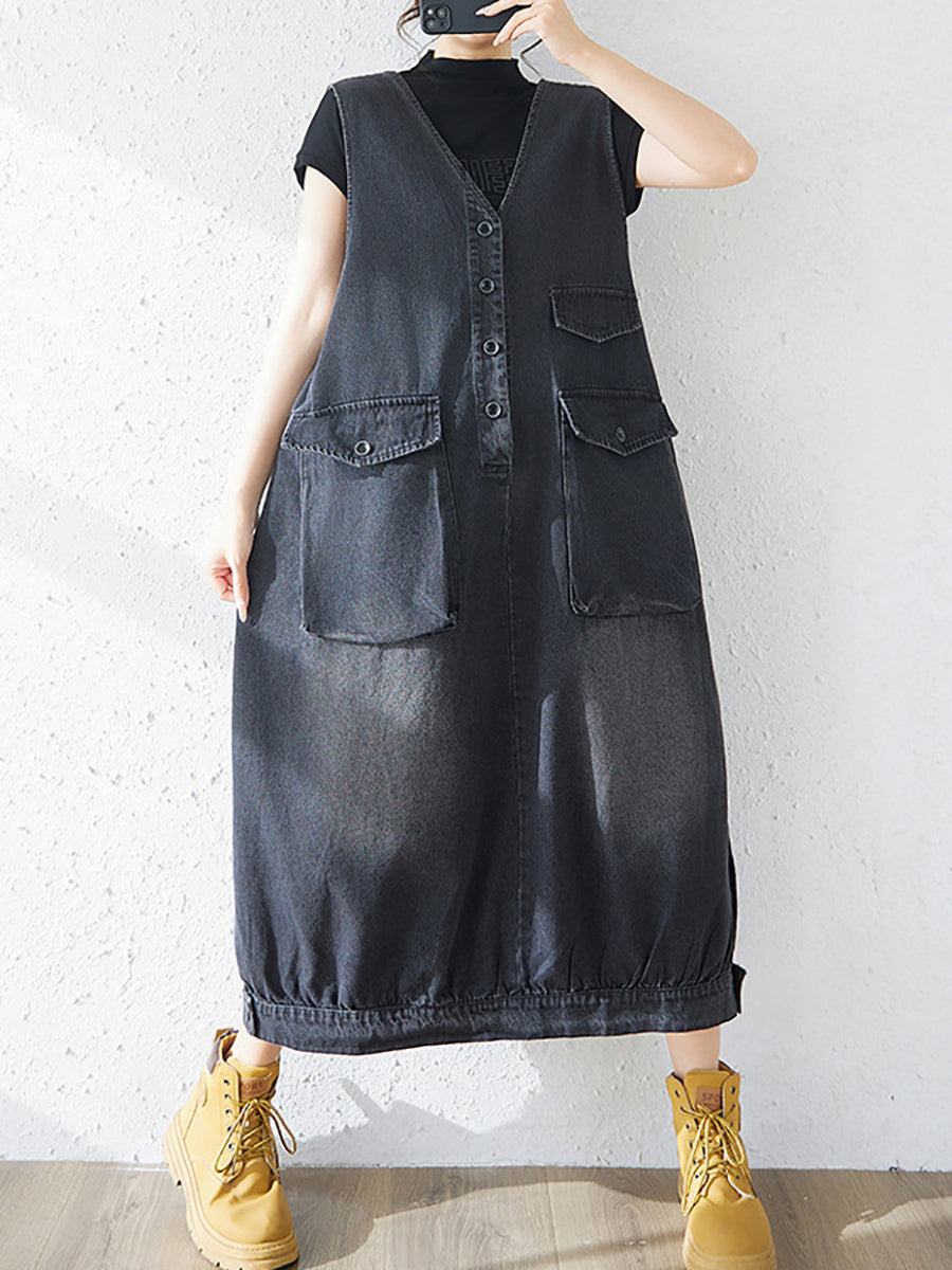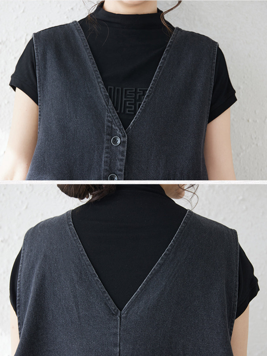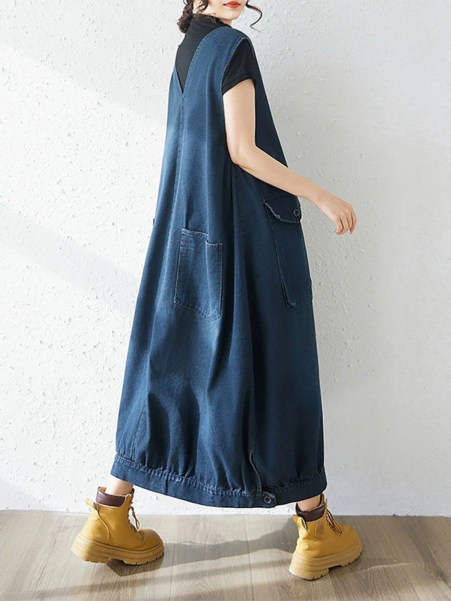 Vestido feminino casual de primavera em jeans de cor lisa com decote em V