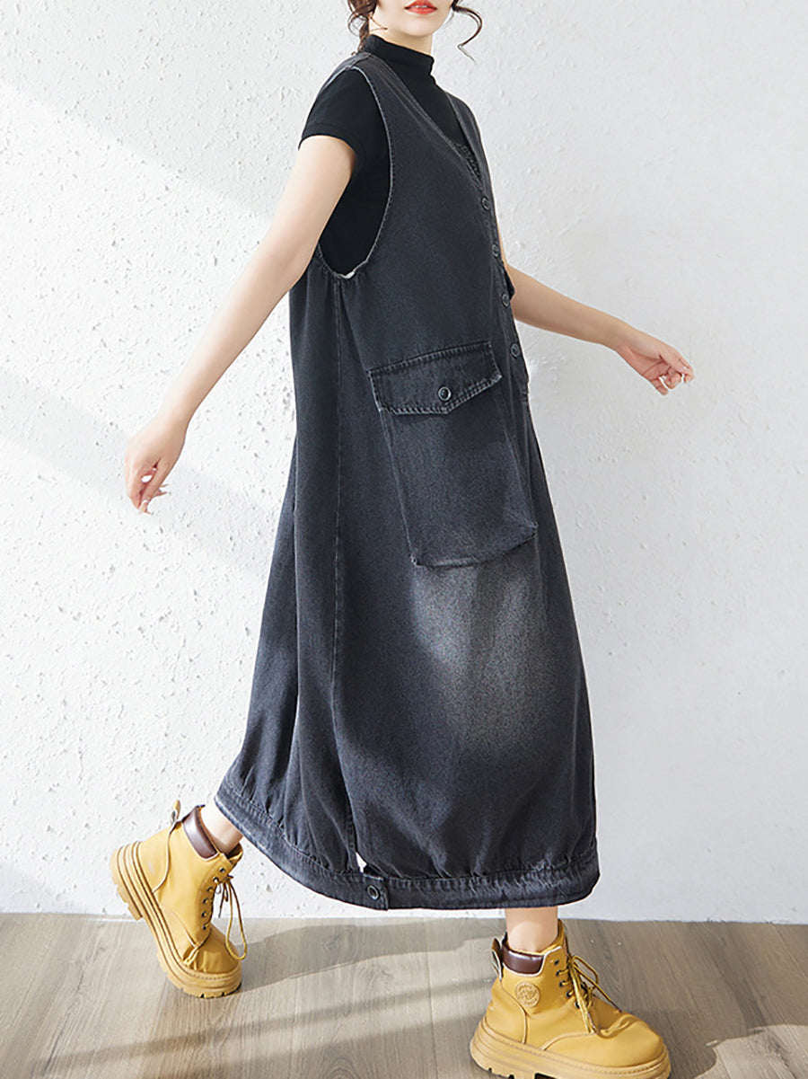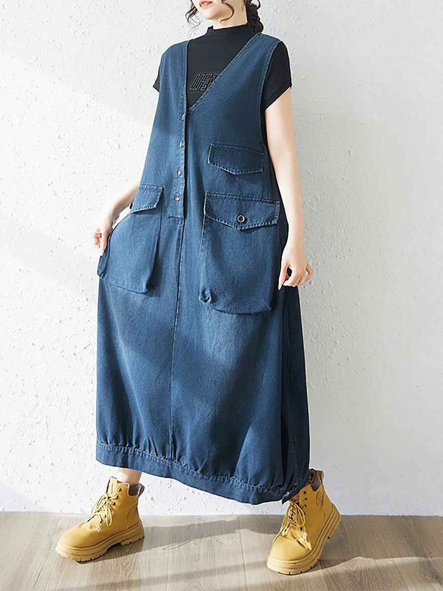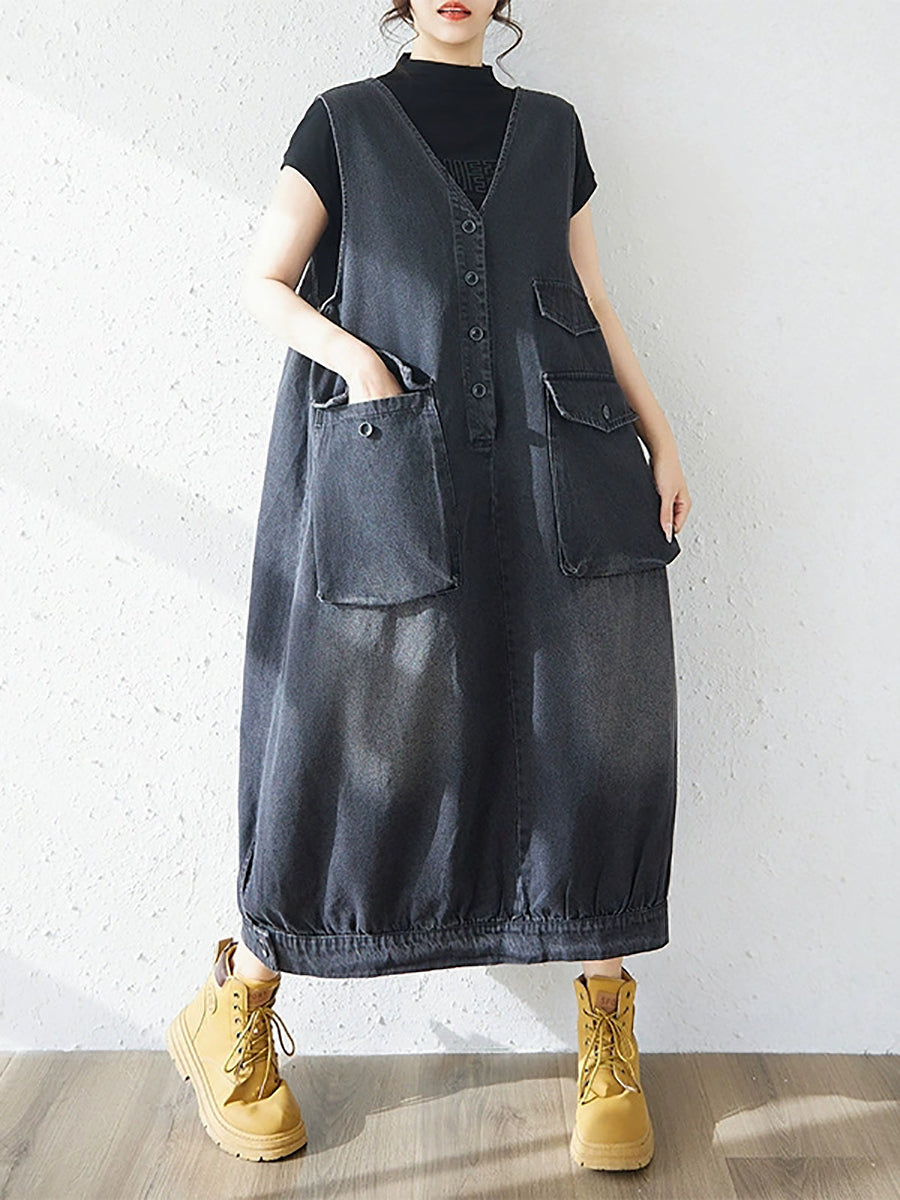Vestido feminino casual de primavera em jeans de cor lisa com decote em V