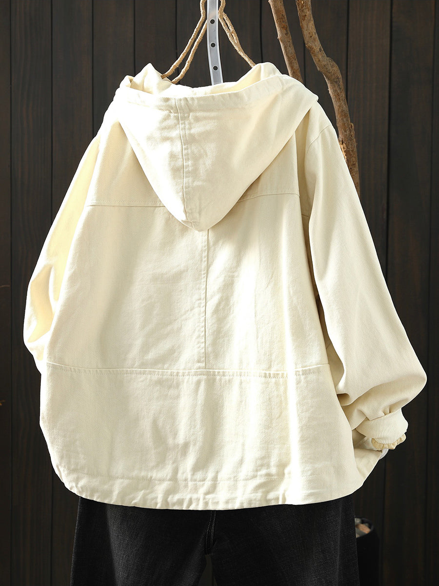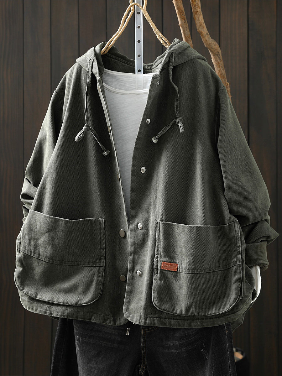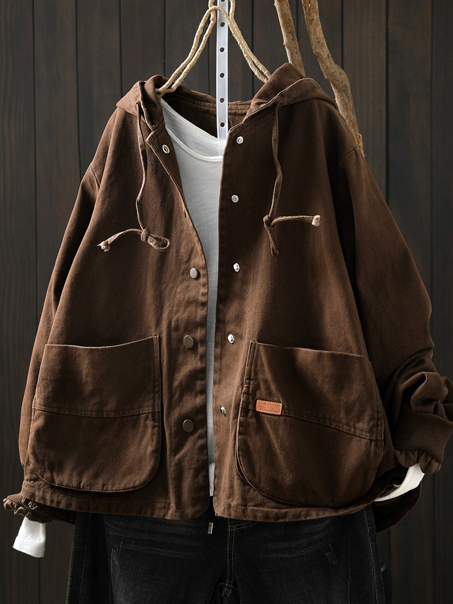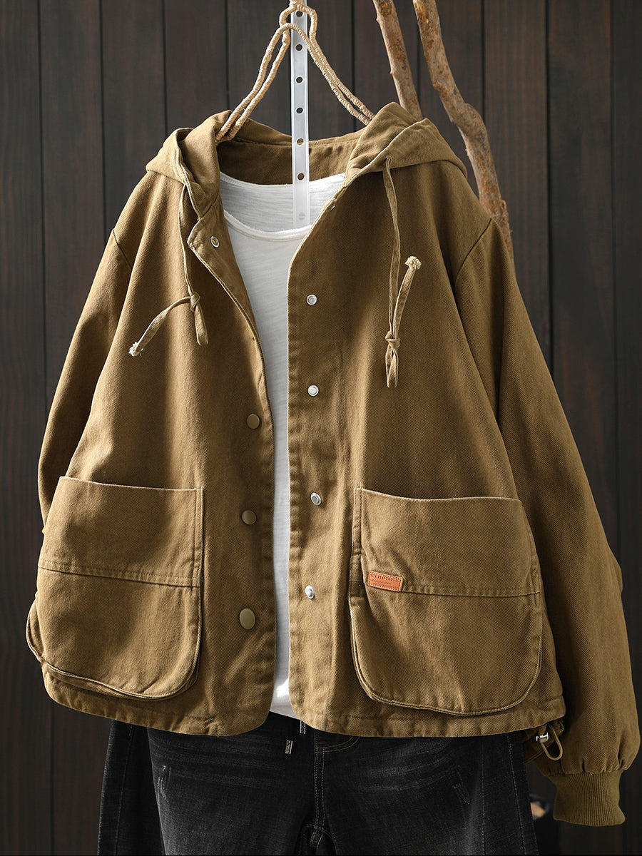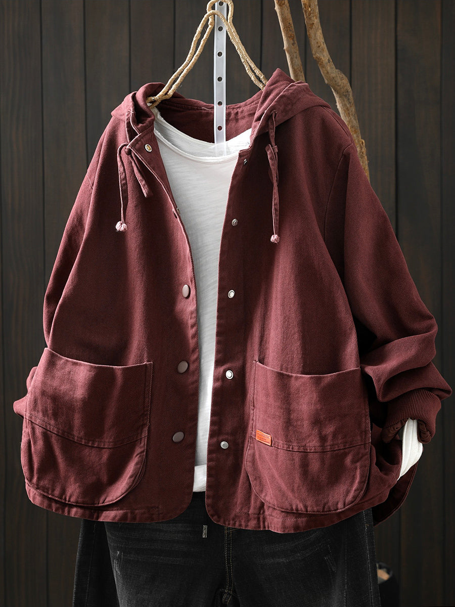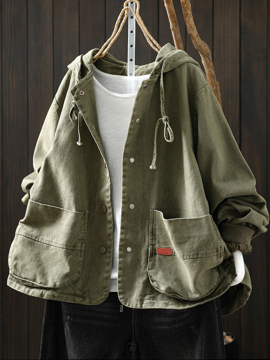 Casaco feminino de algodão com capuz, casual, de cor lisa, para a primavera.