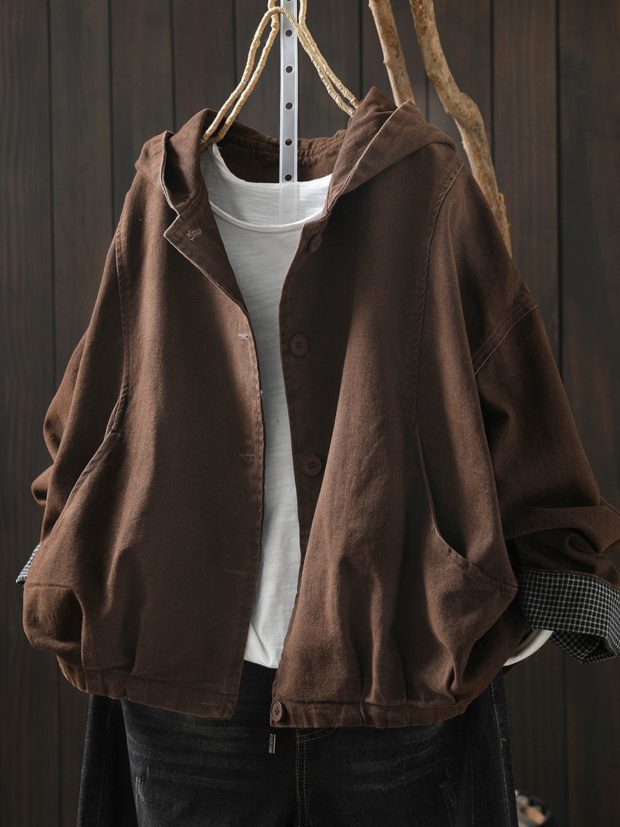 Casaco feminino de algodão com capuz, casual, de cor lisa, para a primavera.