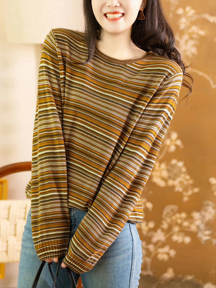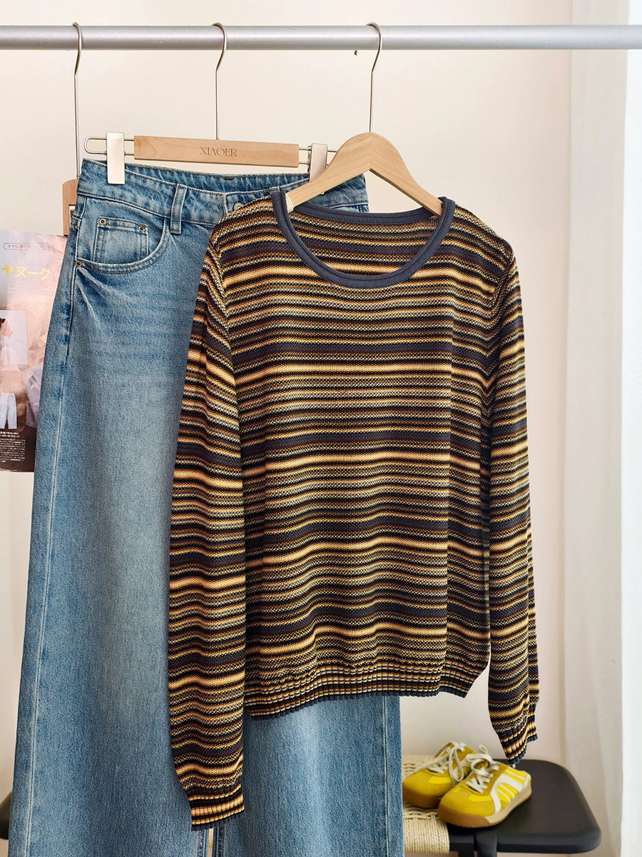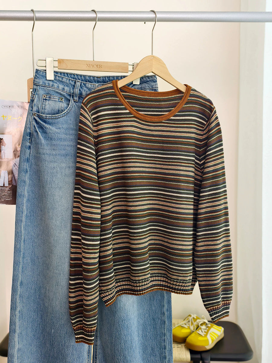 Blusa feminina casual de algodão listrada com decote redondo para a primavera