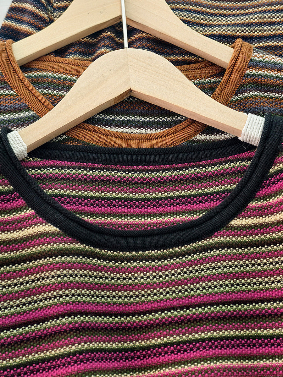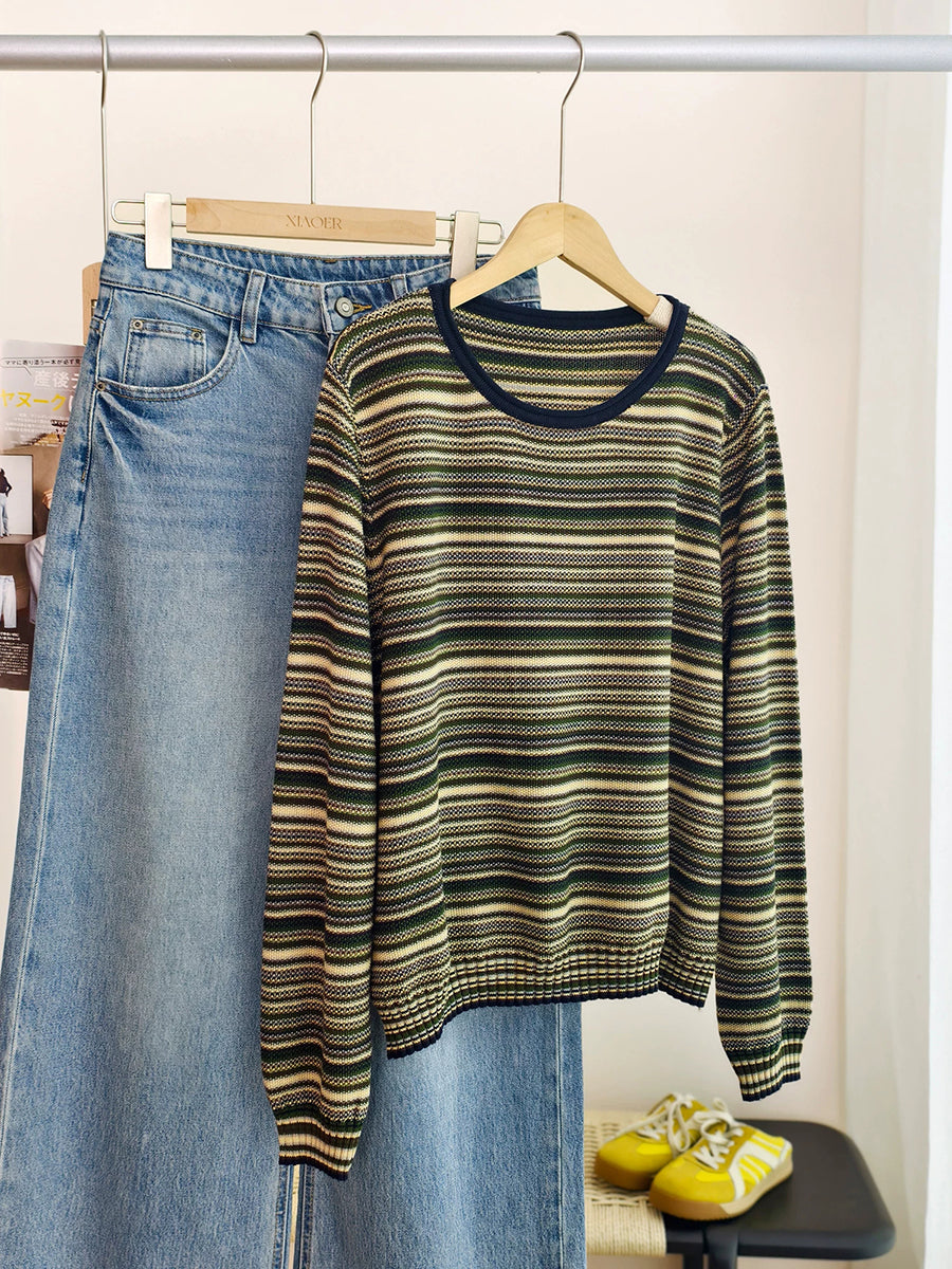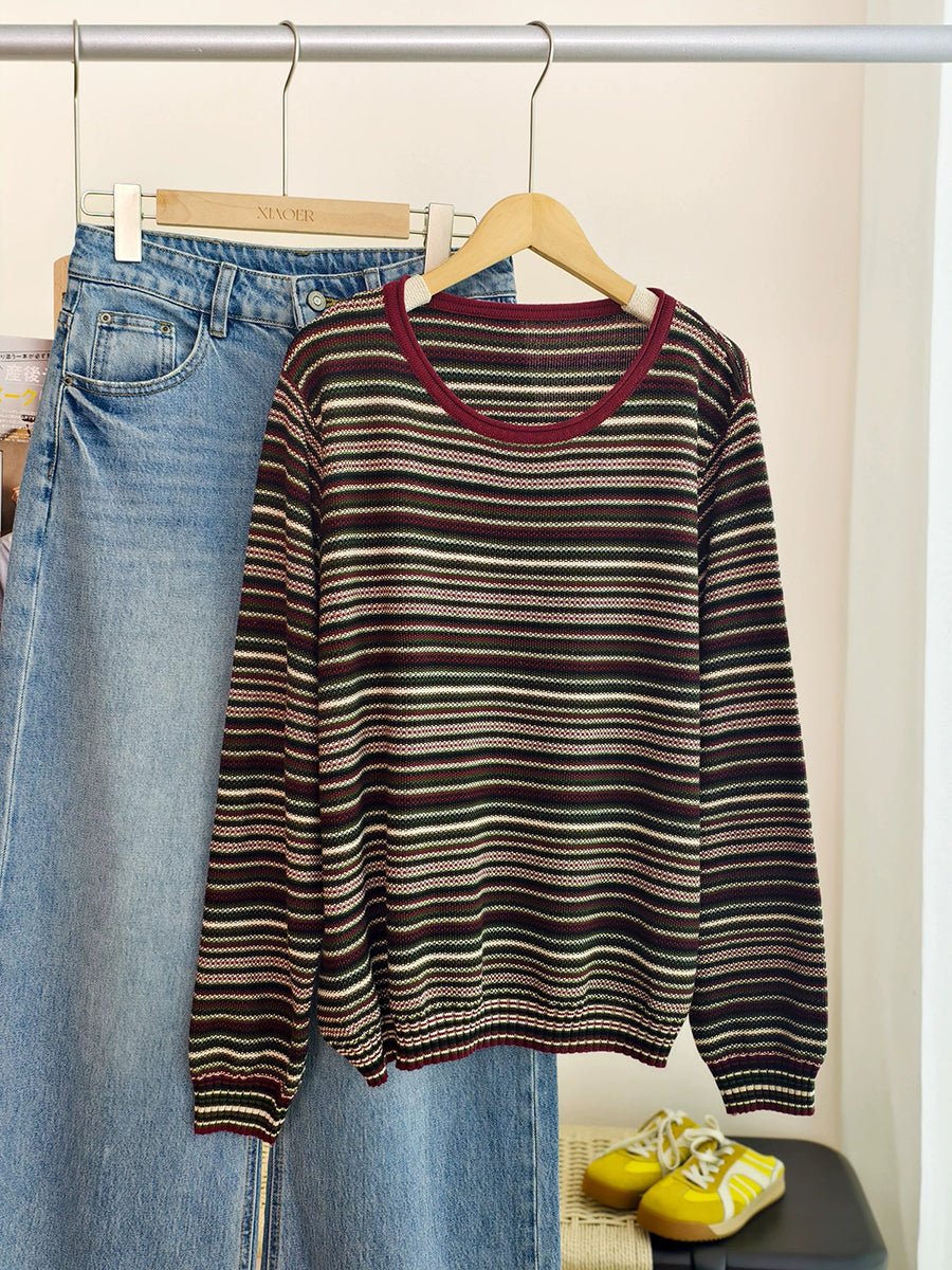 Blusa feminina casual de algodão listrada com decote redondo para a primavera