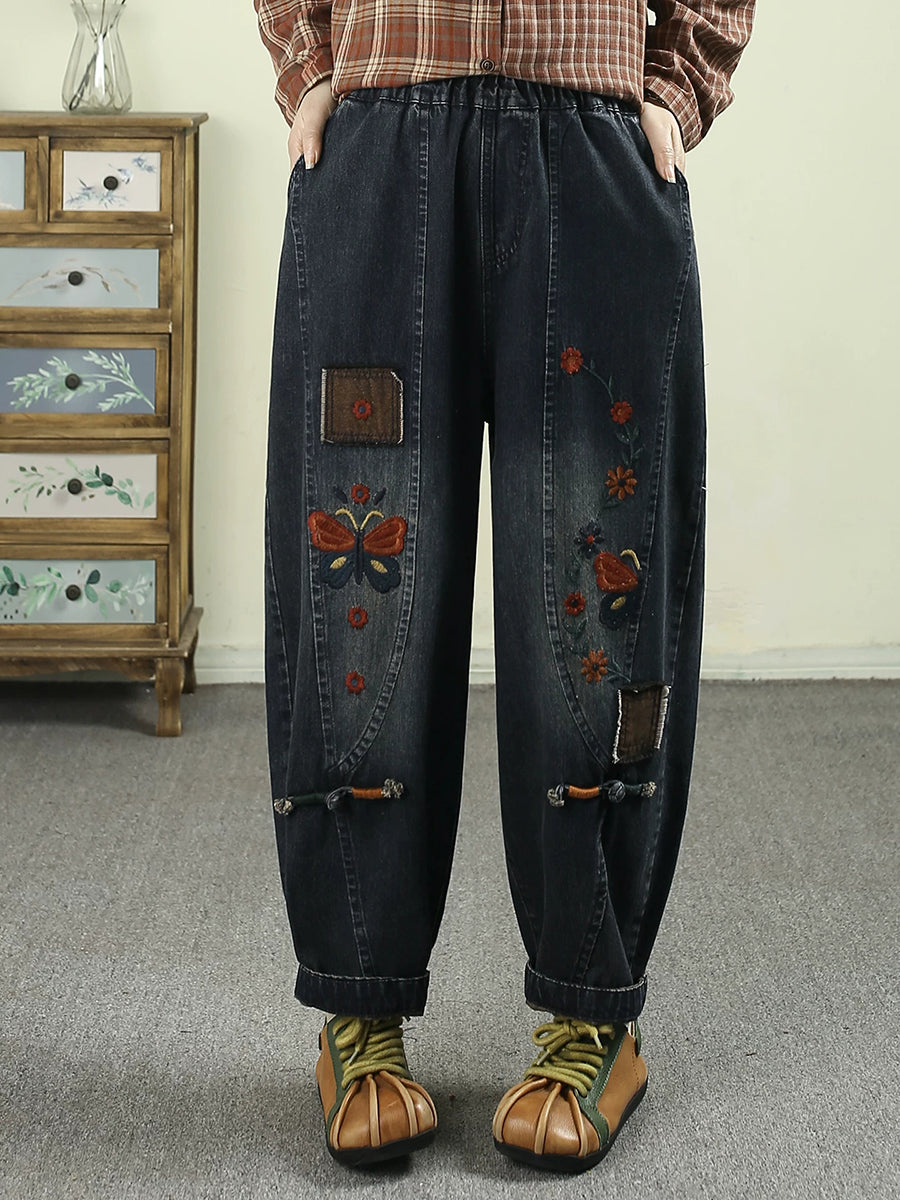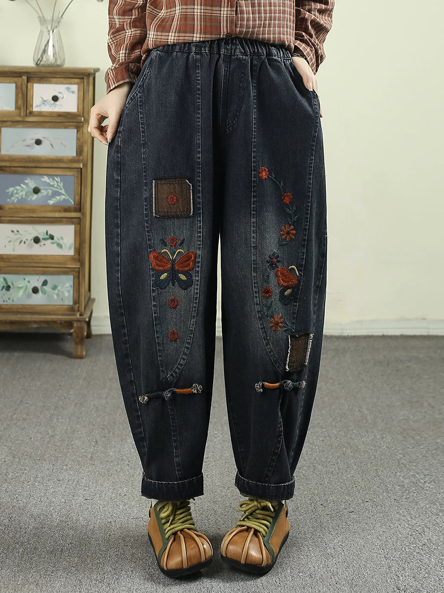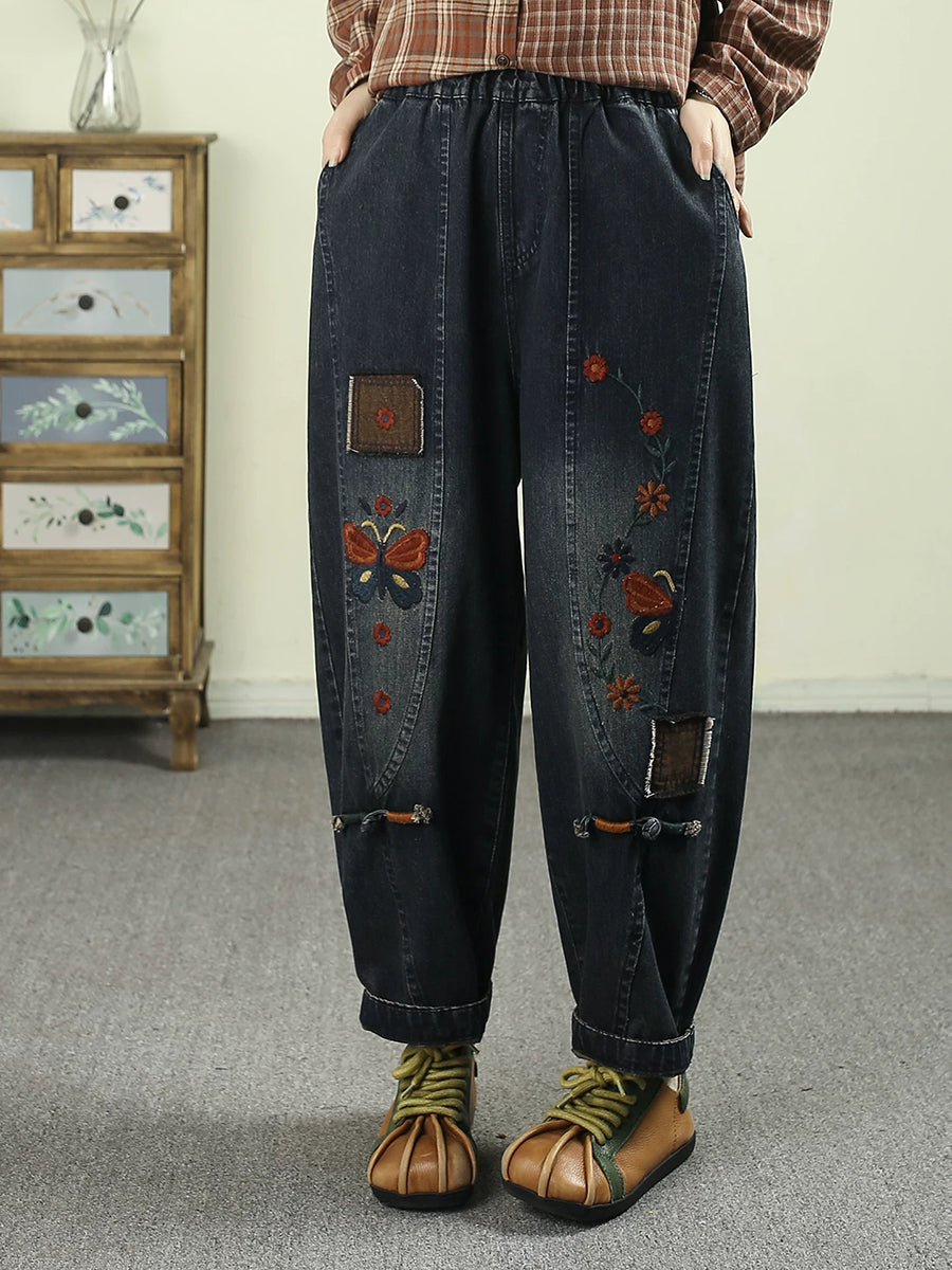 Calça Harem Jeans Feminina com Bordado de Flores da Primavera