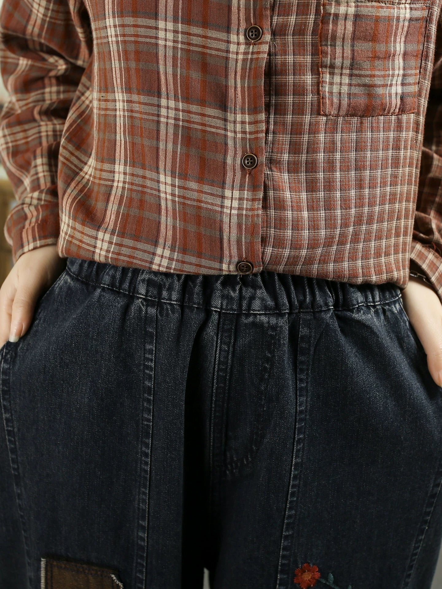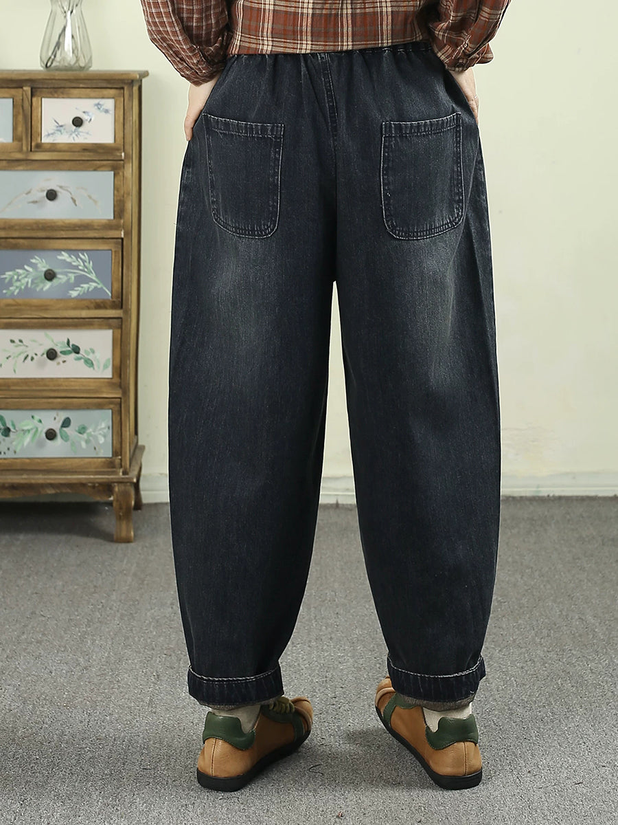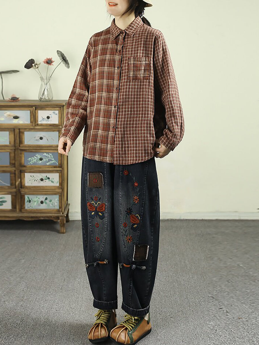 Calça Harem Jeans Feminina com Bordado de Flores da Primavera