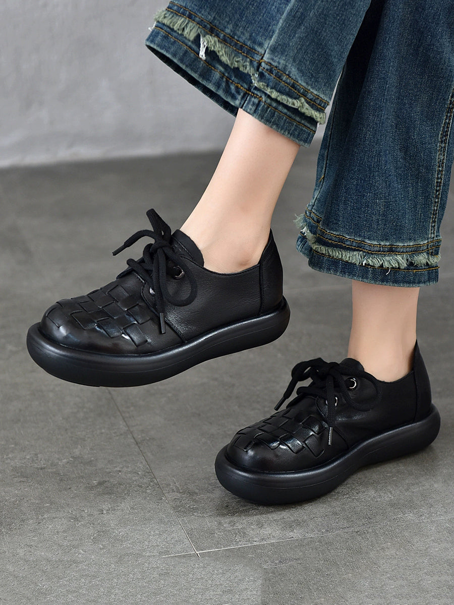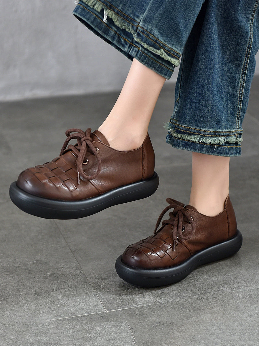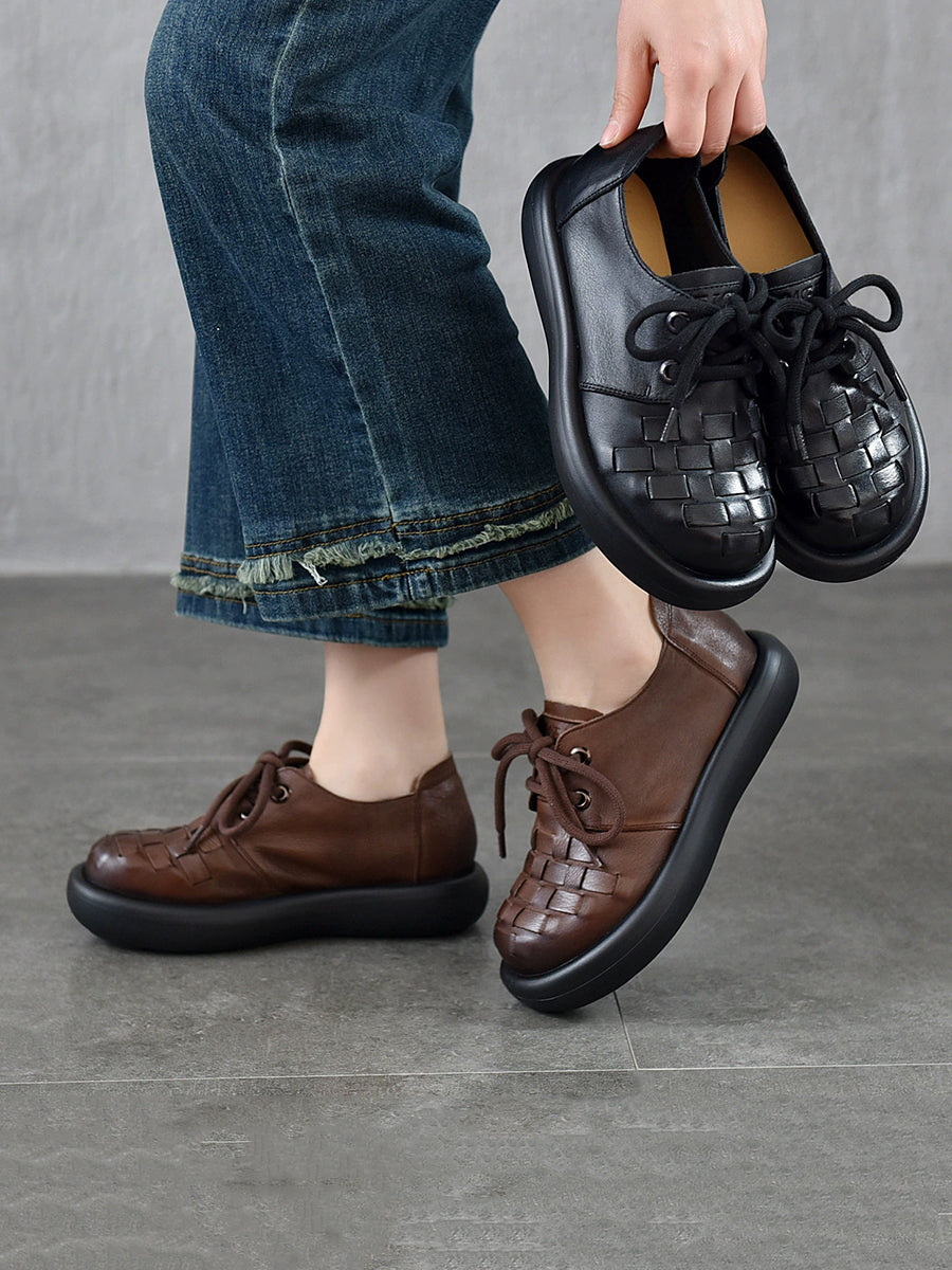 Sapatos femininos de primavera em couro legítimo trançado, estilo rasteiro.