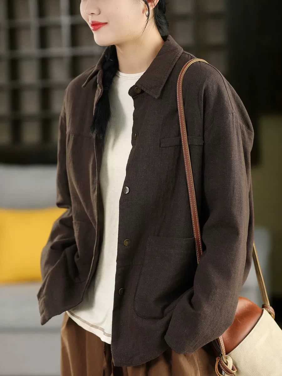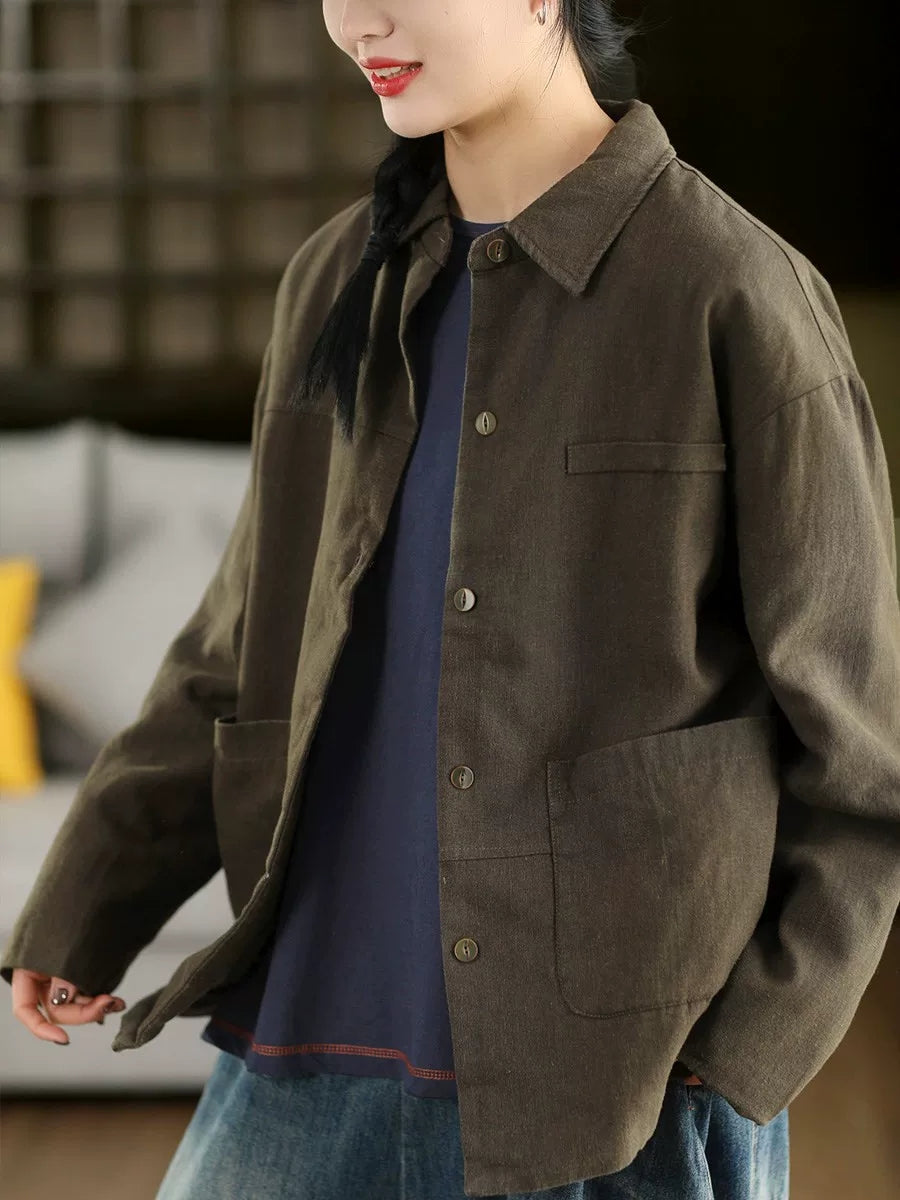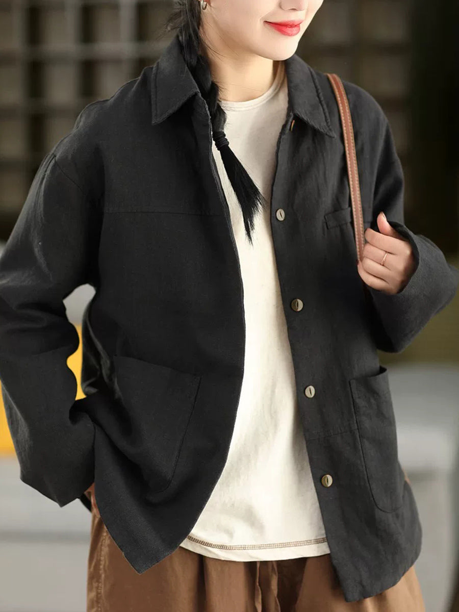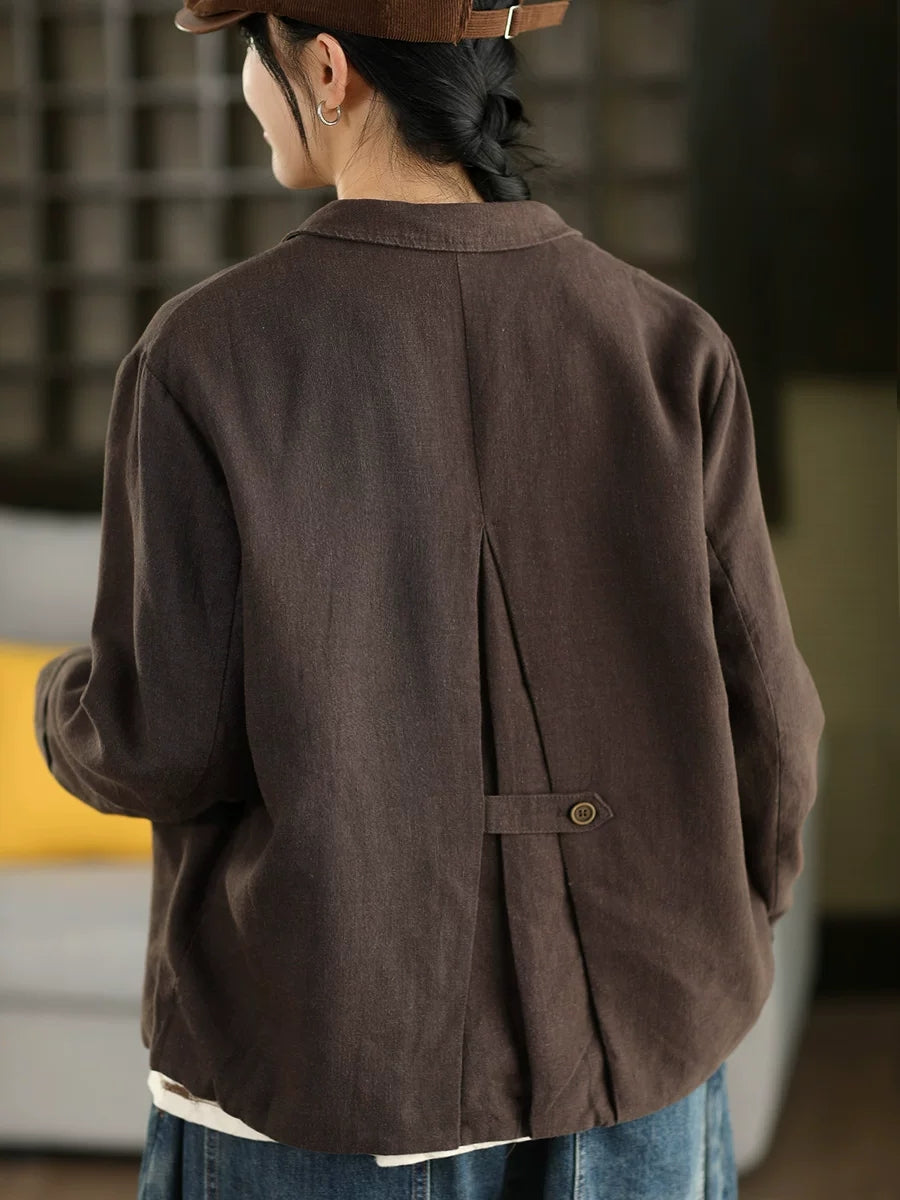 Casaco feminino de linho 100% com gola dobrável, cor lisa e estampa de primavera.