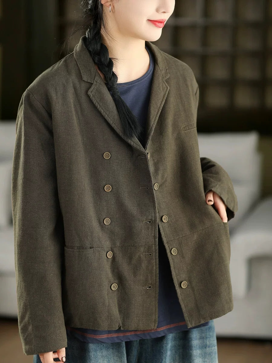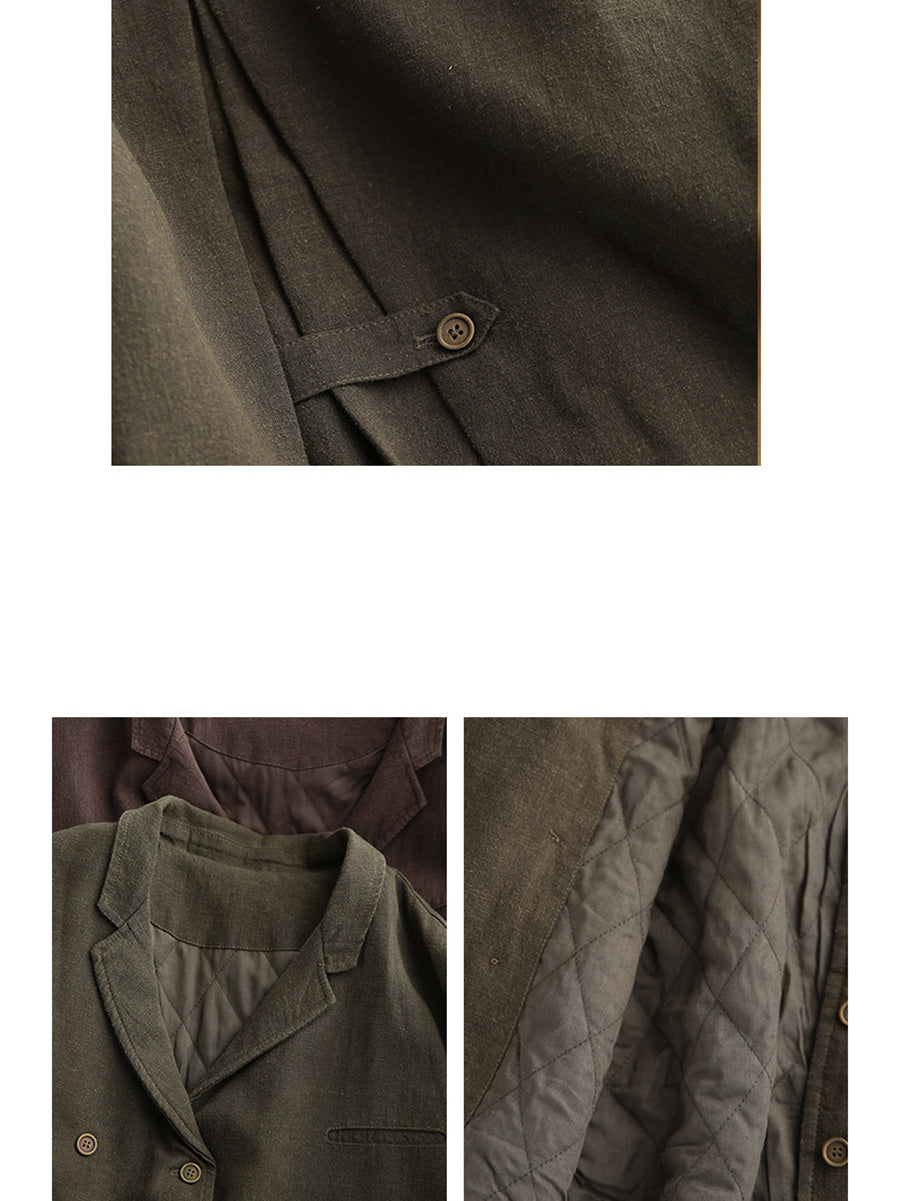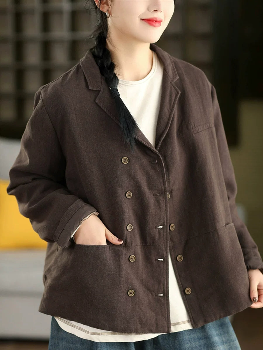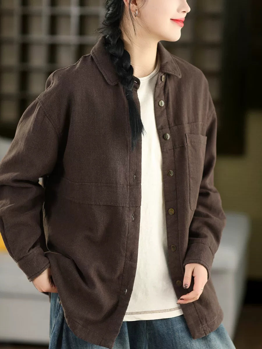 Casaco feminino de linho 100% com gola dobrável, cor lisa e estampa de primavera.
