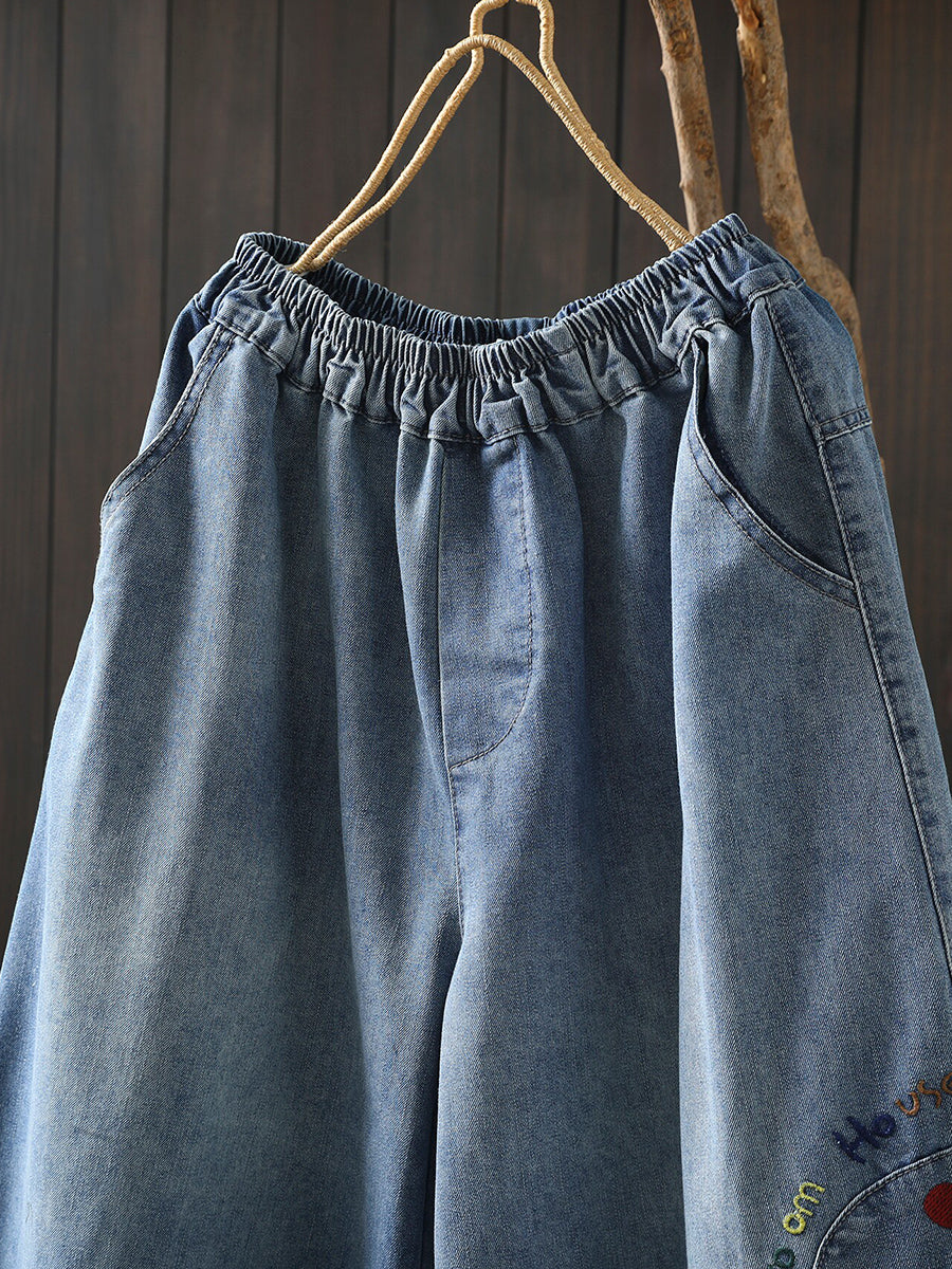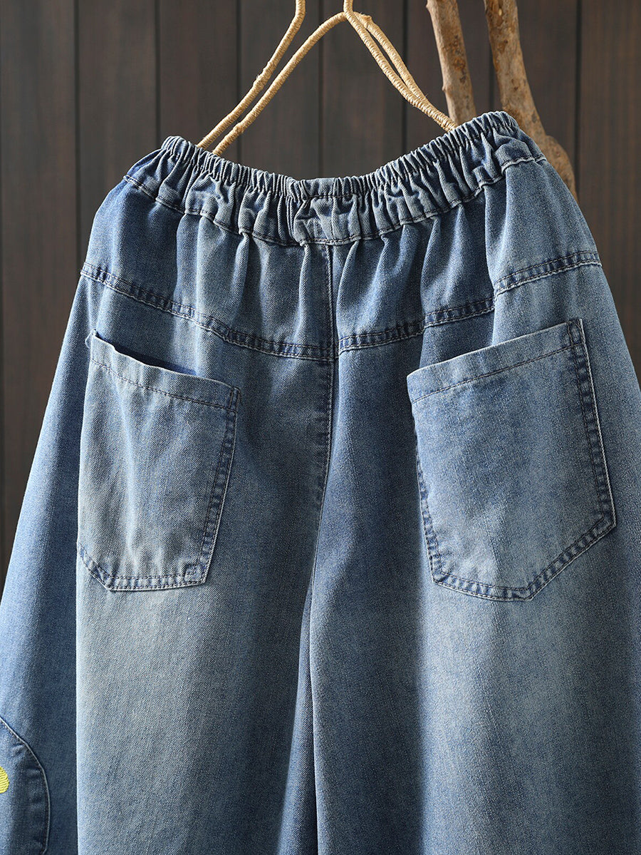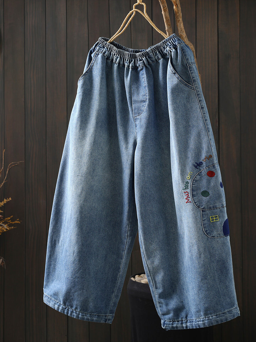 Calça jeans feminina retrô de pernas largas com bordados para a primavera