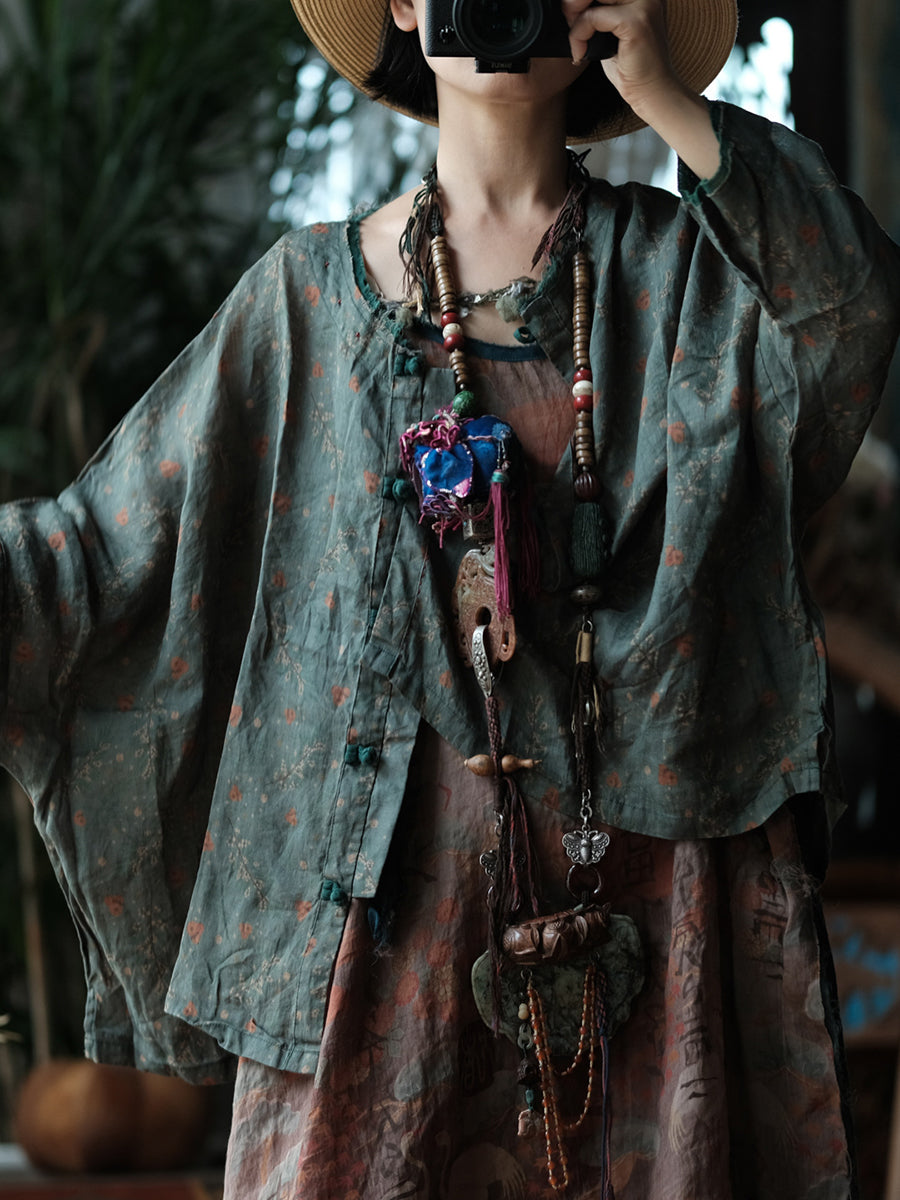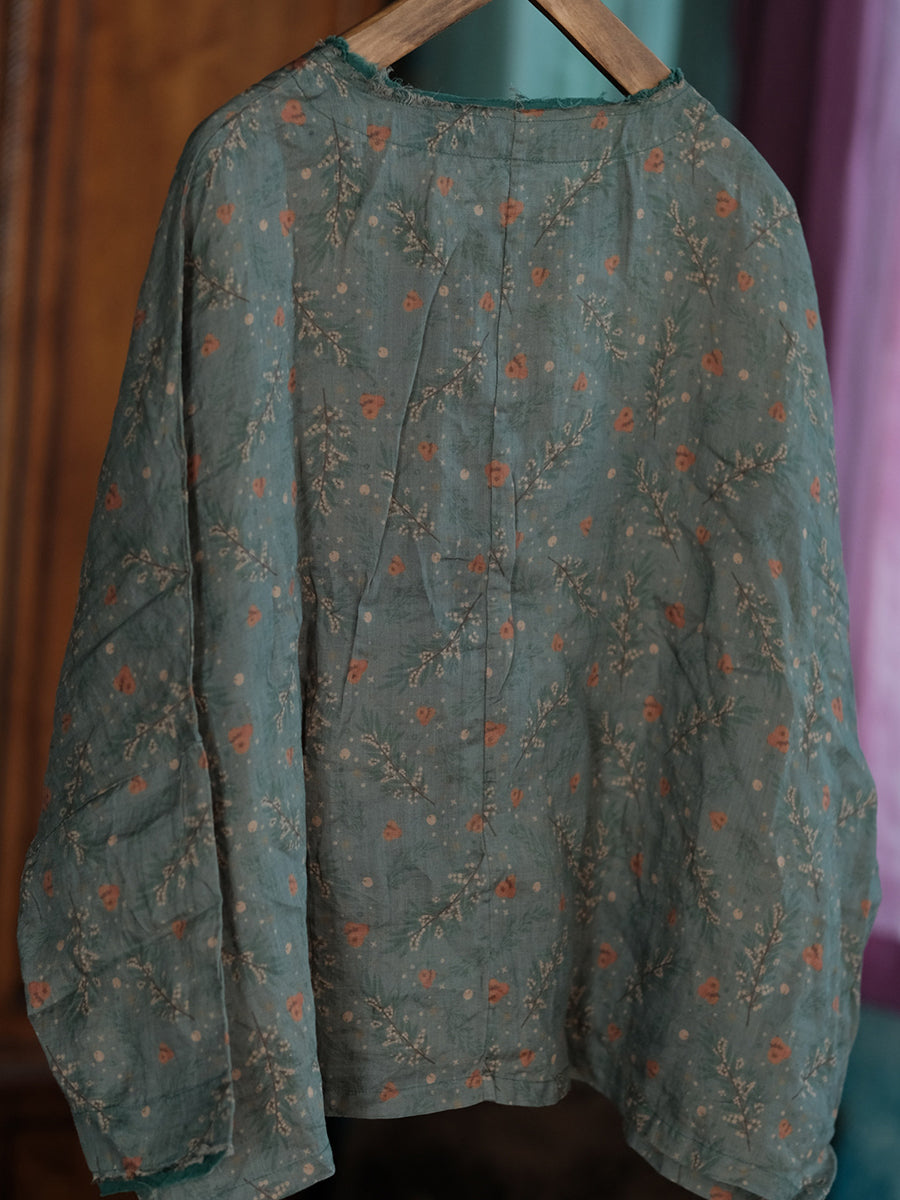Camisa feminina de linho com estampa floral retrô e gola redonda para a primavera