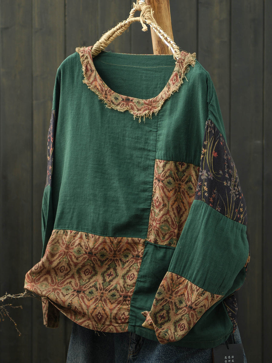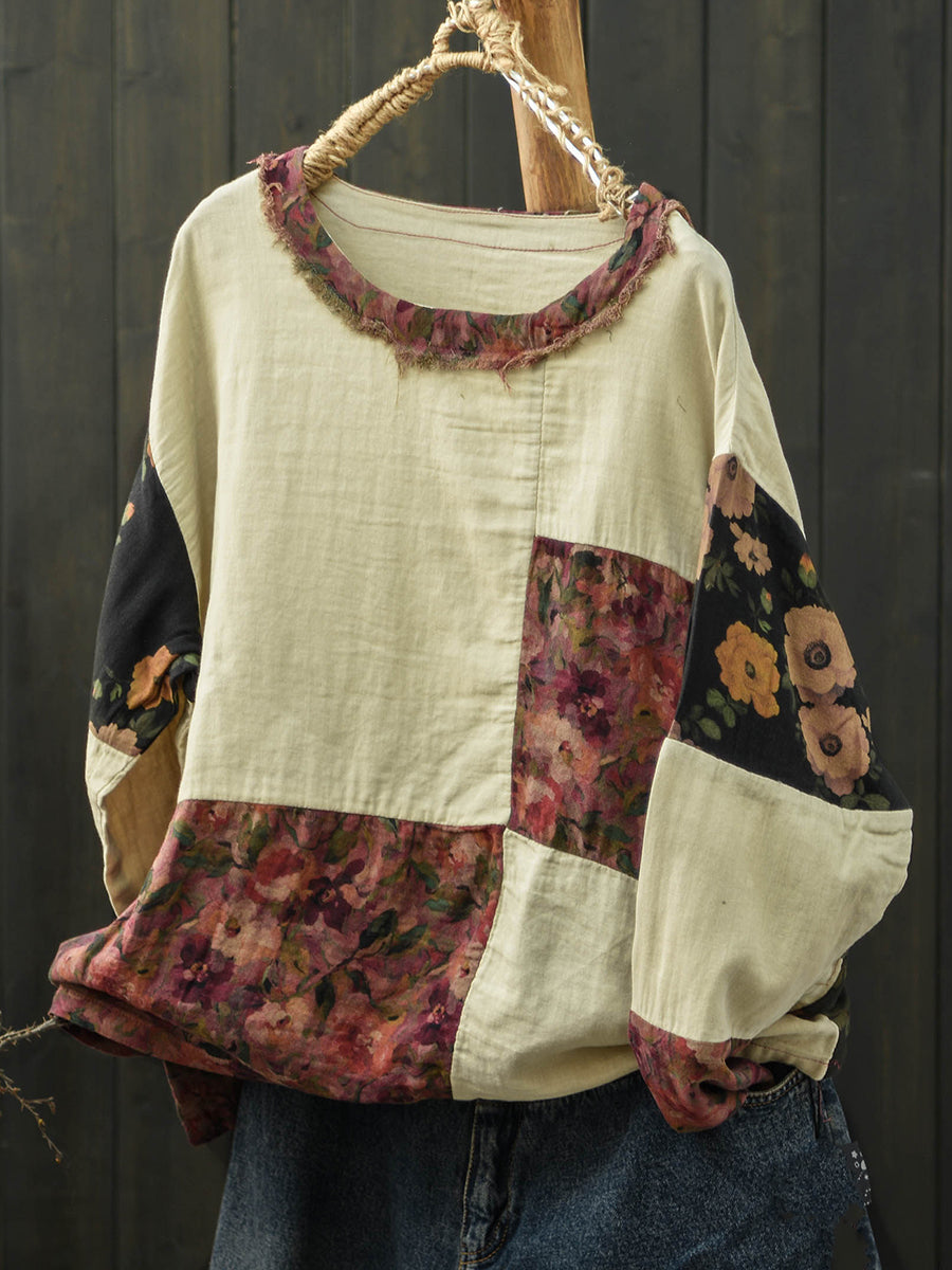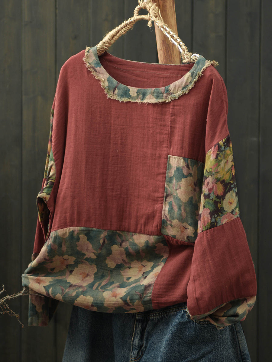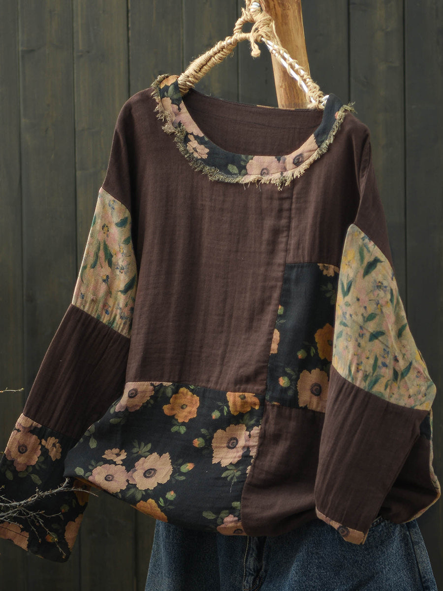 Camisa feminina de algodão com estampa floral retrô para a primavera