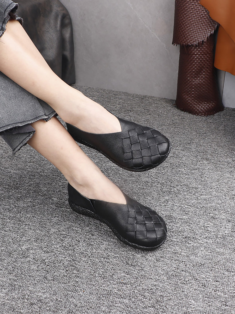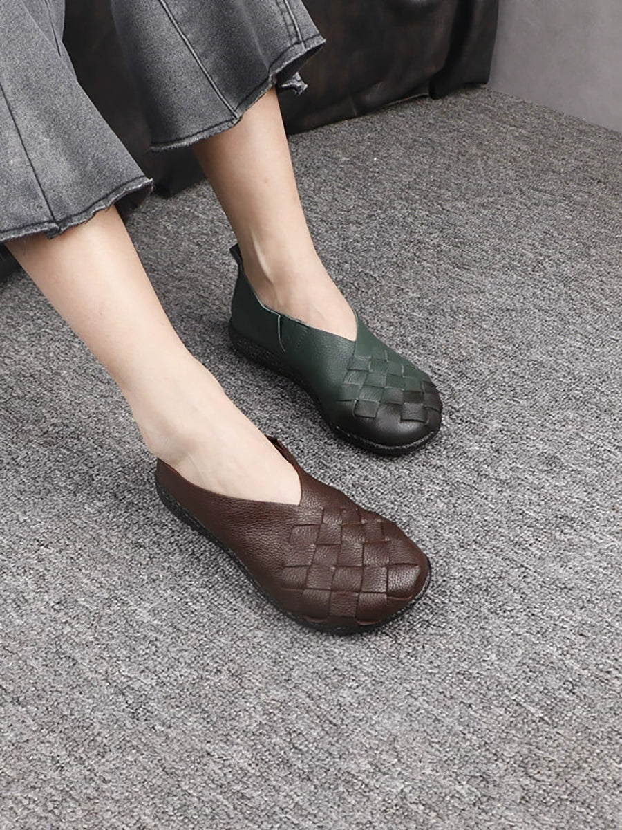 Sapatos femininos retrô de primavera em couro legítimo trançado, estilo rasteiro.