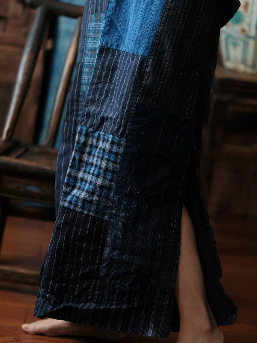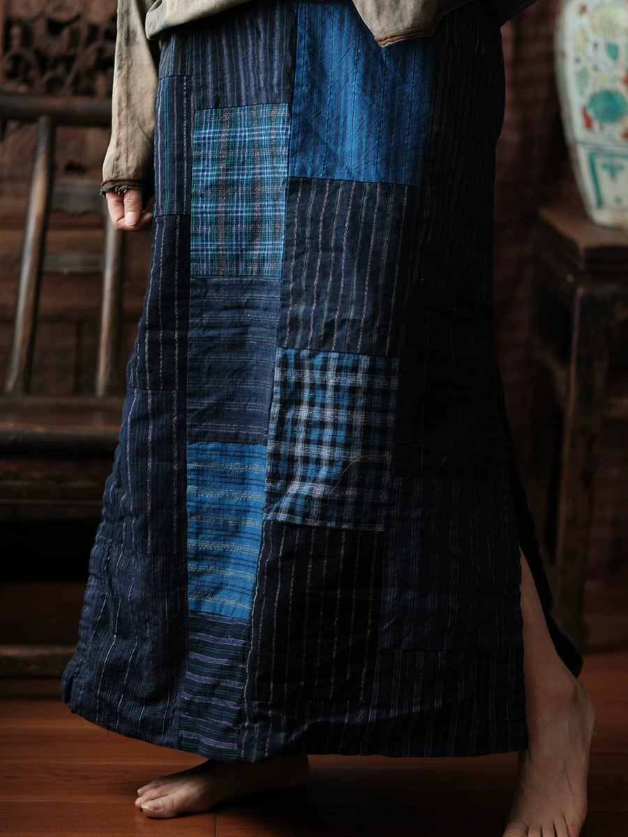 Saia feminina de algodão com estampa patchwork retrô e barra com fenda para a primavera.