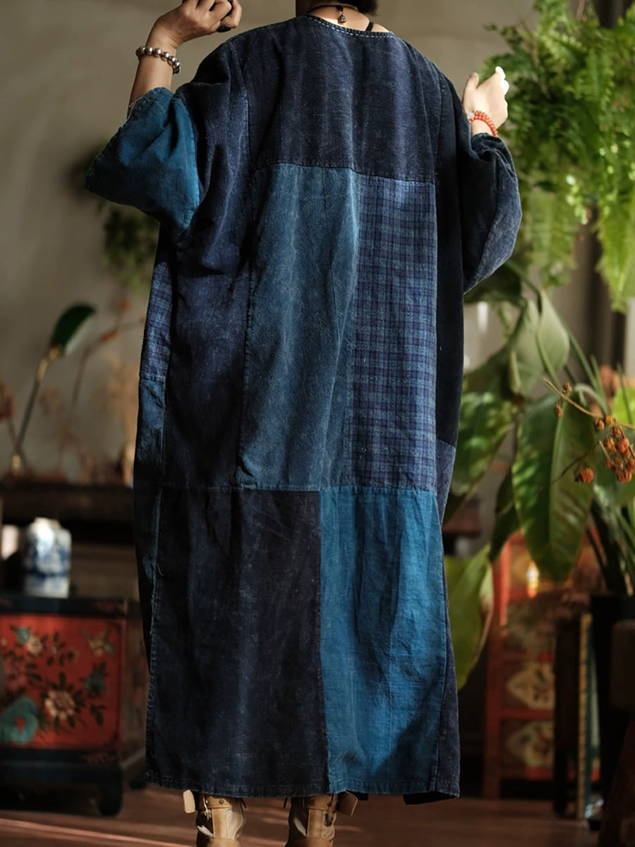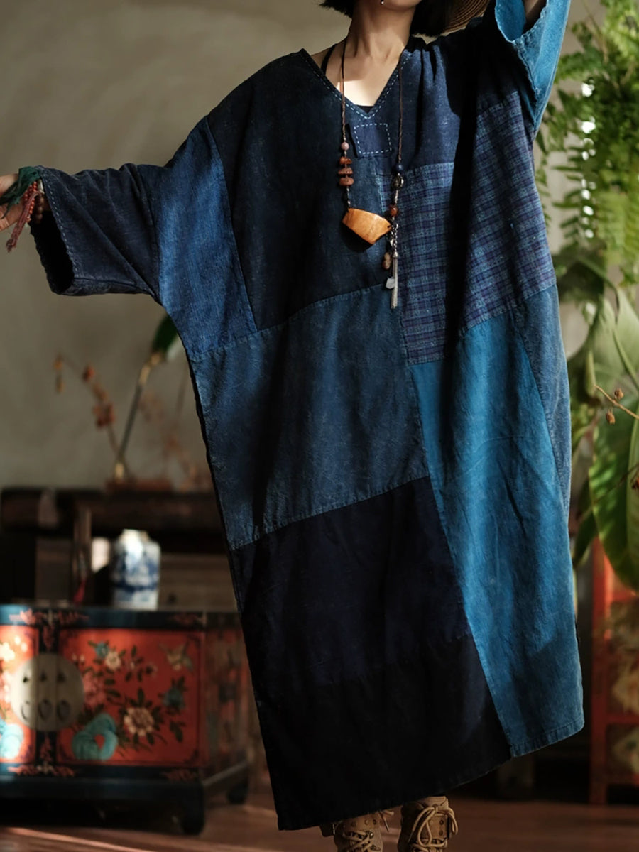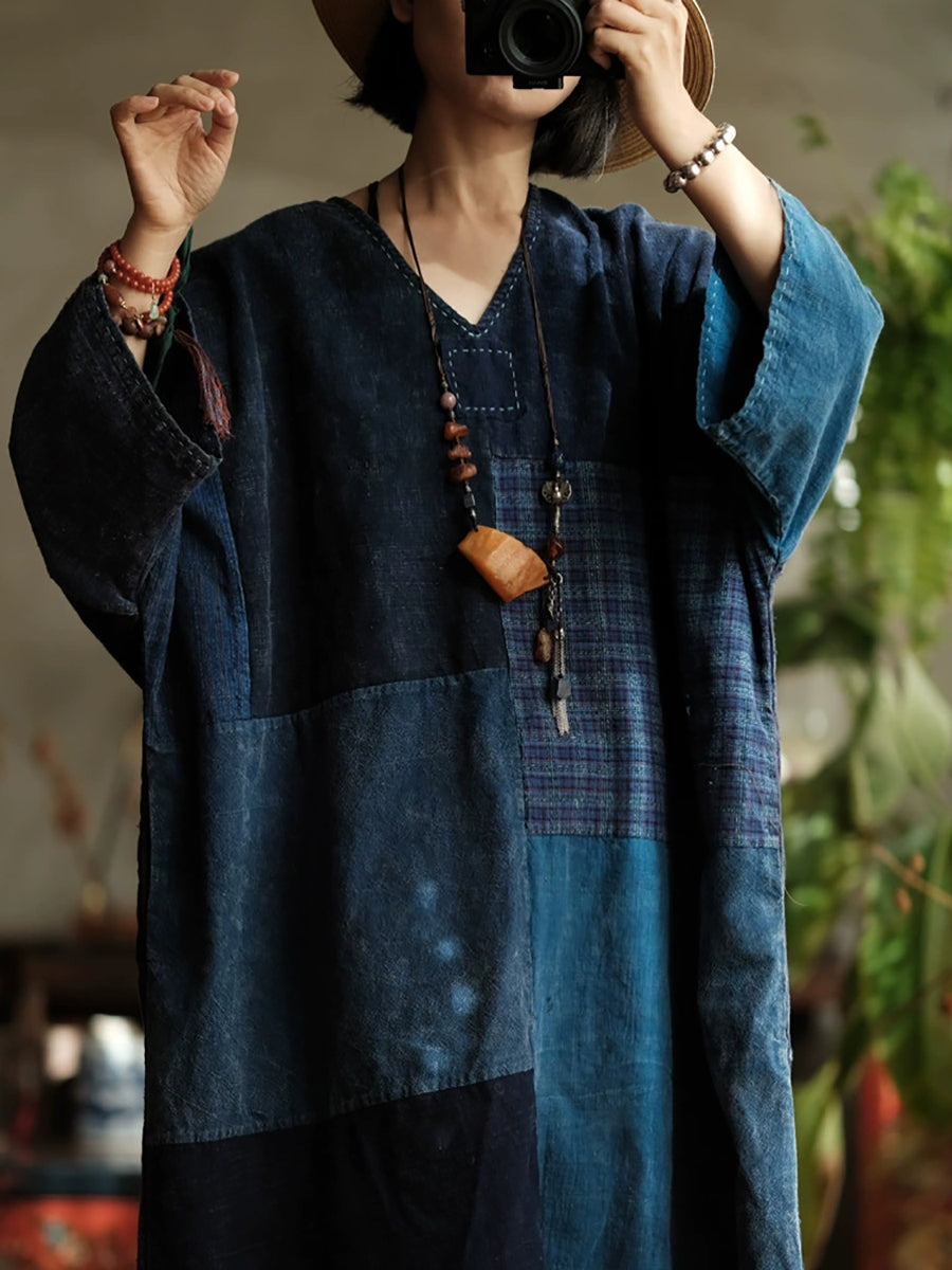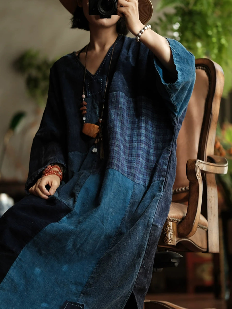 Vestido feminino de algodão com decote em V e patchwork retrô para a primavera