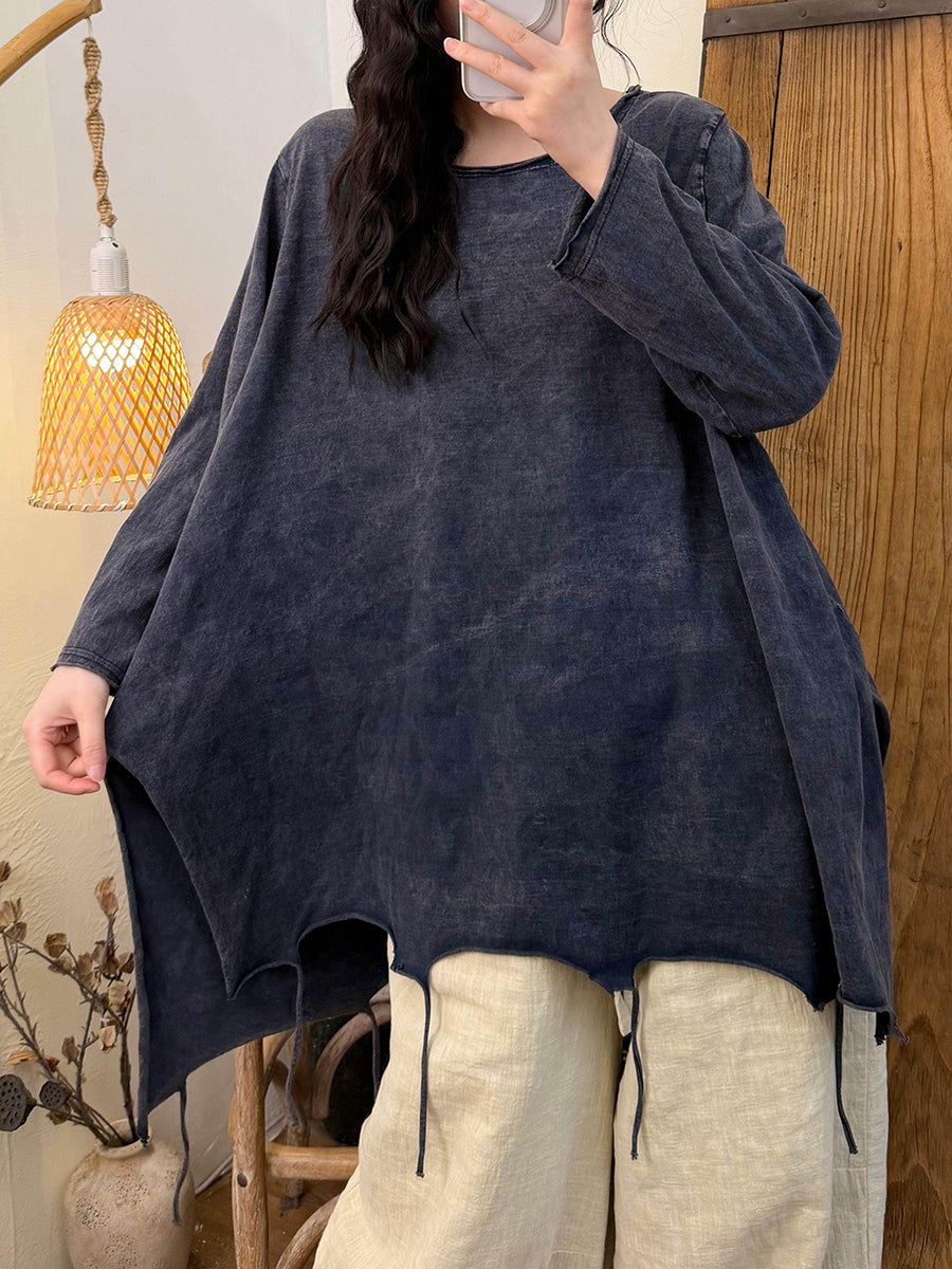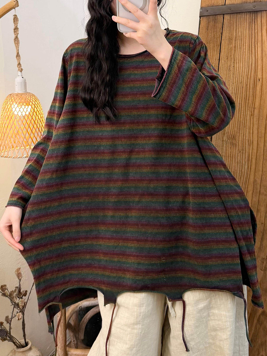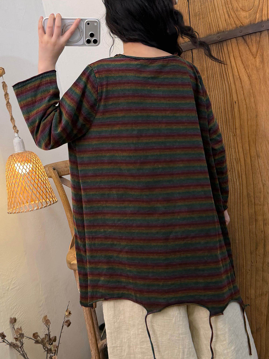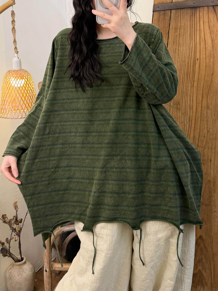 Blusa feminina de algodão com listras retrô e barra com franjas, decote redondo, estilo primavera.