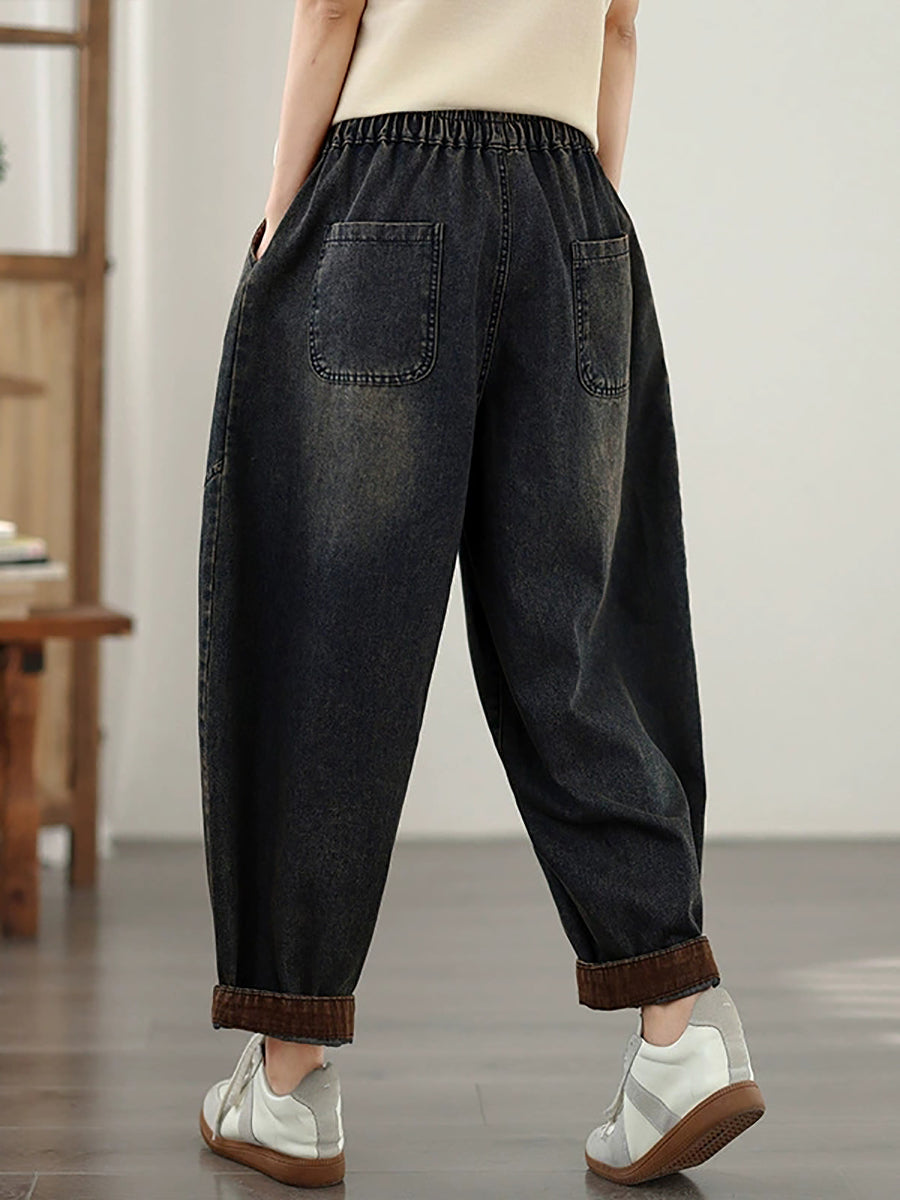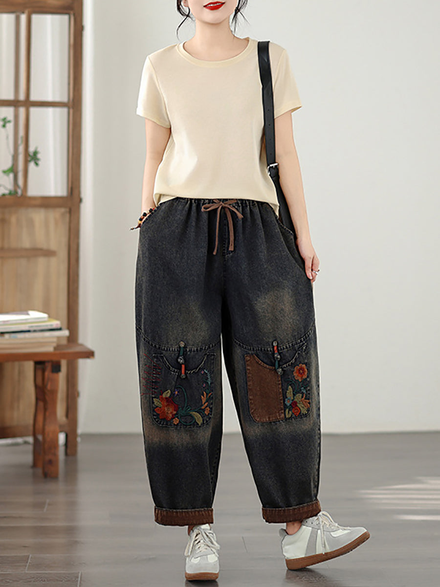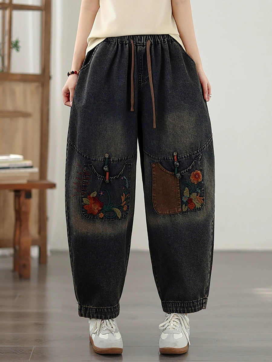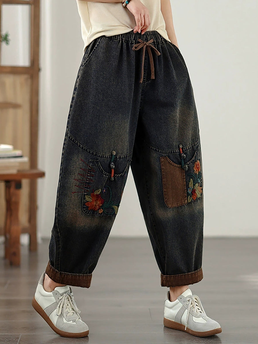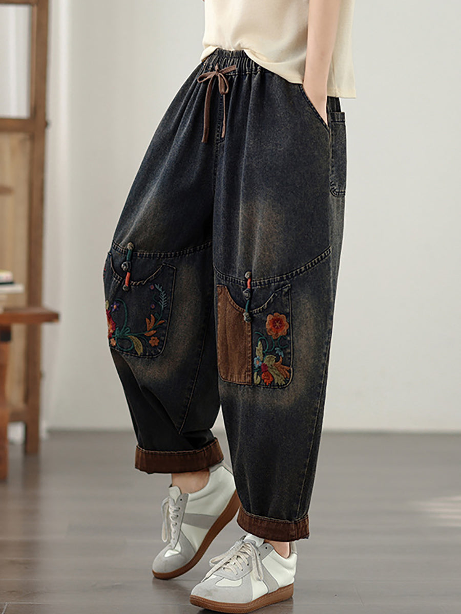 Calça Harem Feminina Vintage de Primavera em Jeans com Bordados e Patchwork