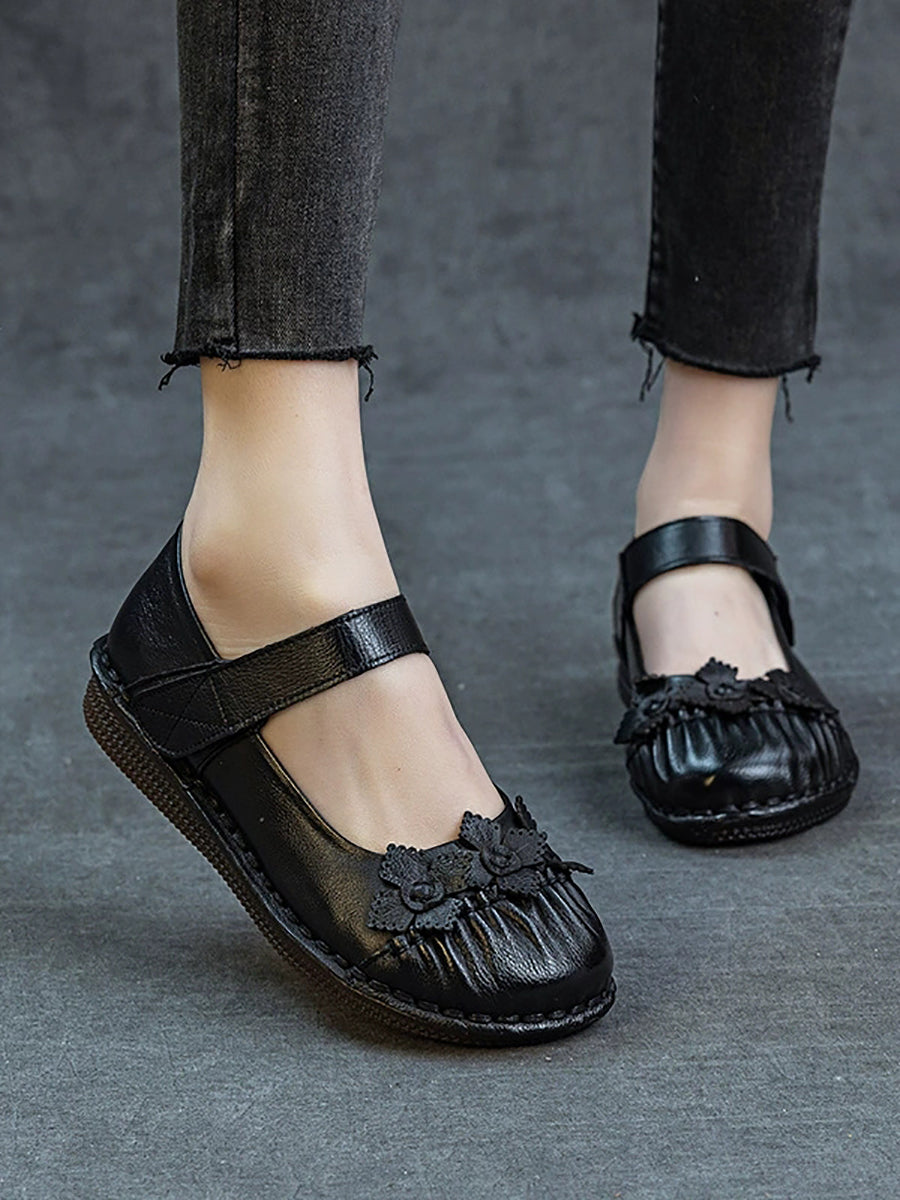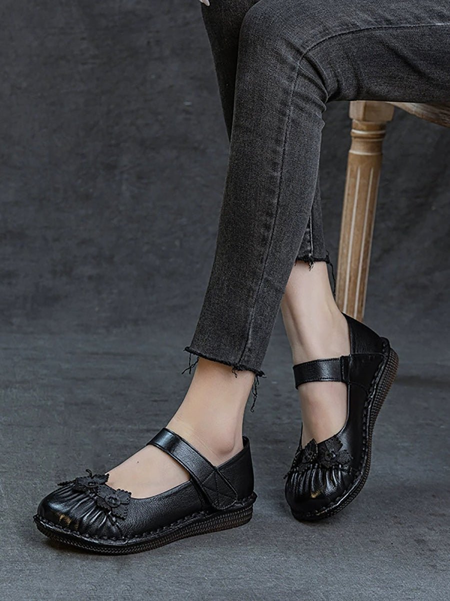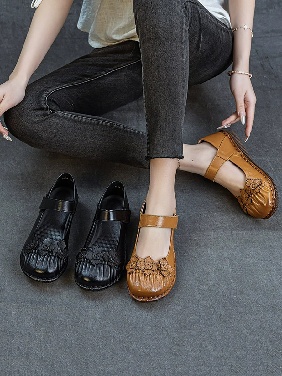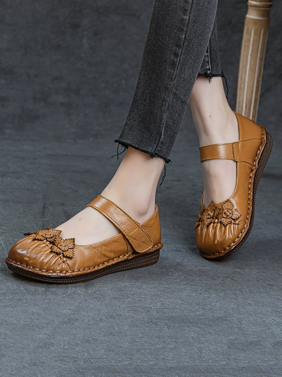 Sapatos femininos de primavera vintage com estampa floral e sapatos baixos de couro.
