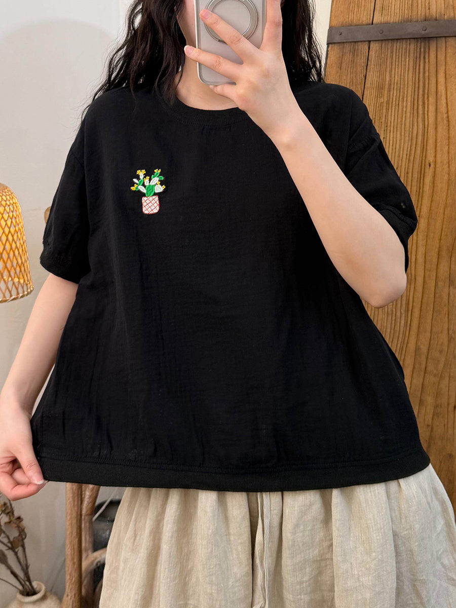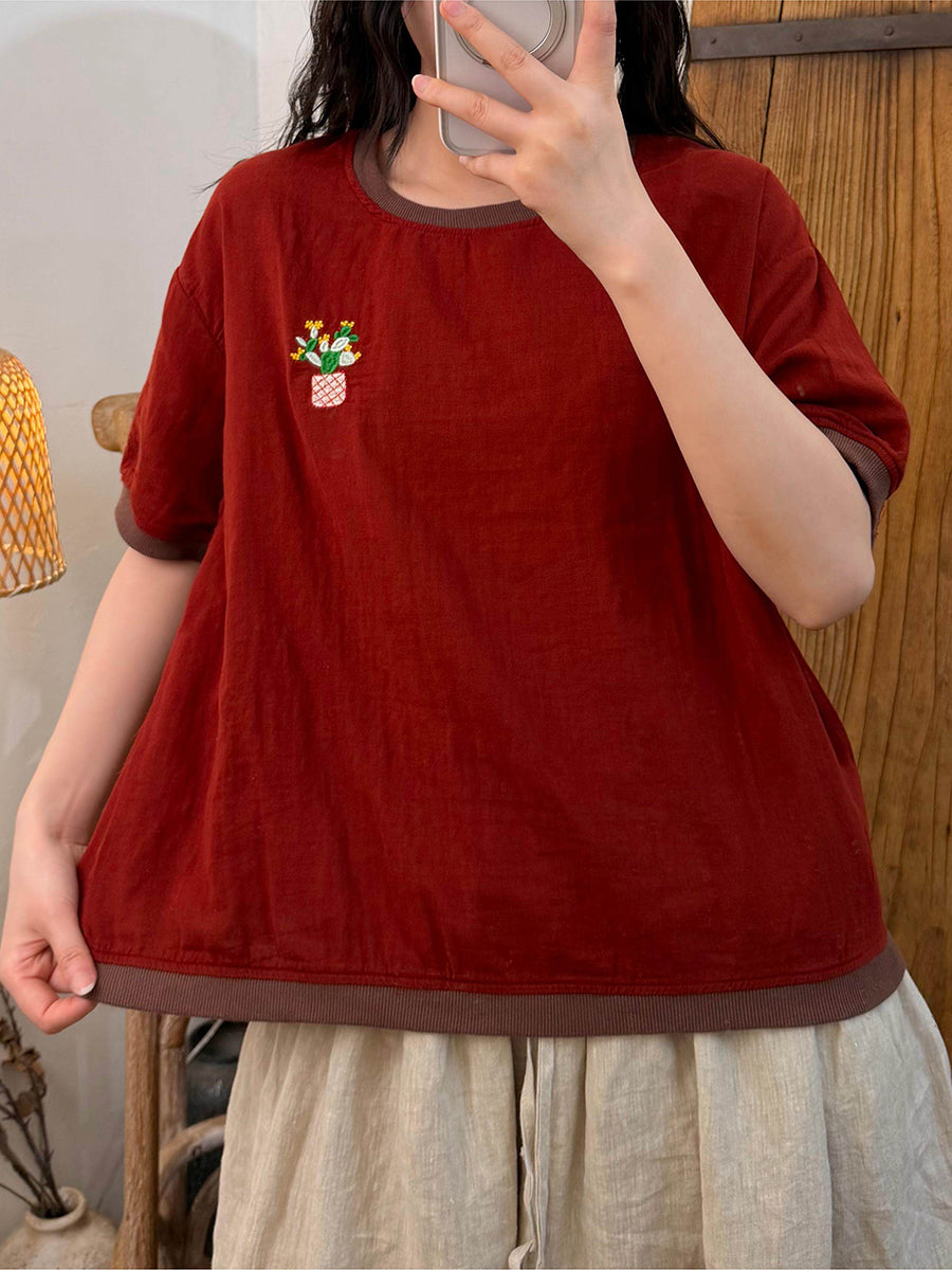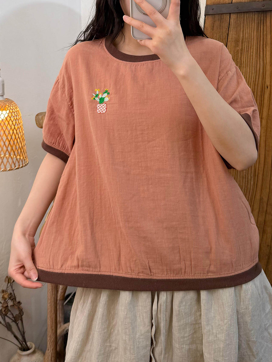 Camiseta feminina de verão com estampa artística em blocos de cores, em algodão e gola redonda.