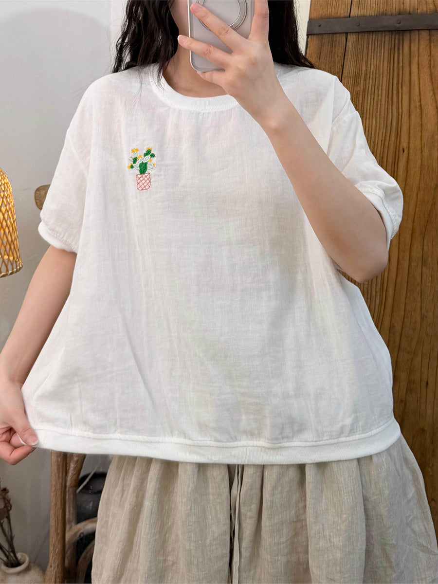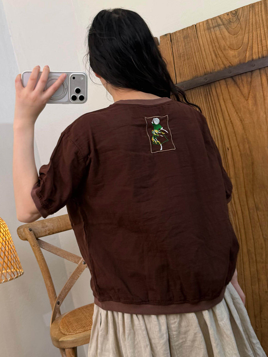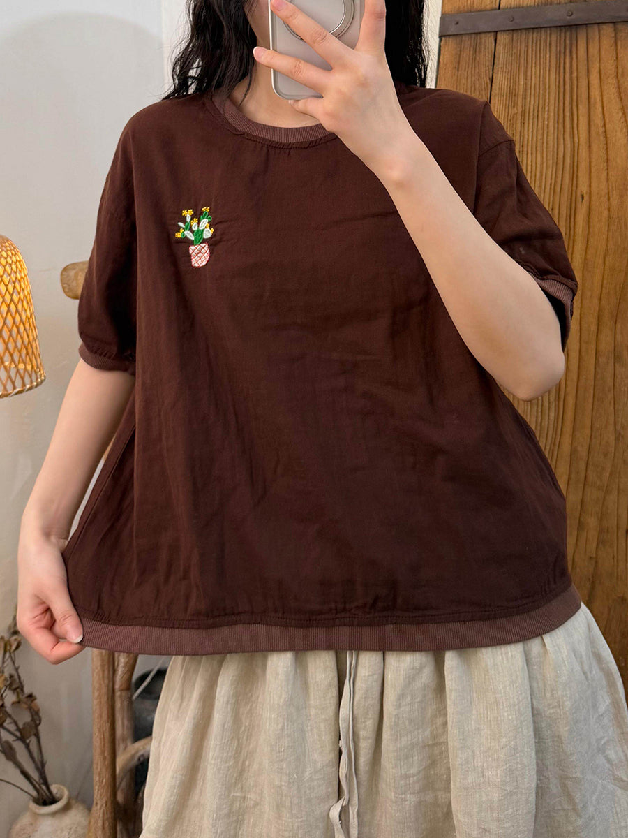 Camiseta feminina de verão com estampa artística em blocos de cores, em algodão e gola redonda.