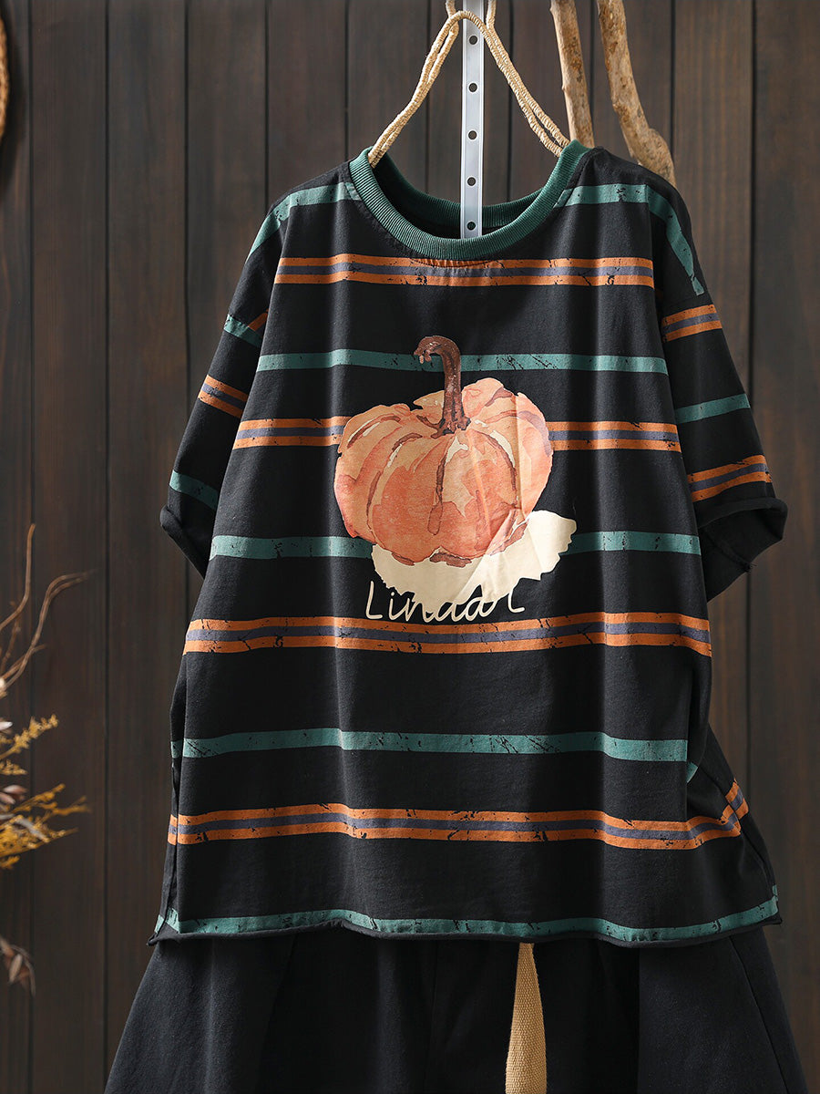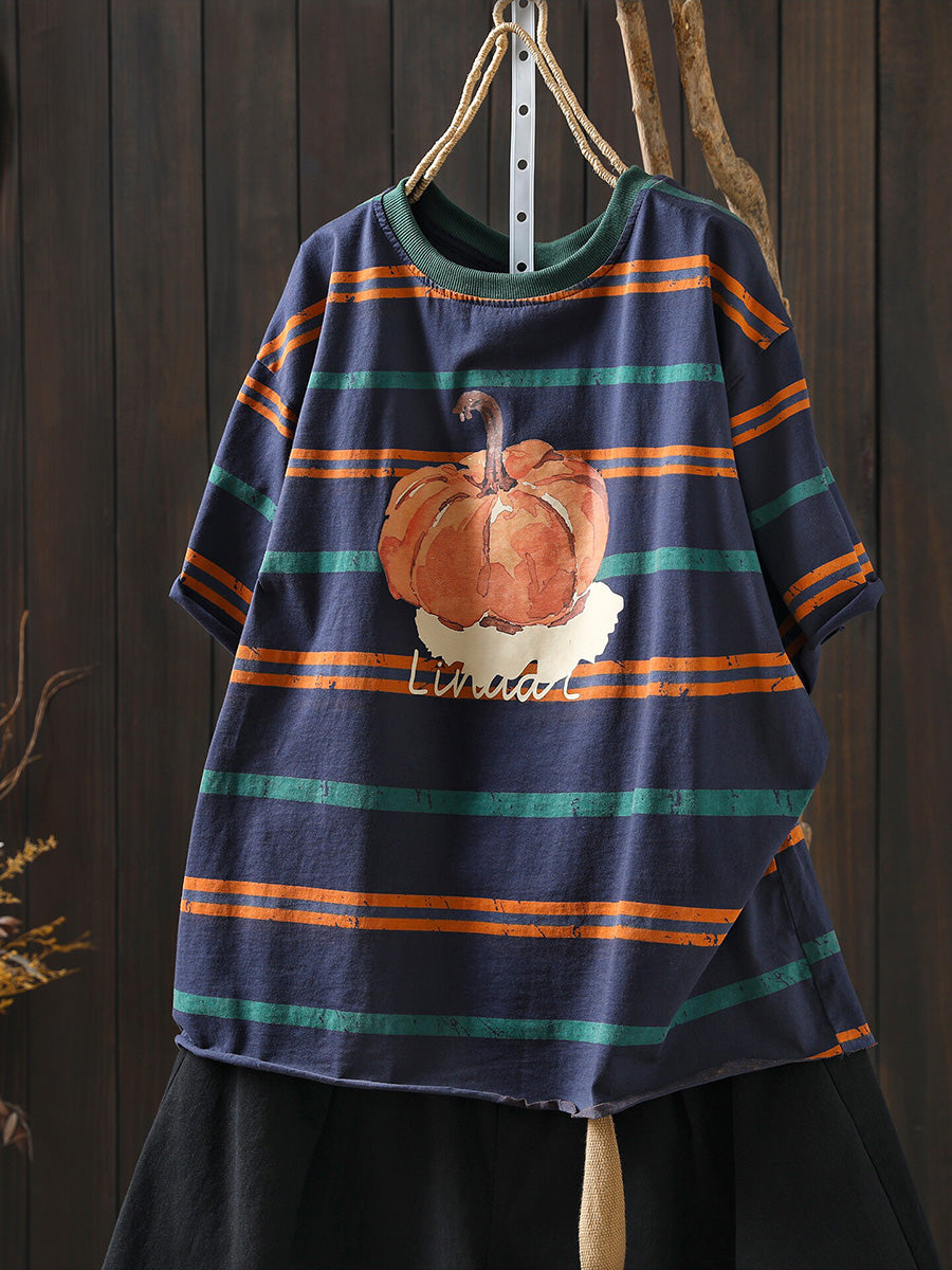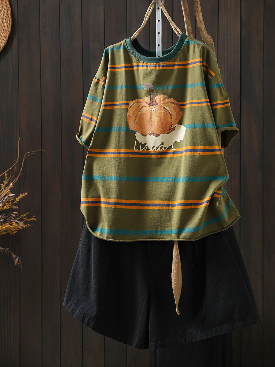 Camisa feminina de verão com estampa artística de abóboras e listras, gola redonda, em algodão.