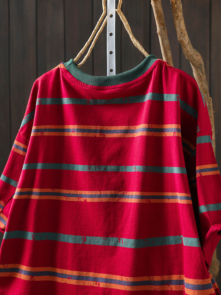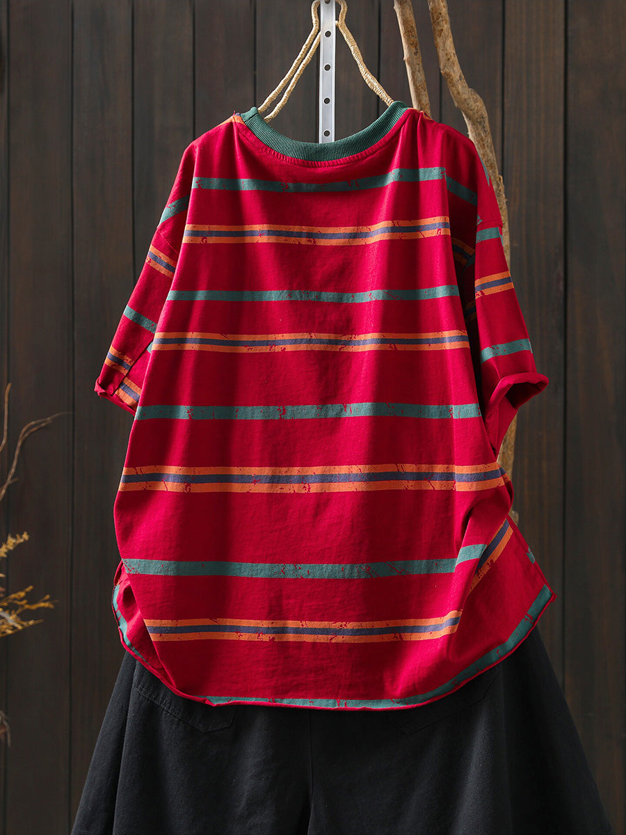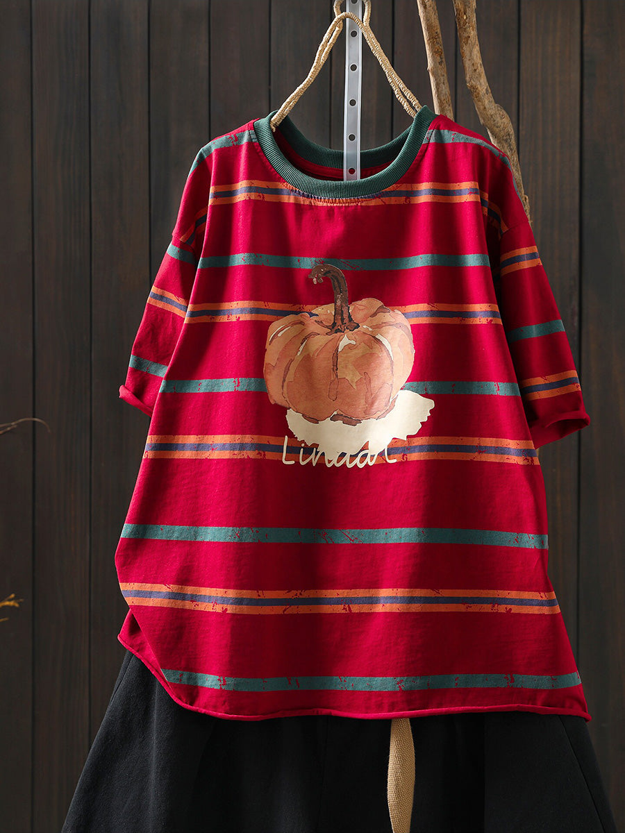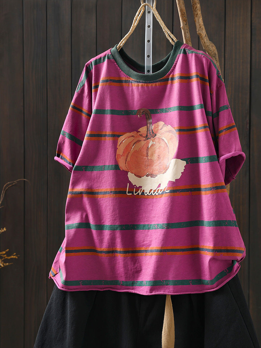 Camisa feminina de verão com estampa artística de abóboras e listras, gola redonda, em algodão.
