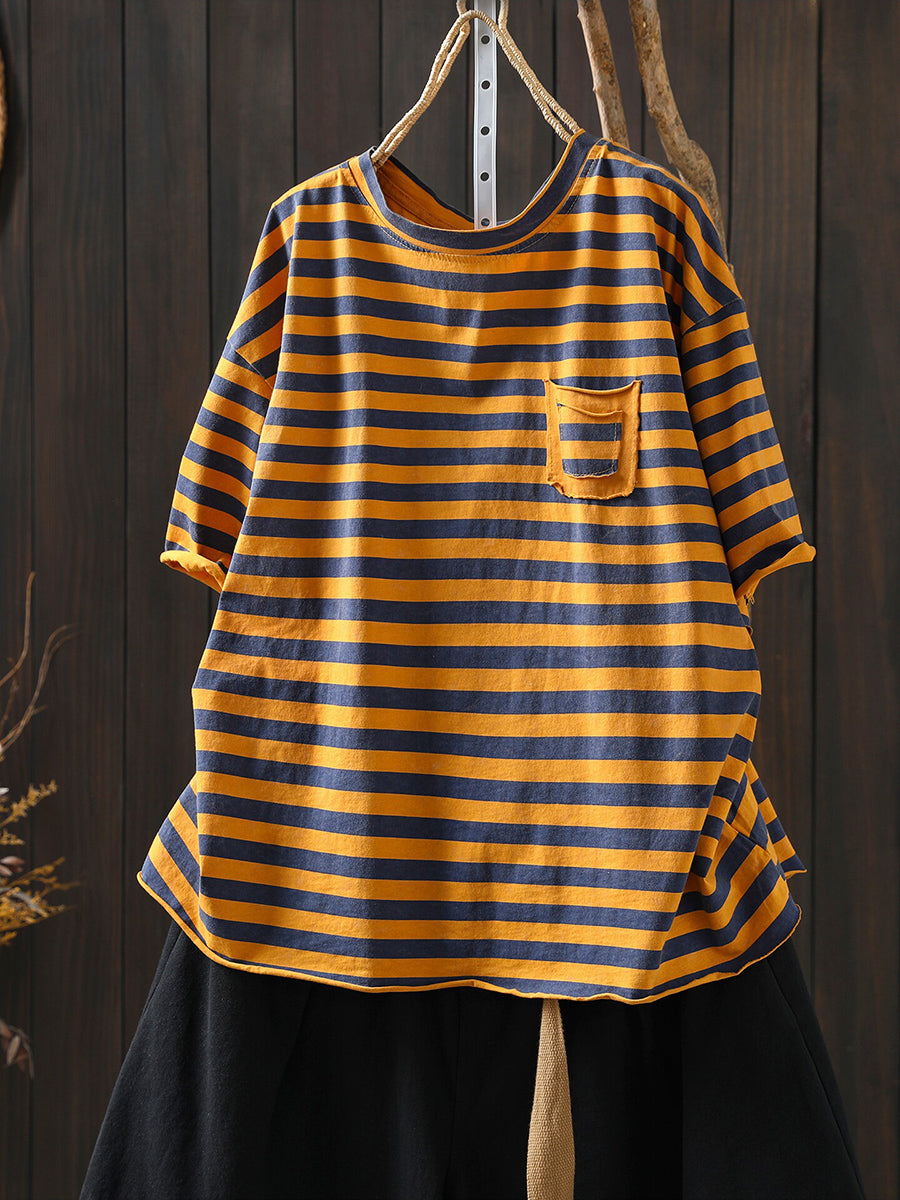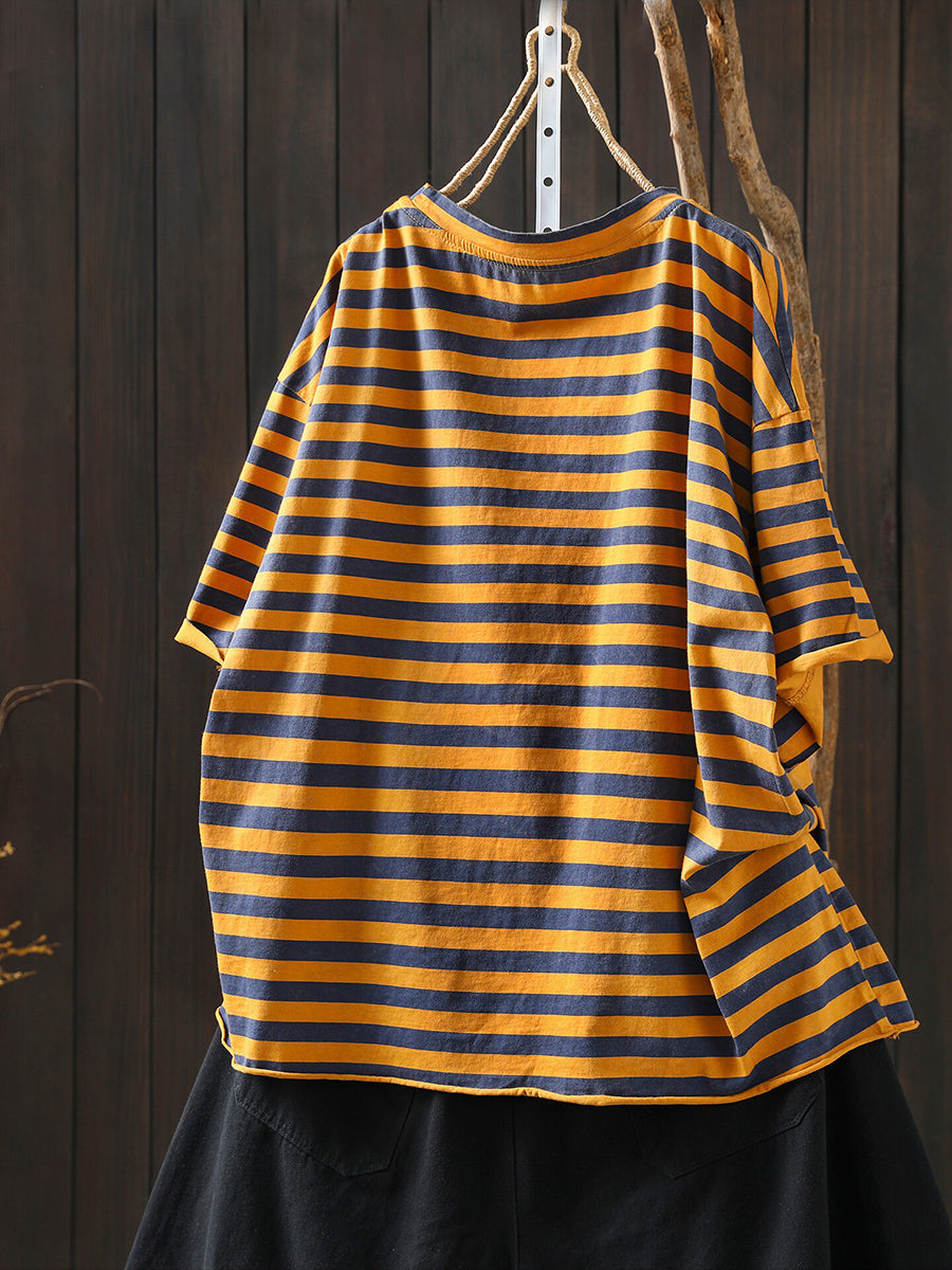 Camisa feminina de verão com estampa artística de listras em algodão e gola redonda
