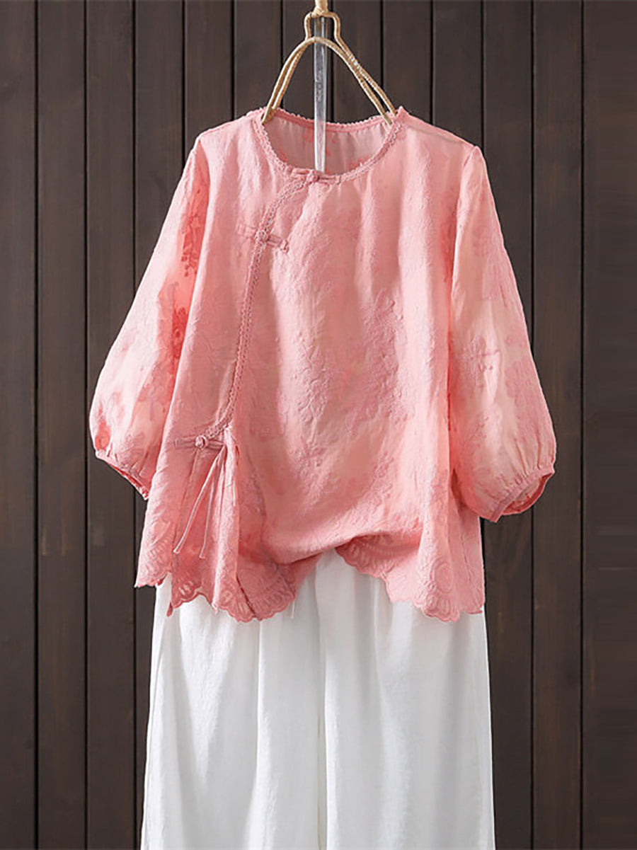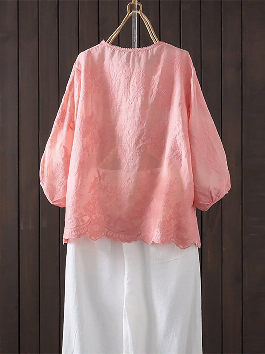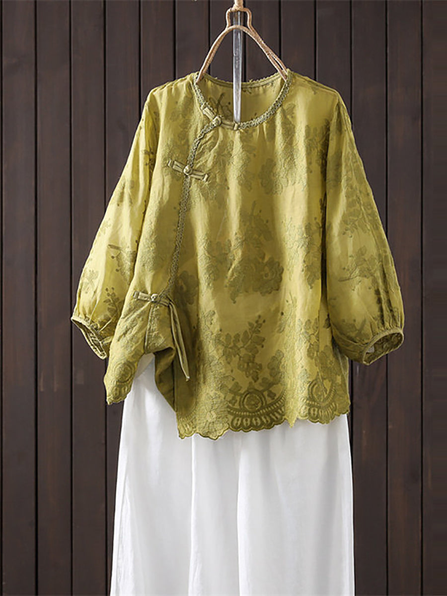 Blusa feminina de verão com bordado artístico, 100% rami, gola redonda.