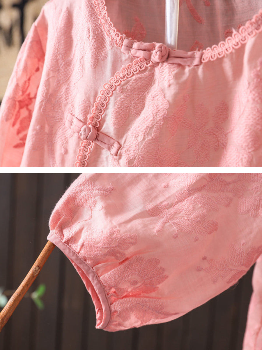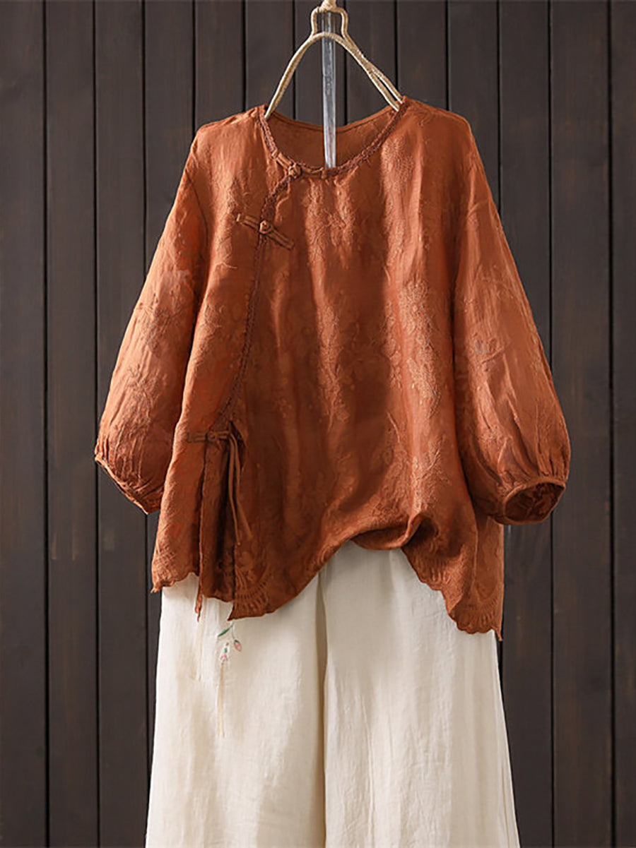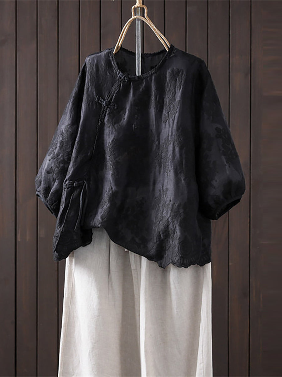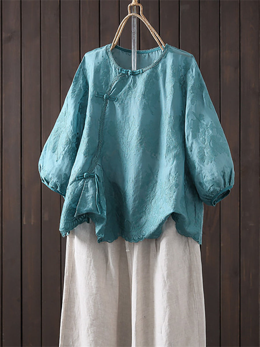 Blusa feminina de verão com bordado artístico, 100% rami, gola redonda.