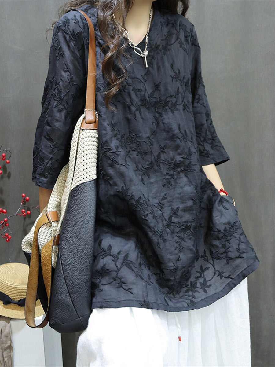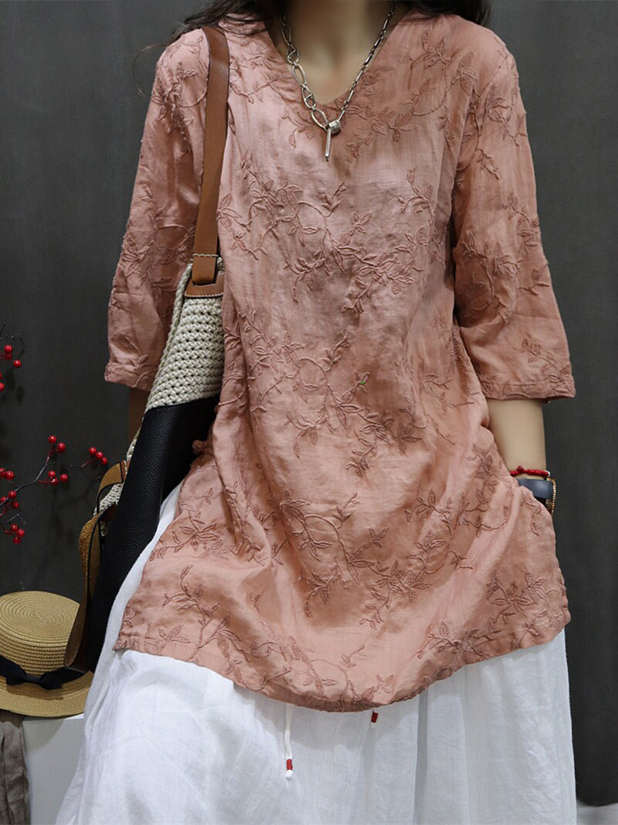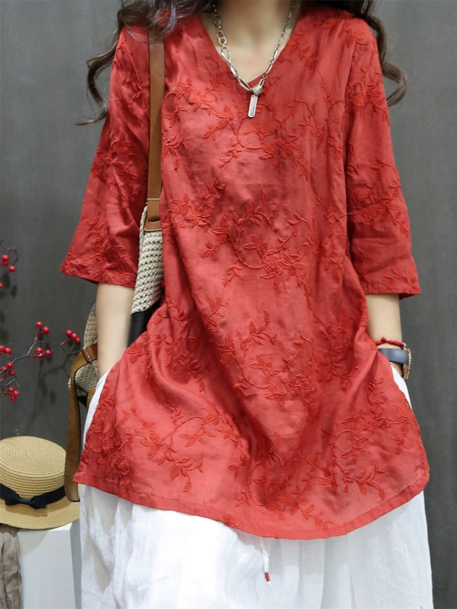 Blusa feminina de verão com bordado artístico, 100% rami, decote em V.
